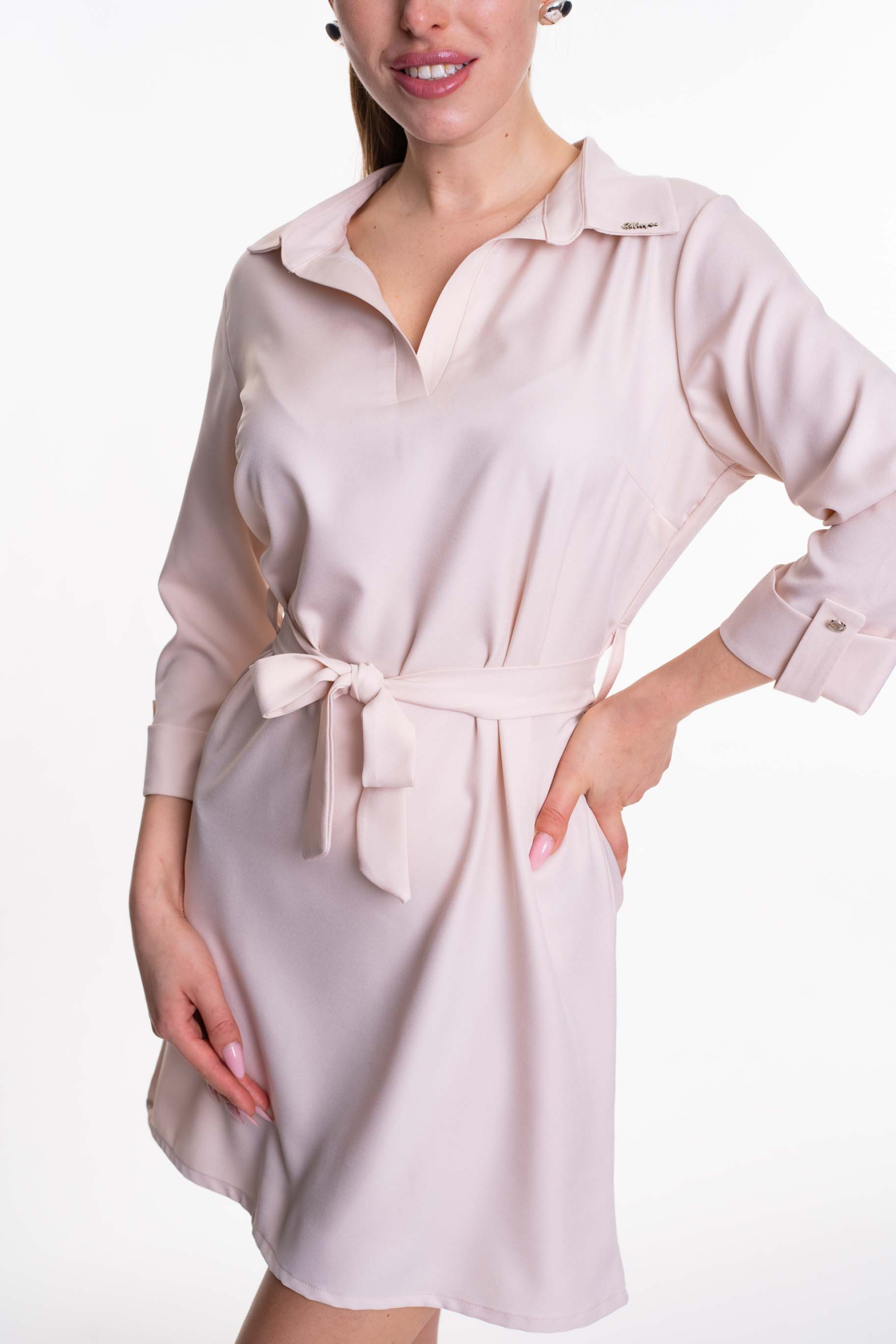 Enyhén elasztikus anyagból készült lezser szabású ruha saját anyagából készült megkötővel, kis fém márkajelzéssel.