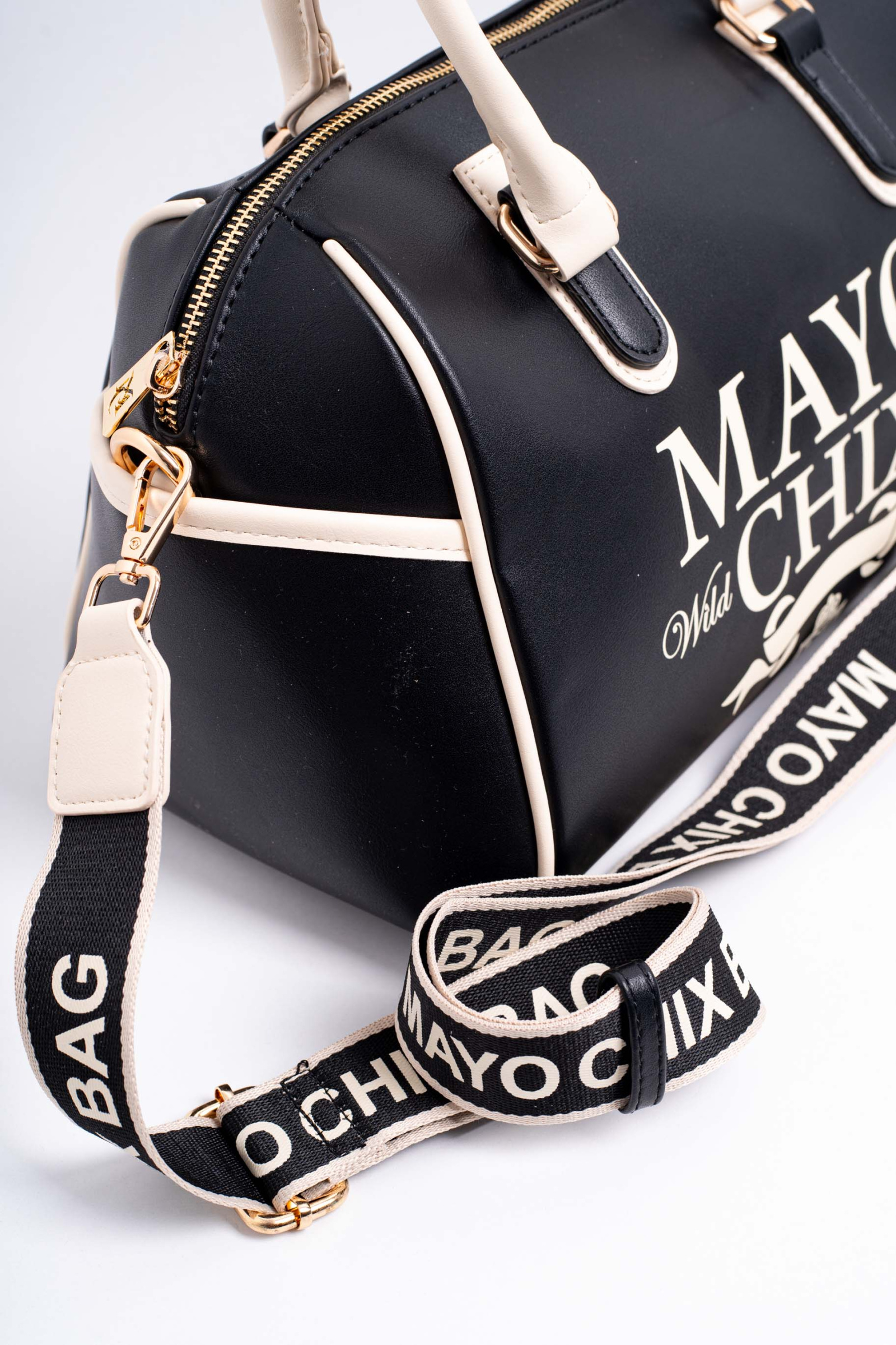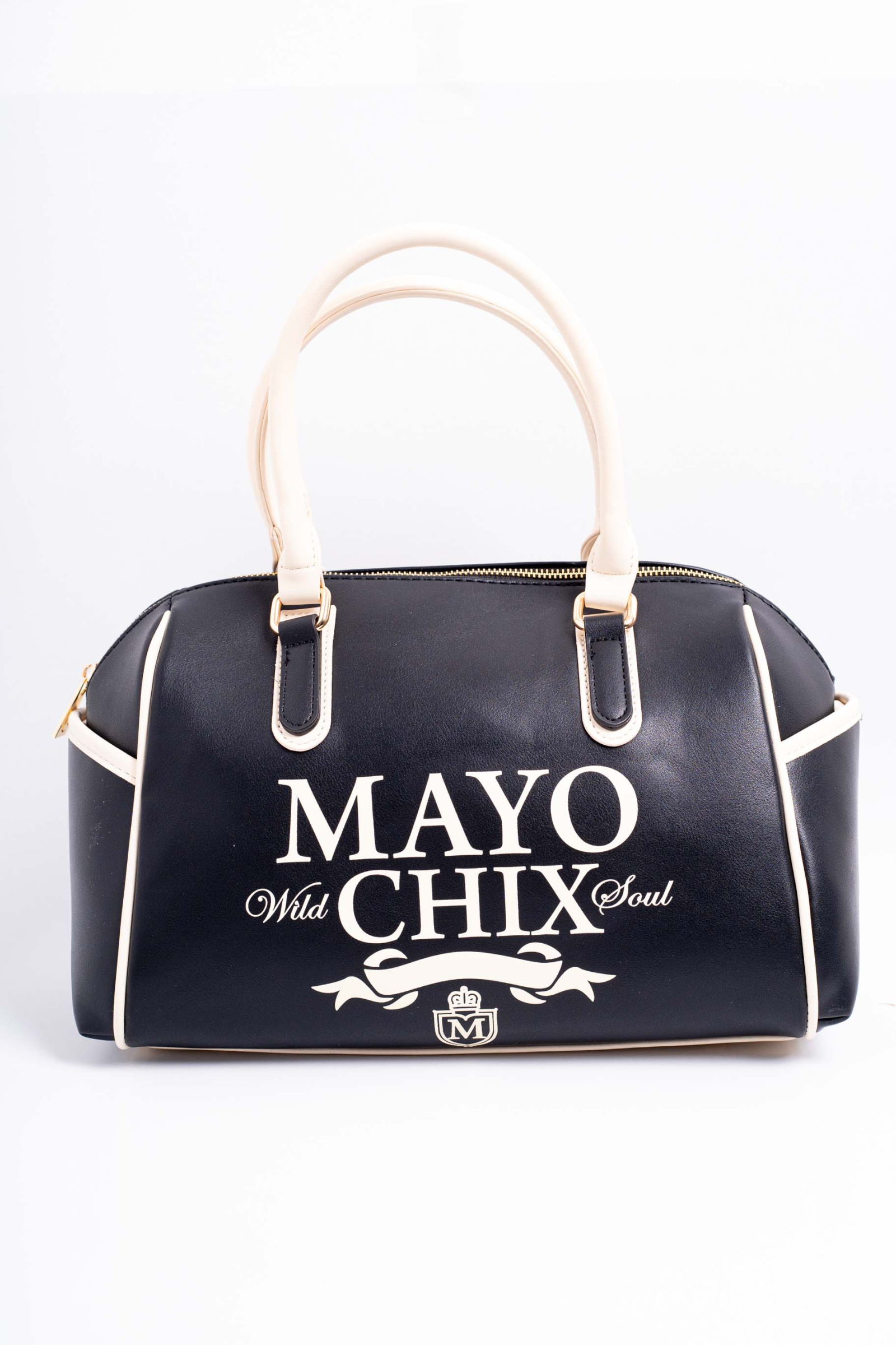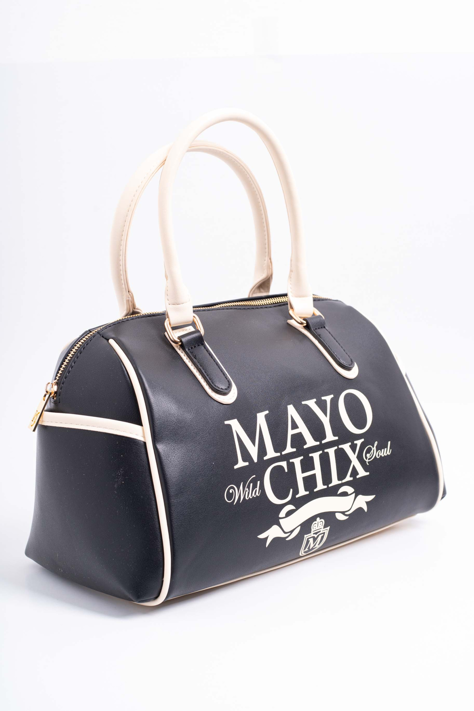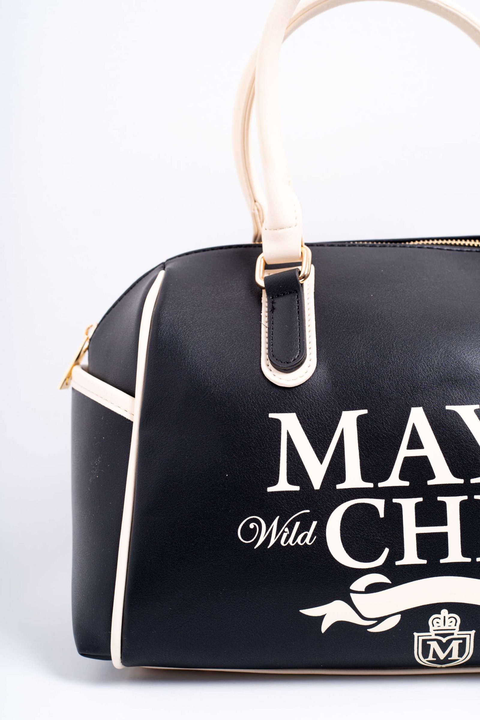 Közepes méretű, műbőrből készült kézitáska kiegészítő vállpánttal, egyterű belsőrésszel, cippzár záródással, film nyomott márkajelzéssel díszítve
