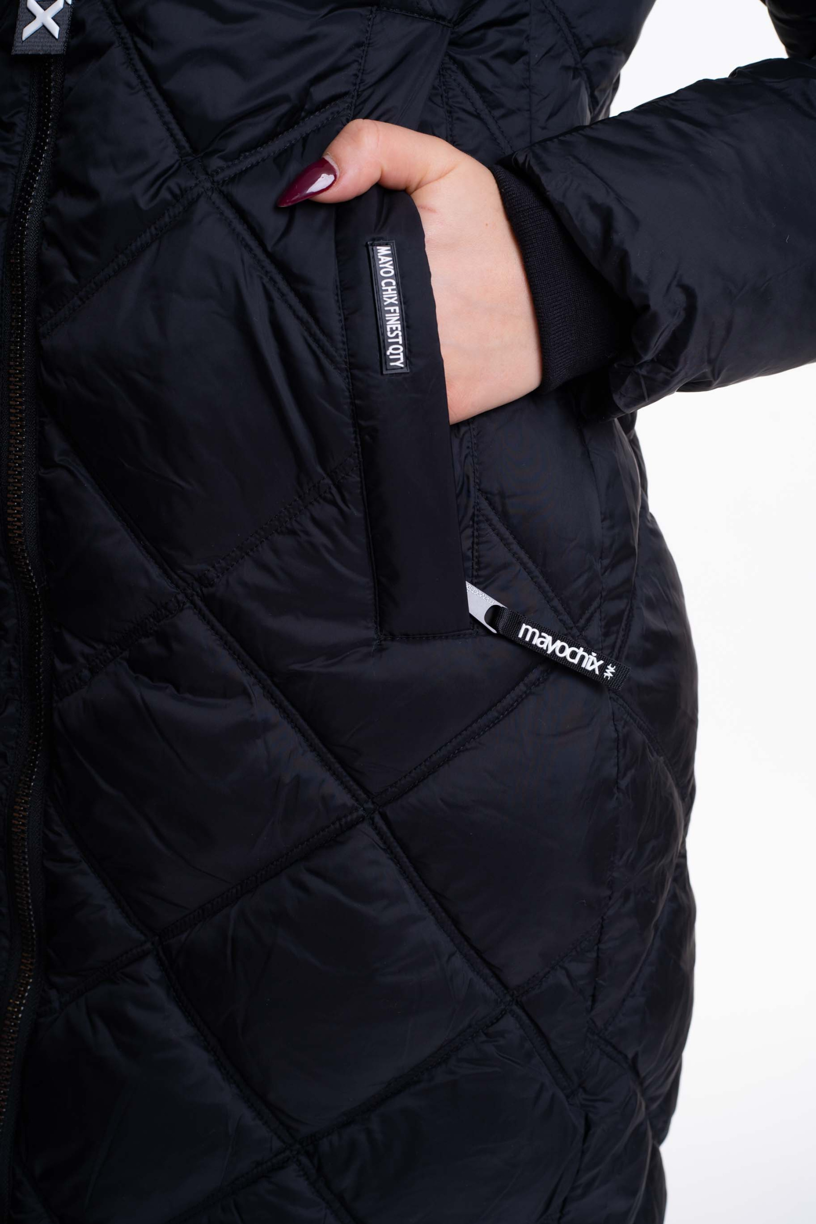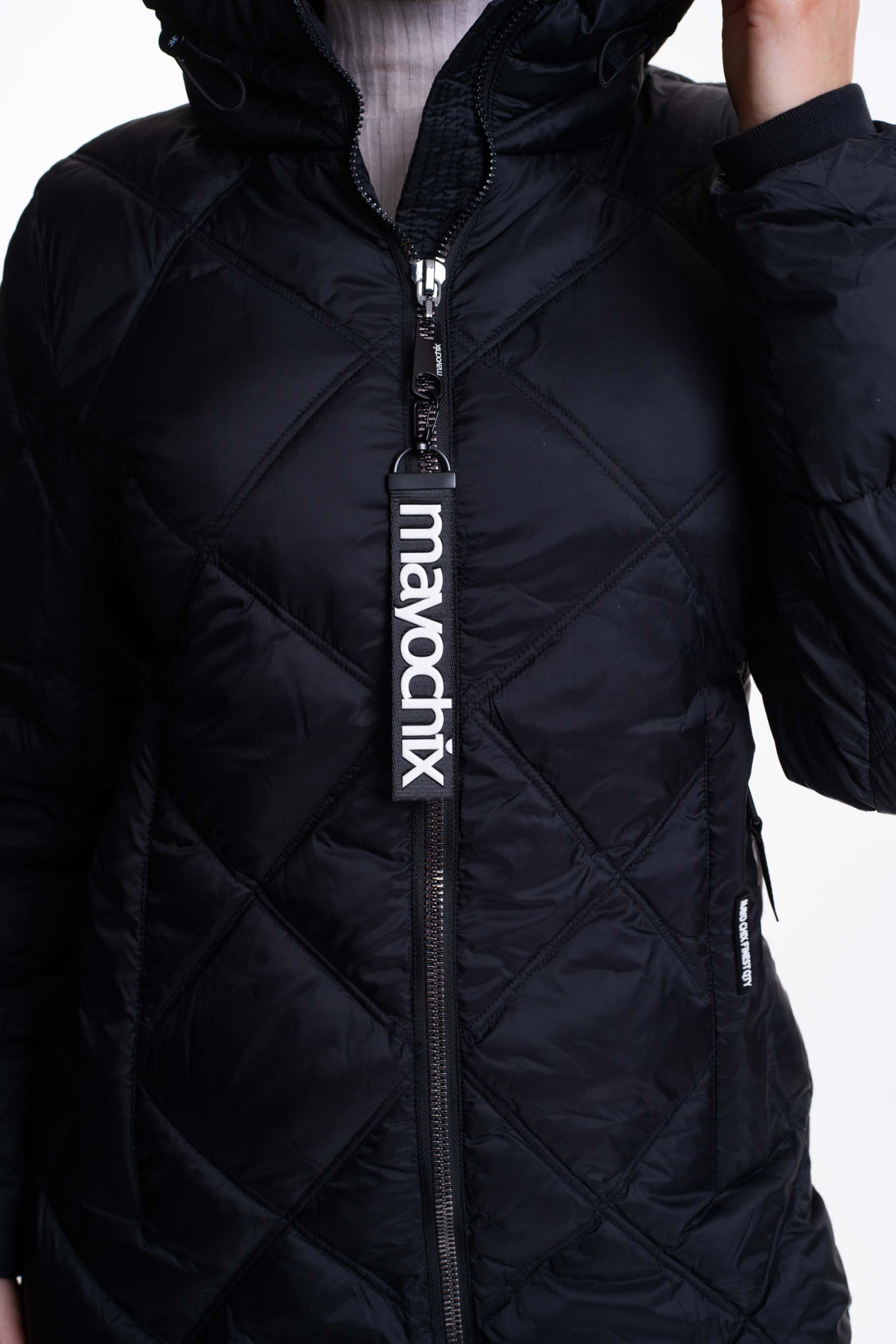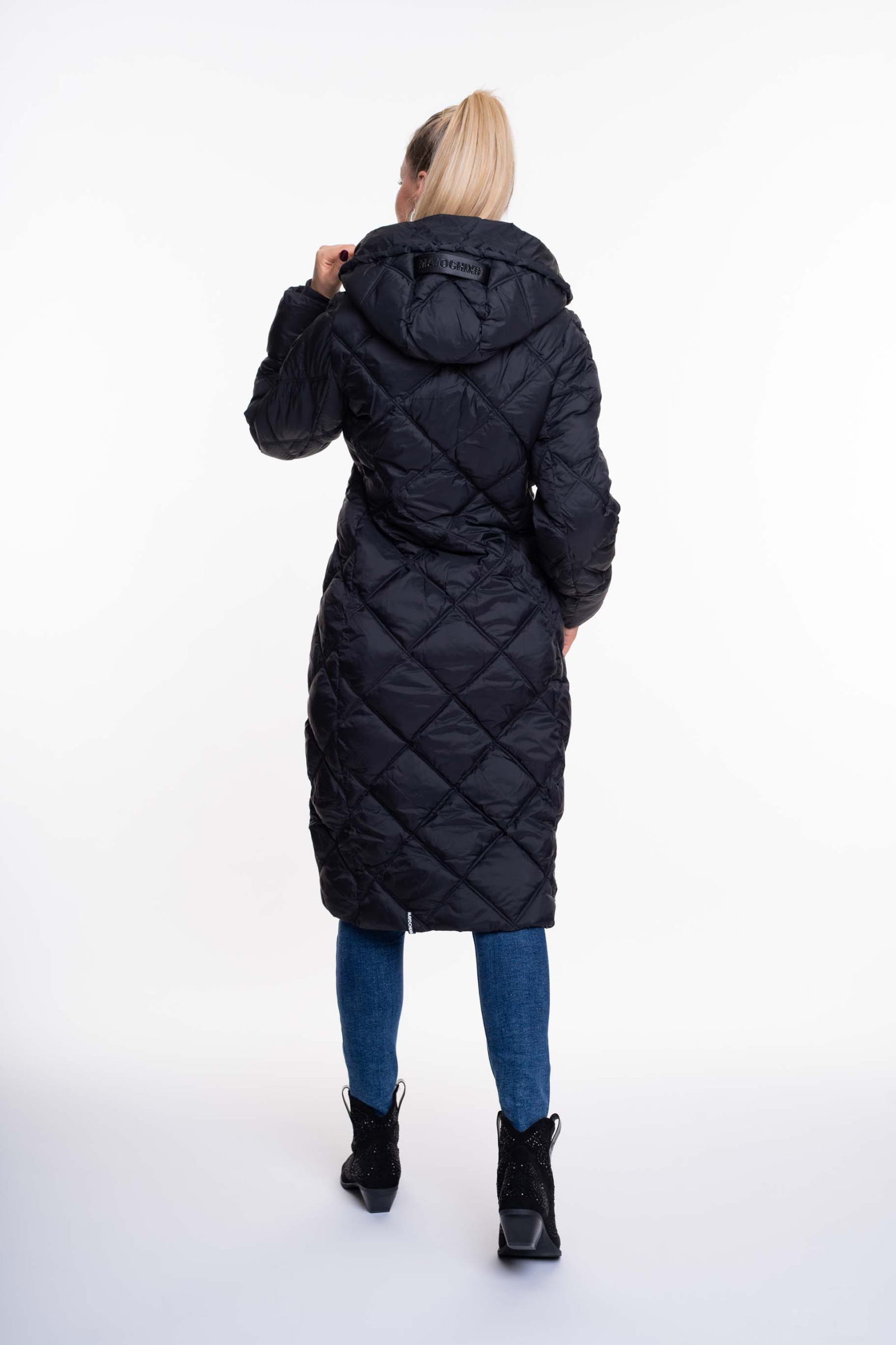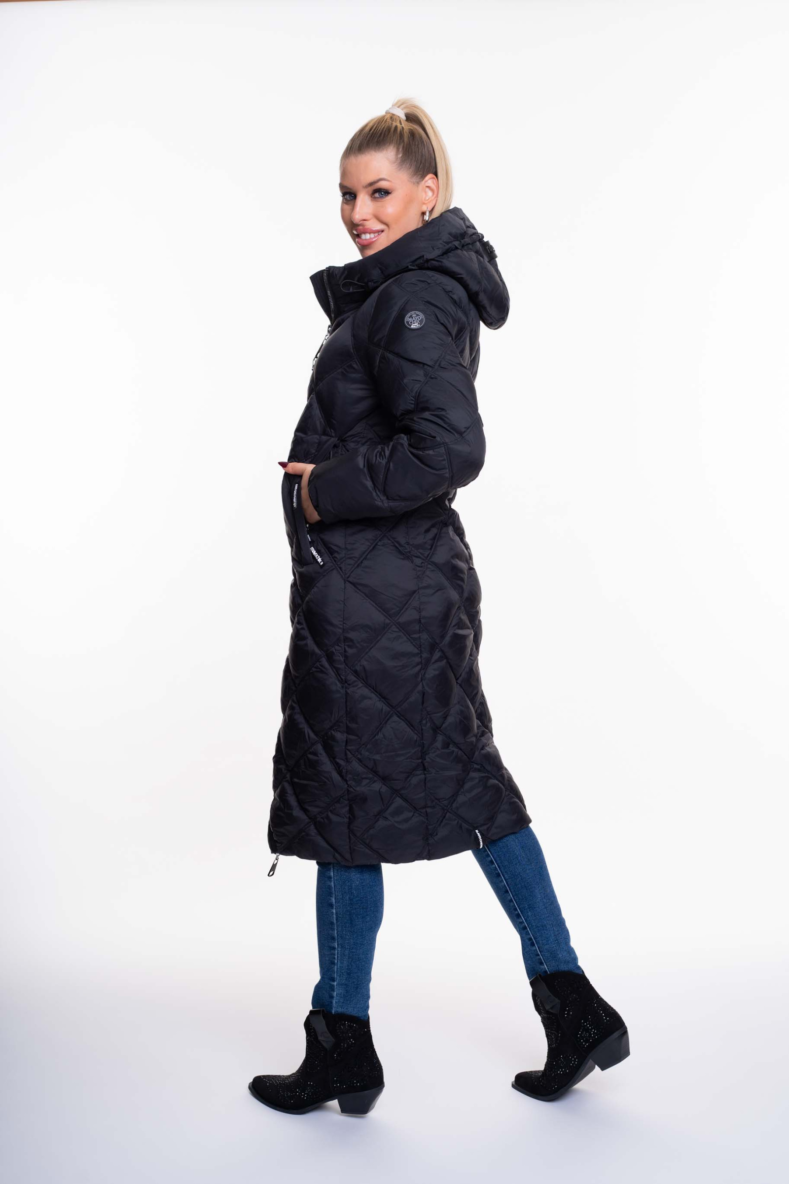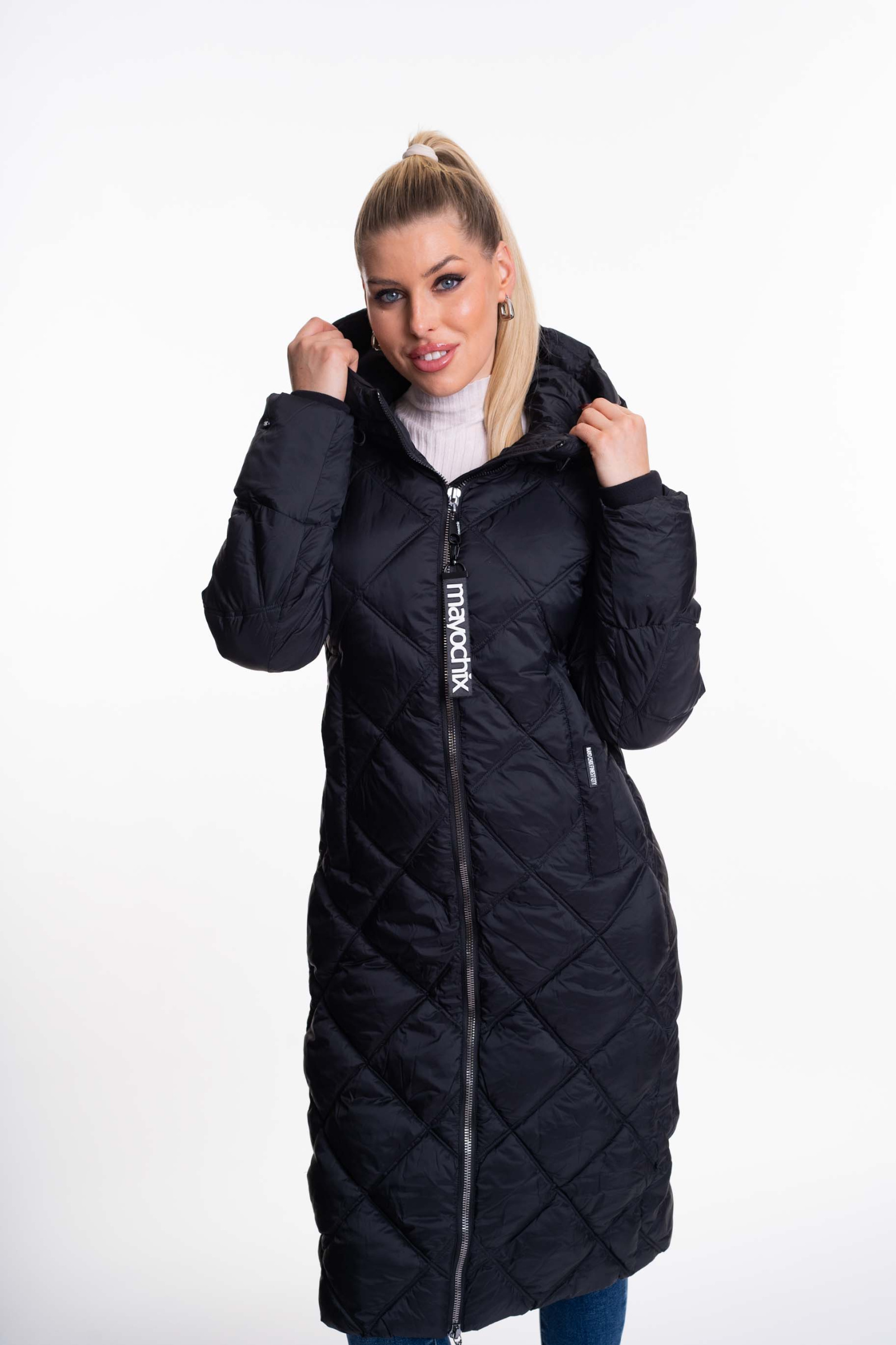 Karcsúsított, hosszú fazonú steppelt télikabát fix kapucnival, dupla kocsis cippzáras záródással, ujján applikált márkajelzéssel.