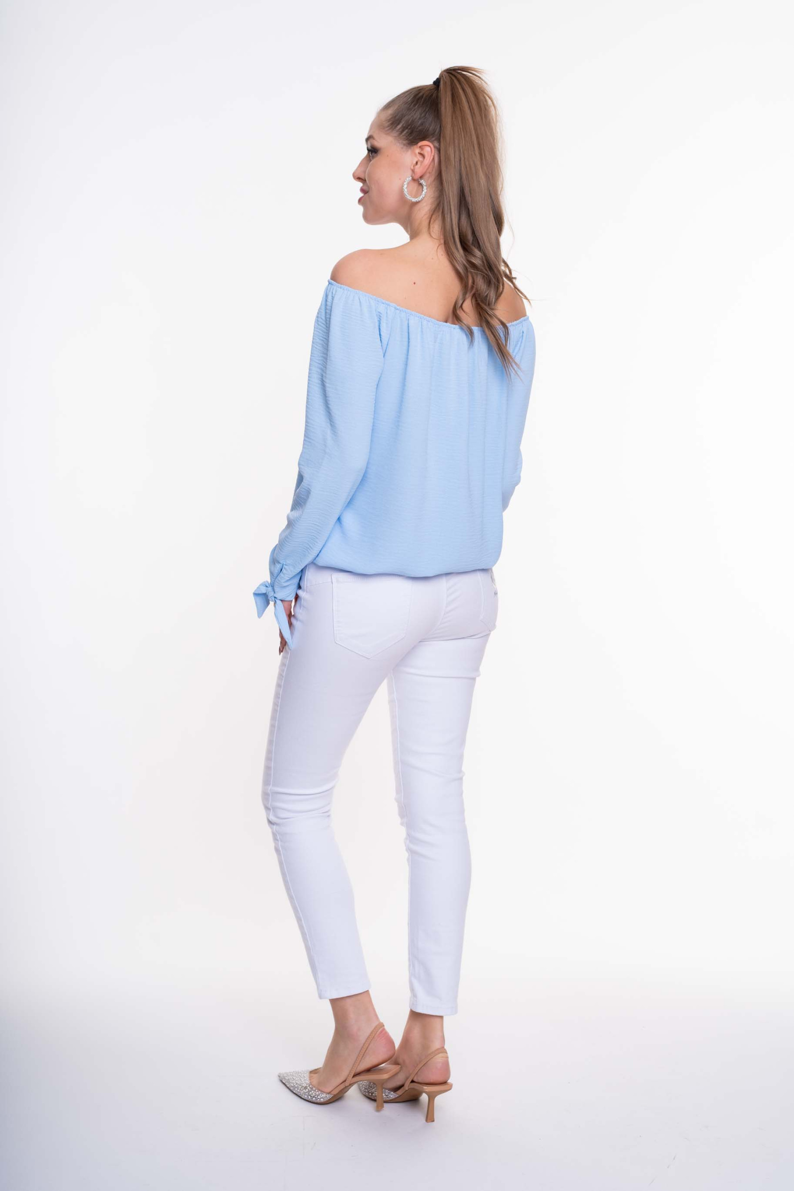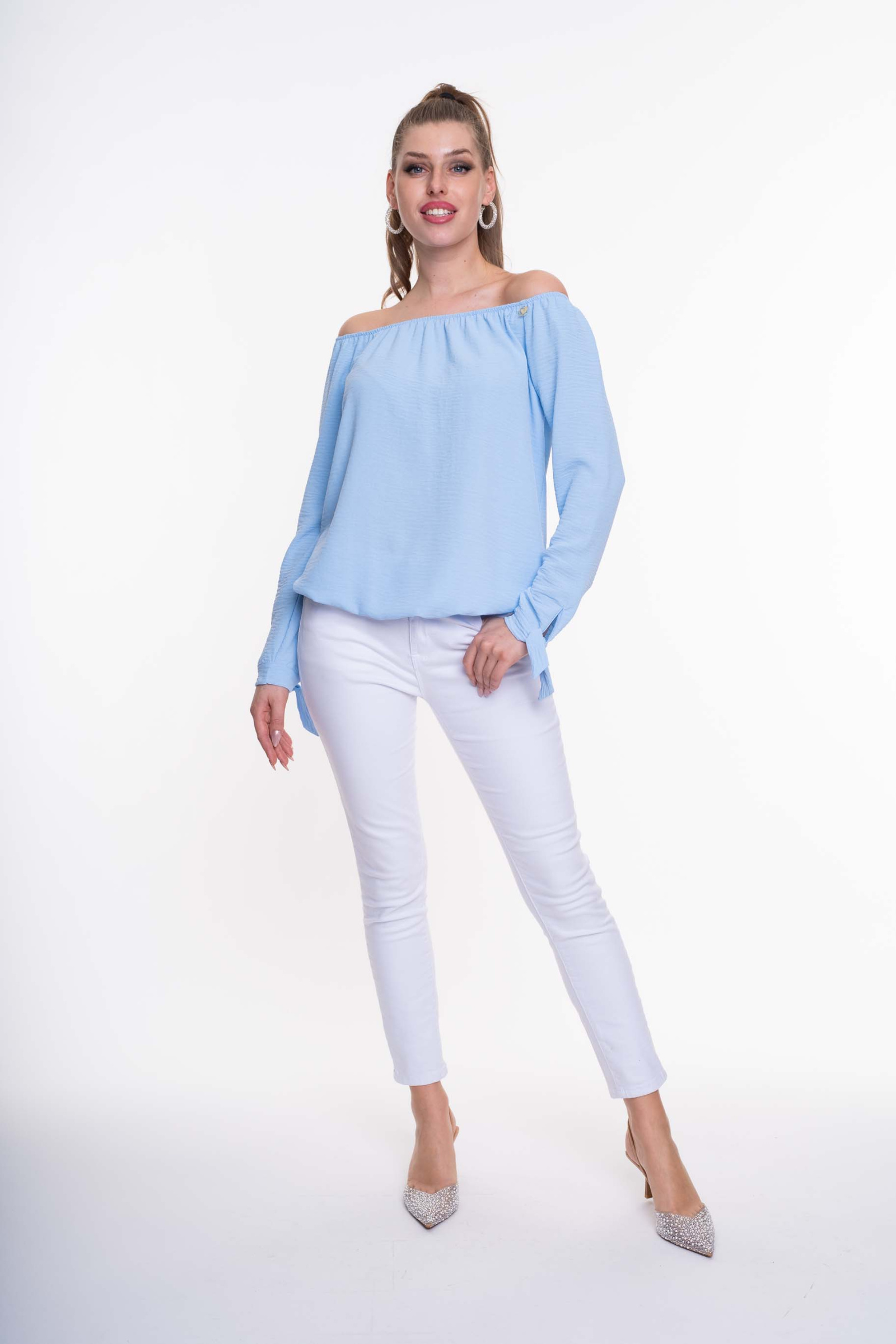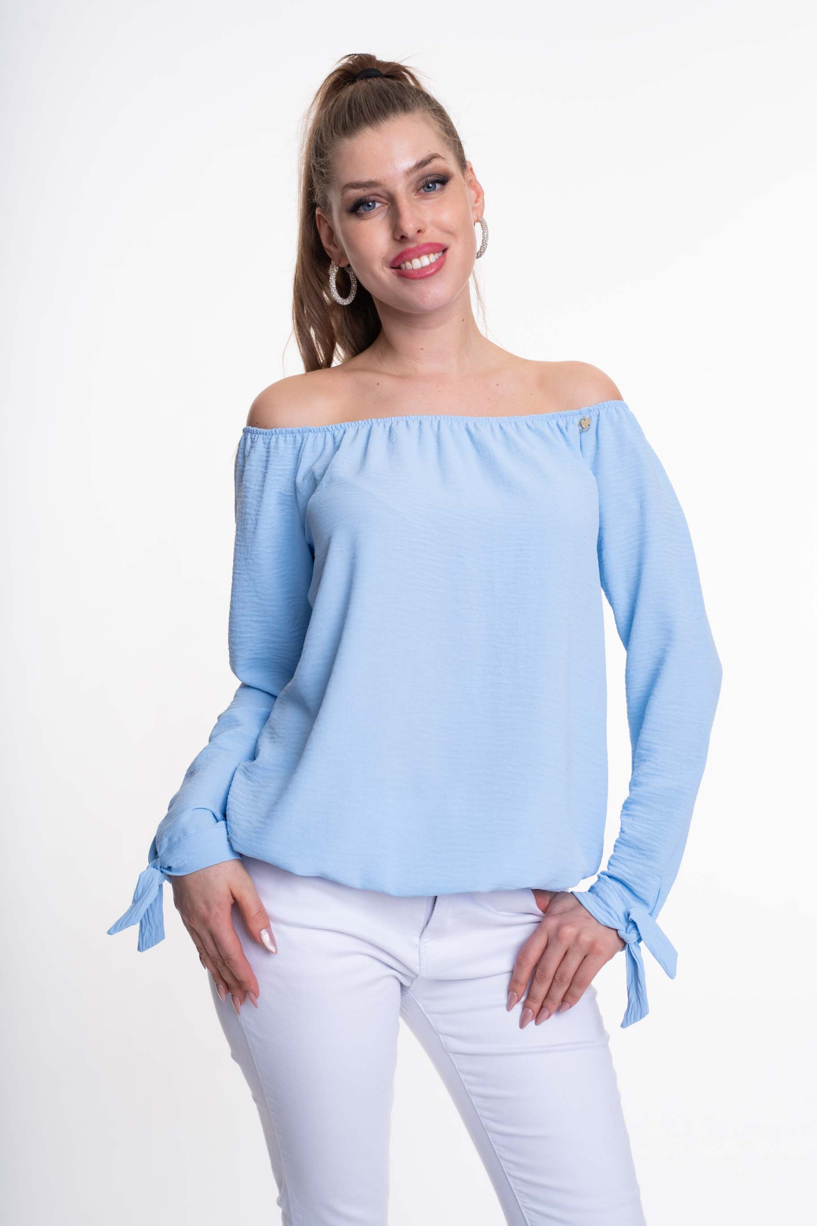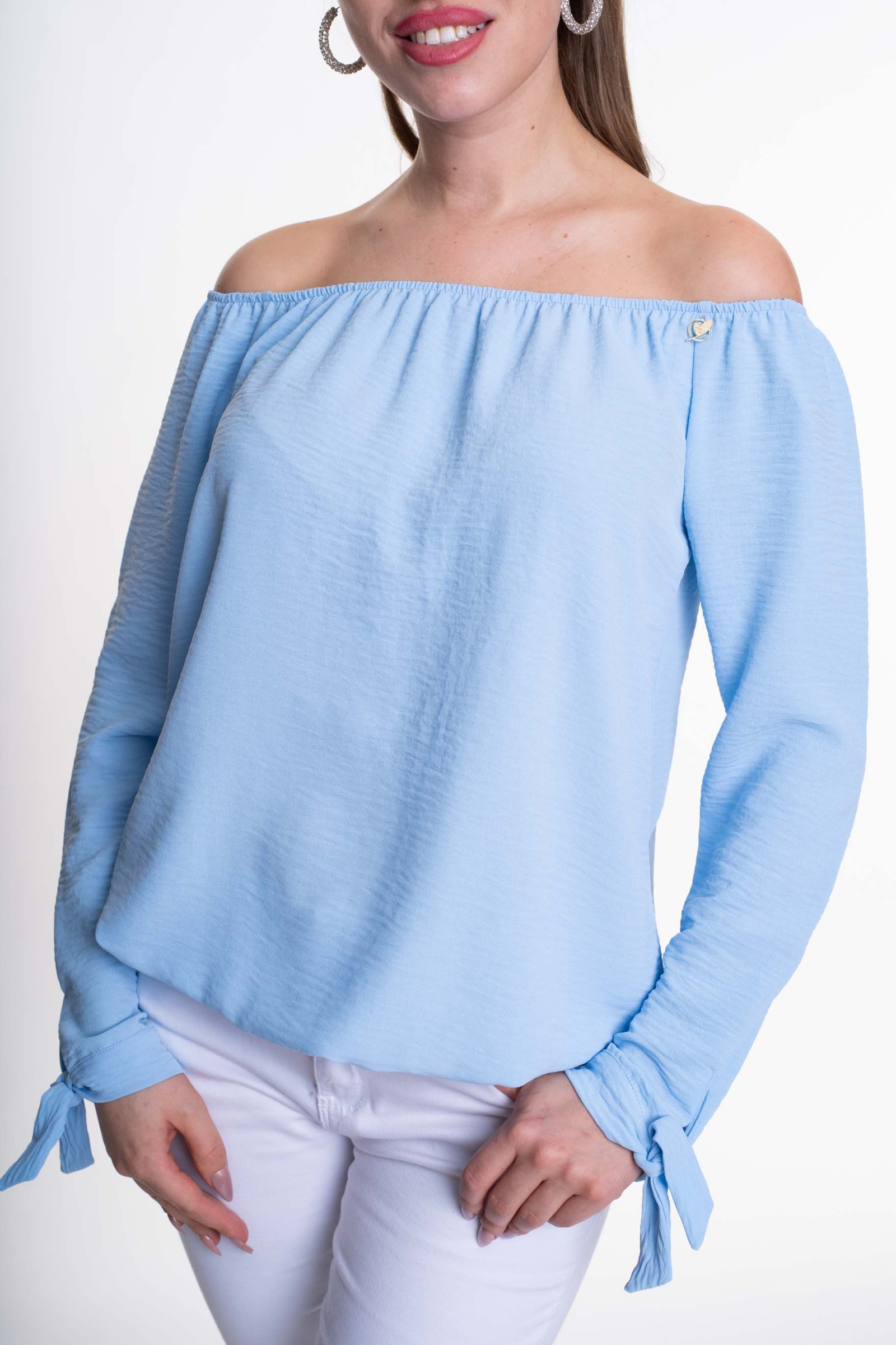 Enyhén elasztikus krepp anyagból készült, lezser szabásvonalú blúz, gumírozott alja és váll résszel, megkötős ujjakkal, kis fém márkajelzéssel.
