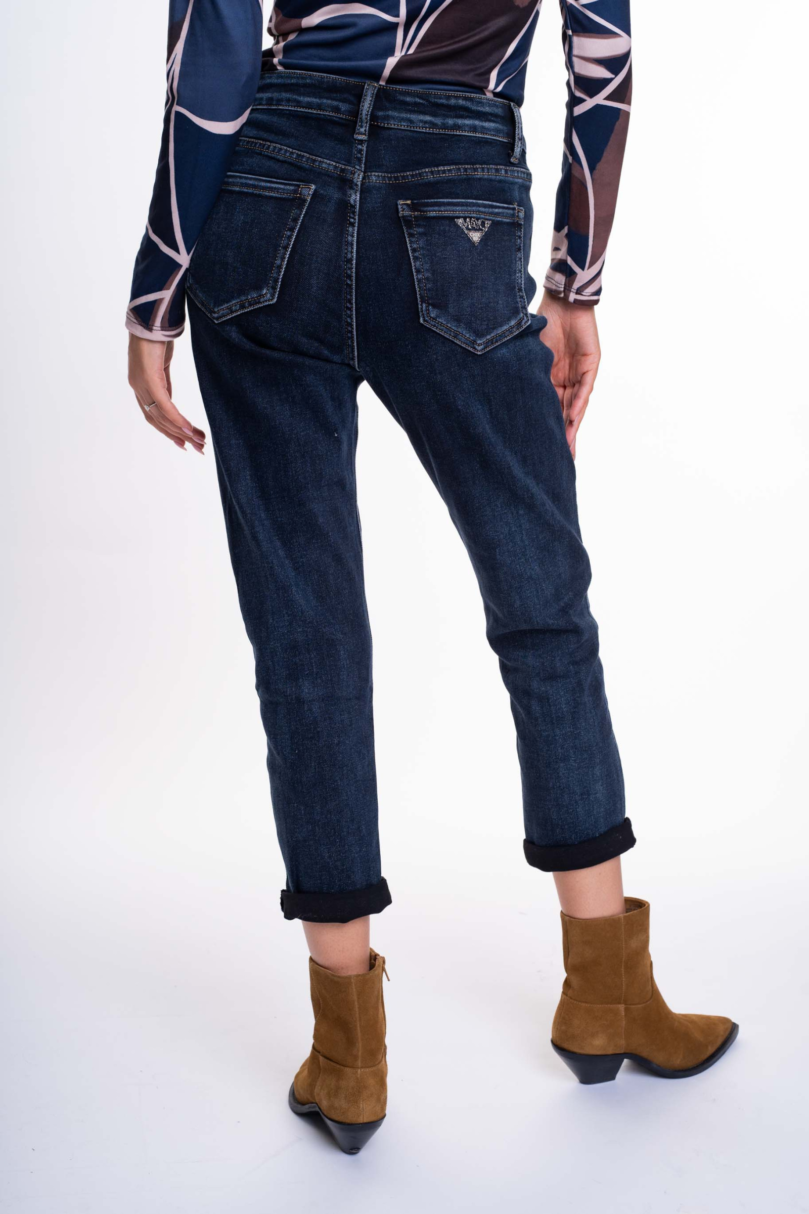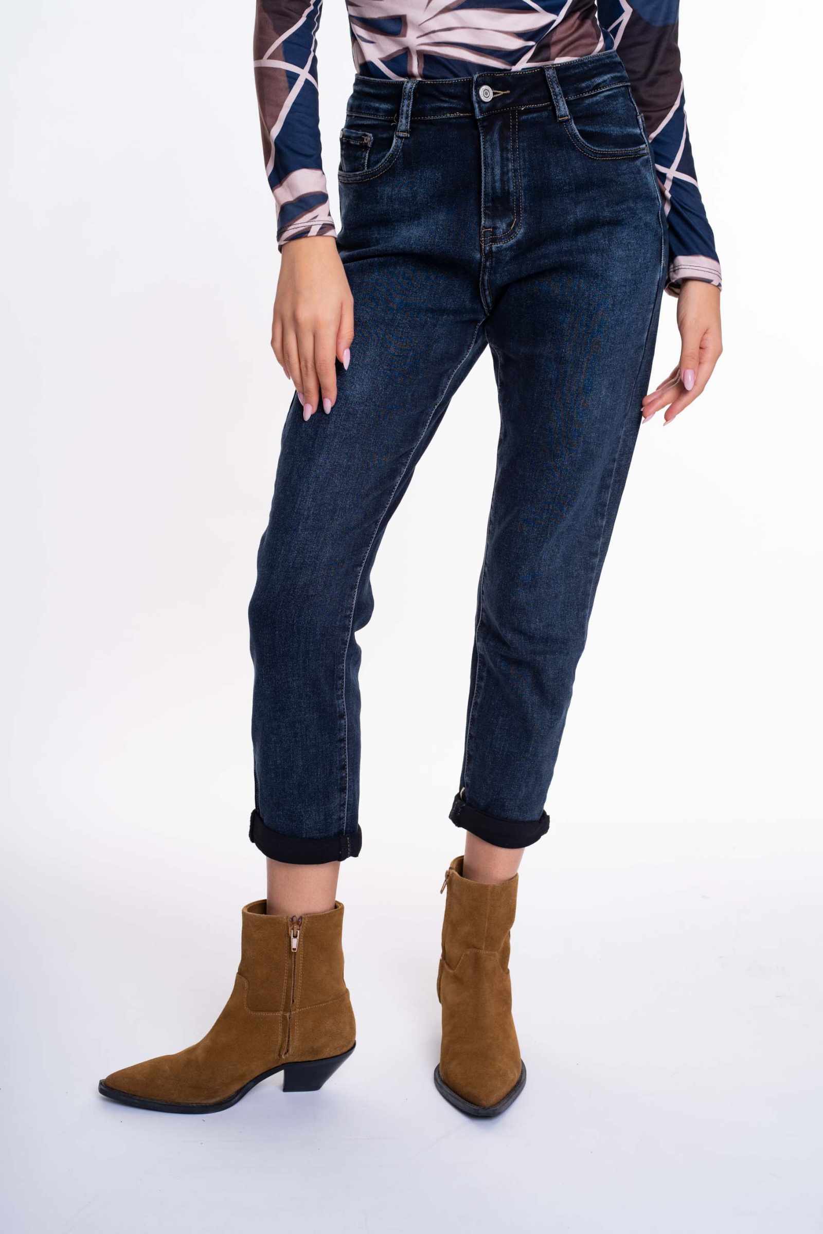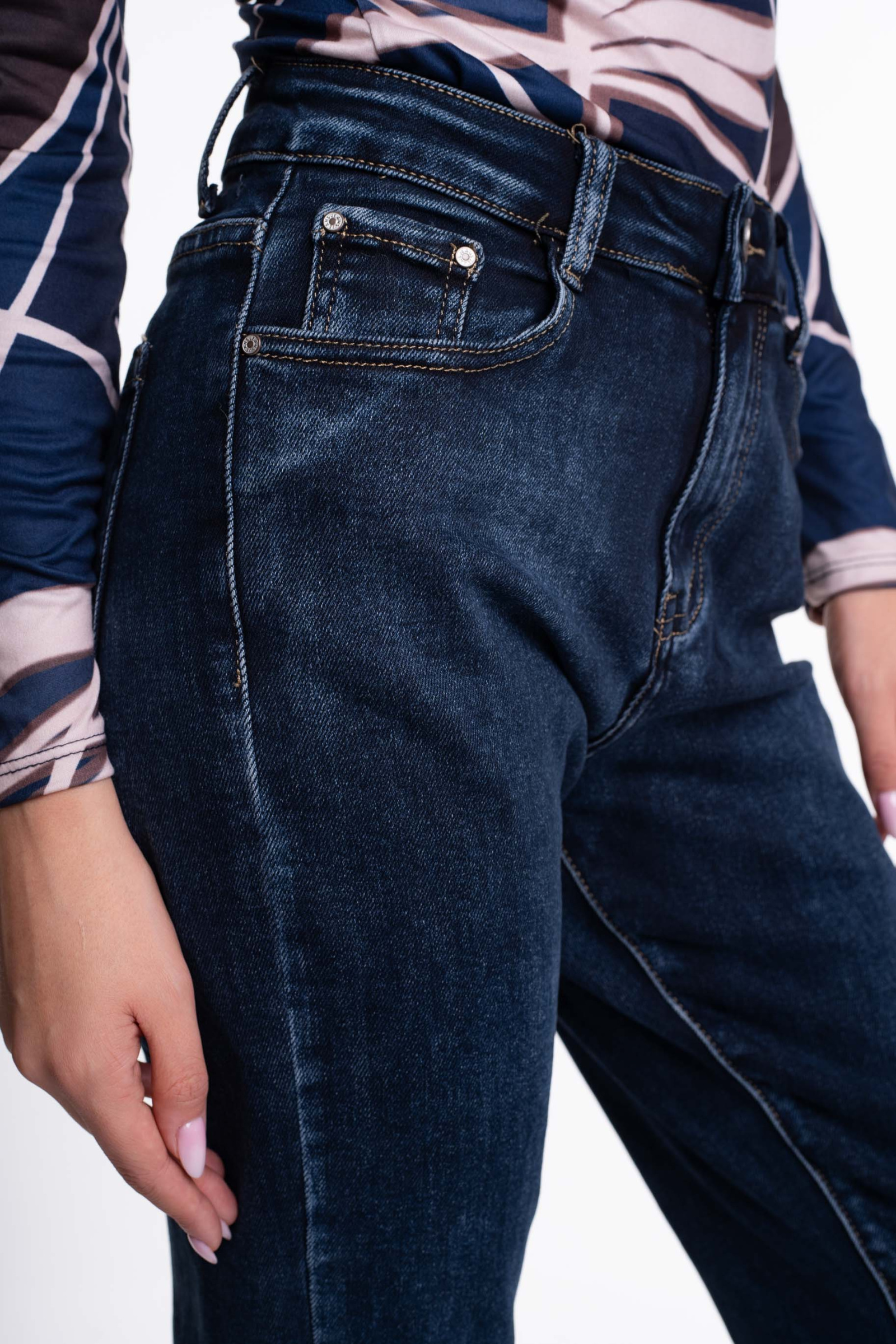 Elasztikus, sötét tónusú, magasított derekú farmernadrág, koptatással díszítve, strasszköves matrica nyomott márkajelzéssel.