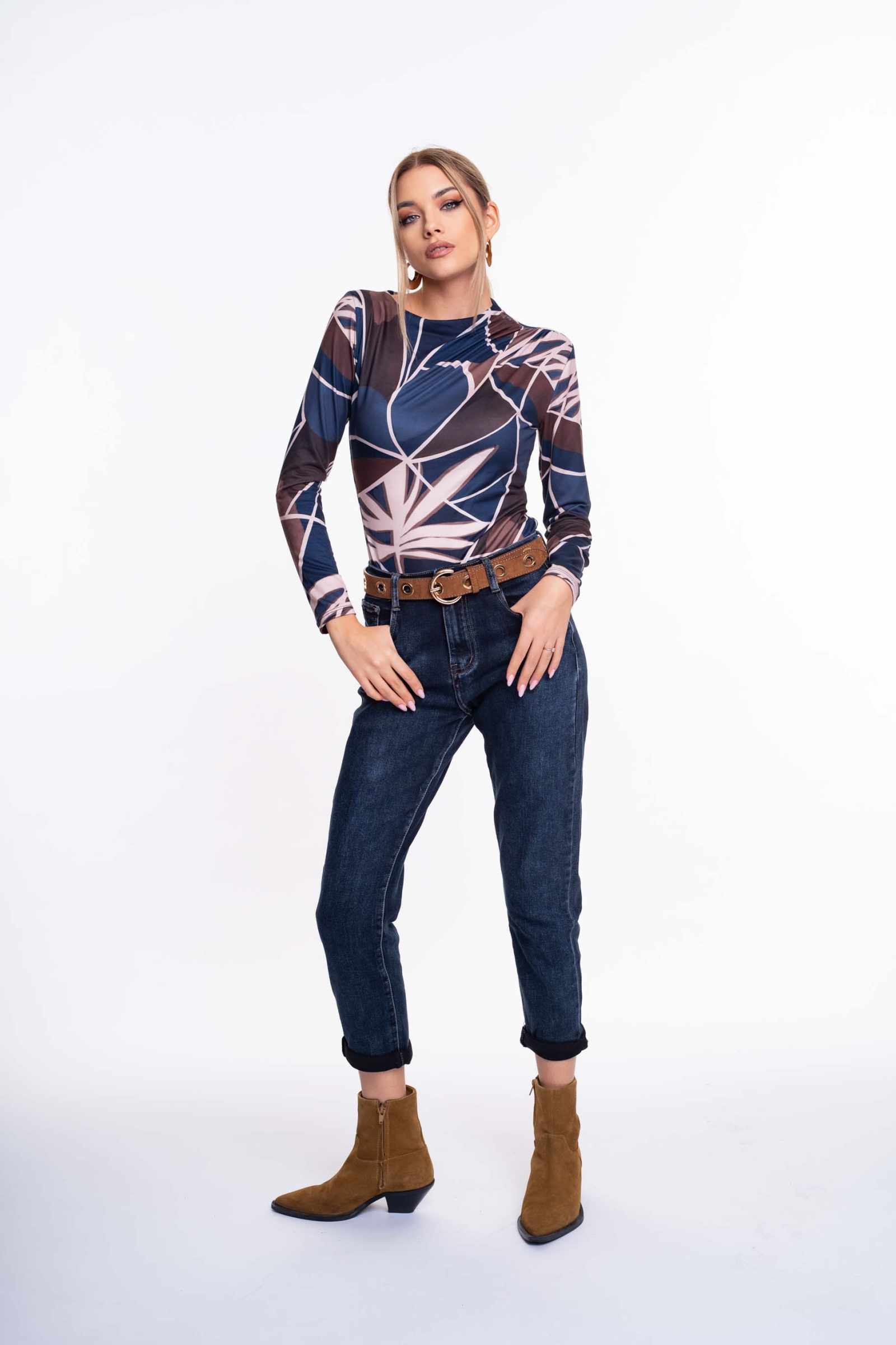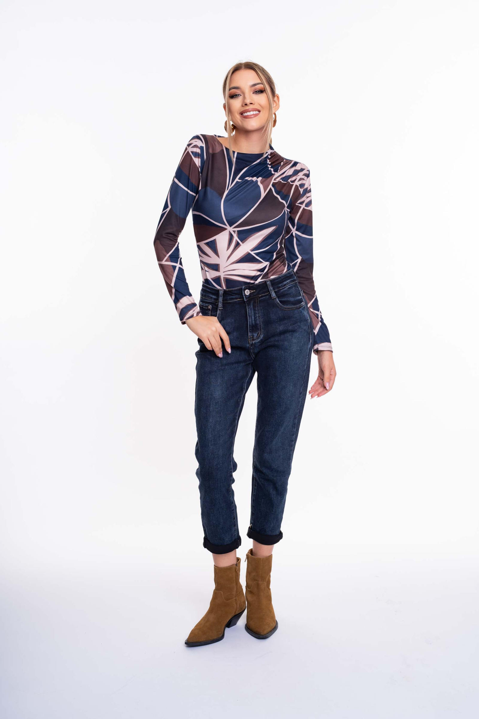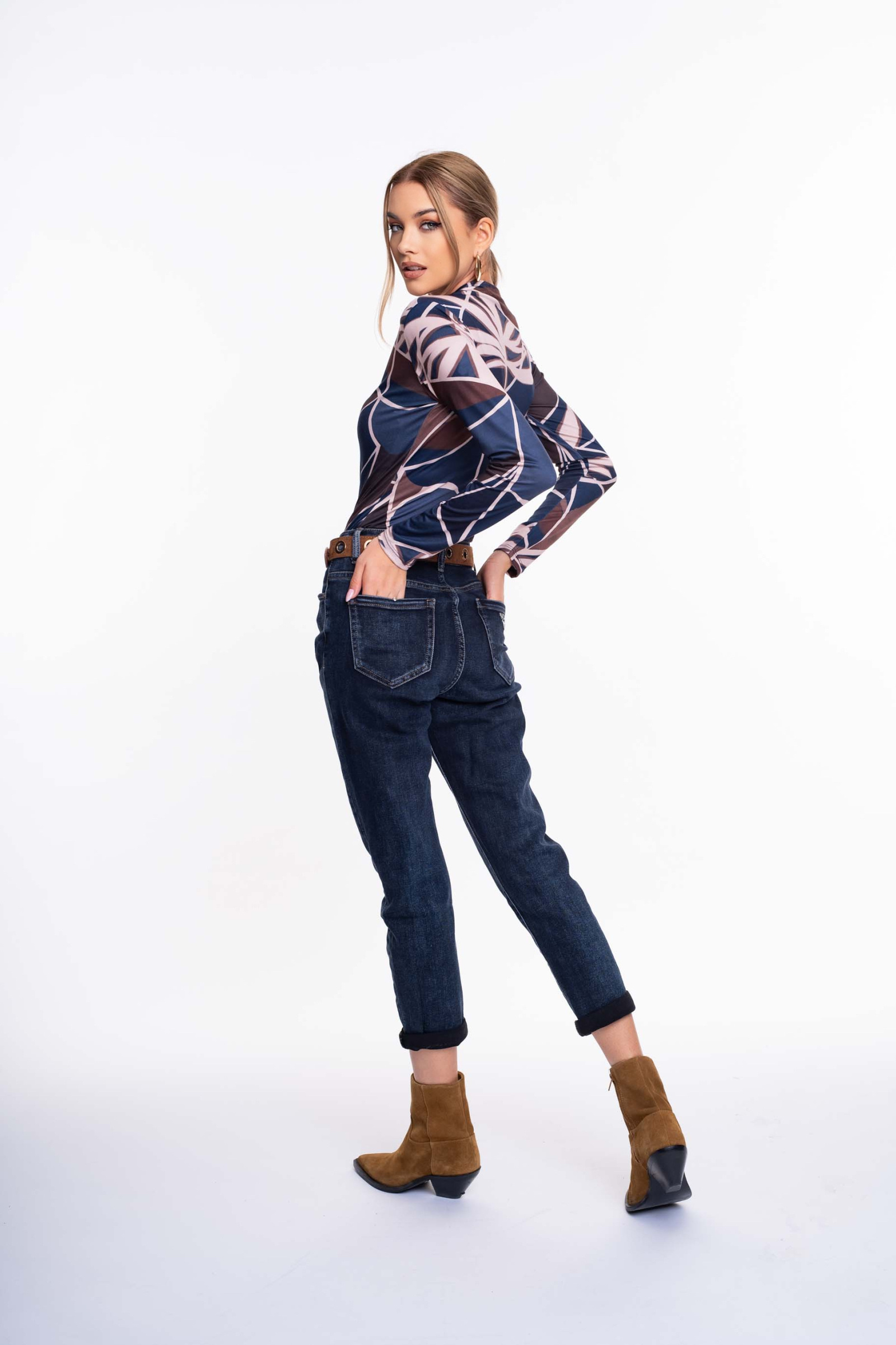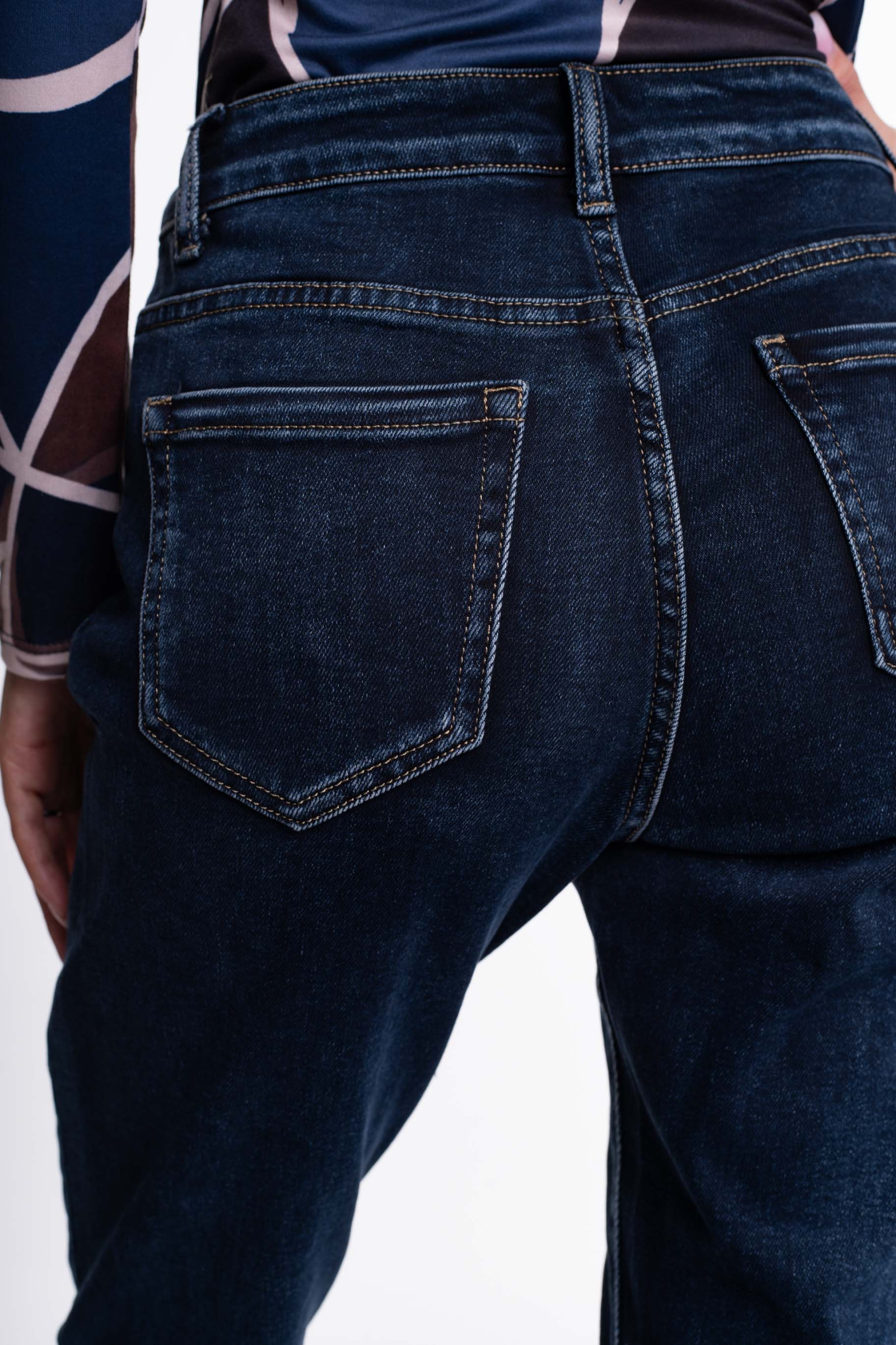 Elasztikus, sötét tónusú, magasított derekú farmernadrág, koptatással díszítve, strasszköves matrica nyomott márkajelzéssel.