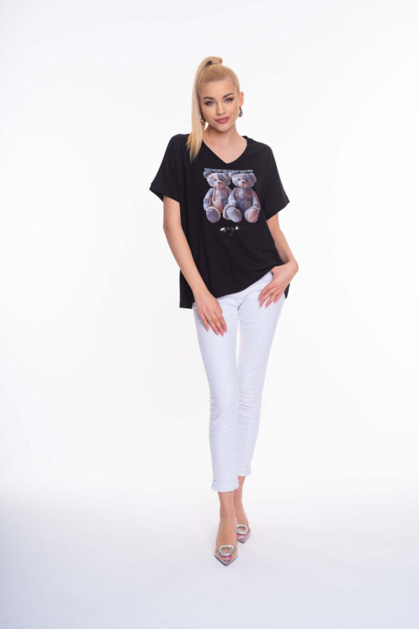 Elasztikus anyagból készült, lezser szabásvonalú felső „V” nyakkivágással, matrica nyomott díszítéssel.