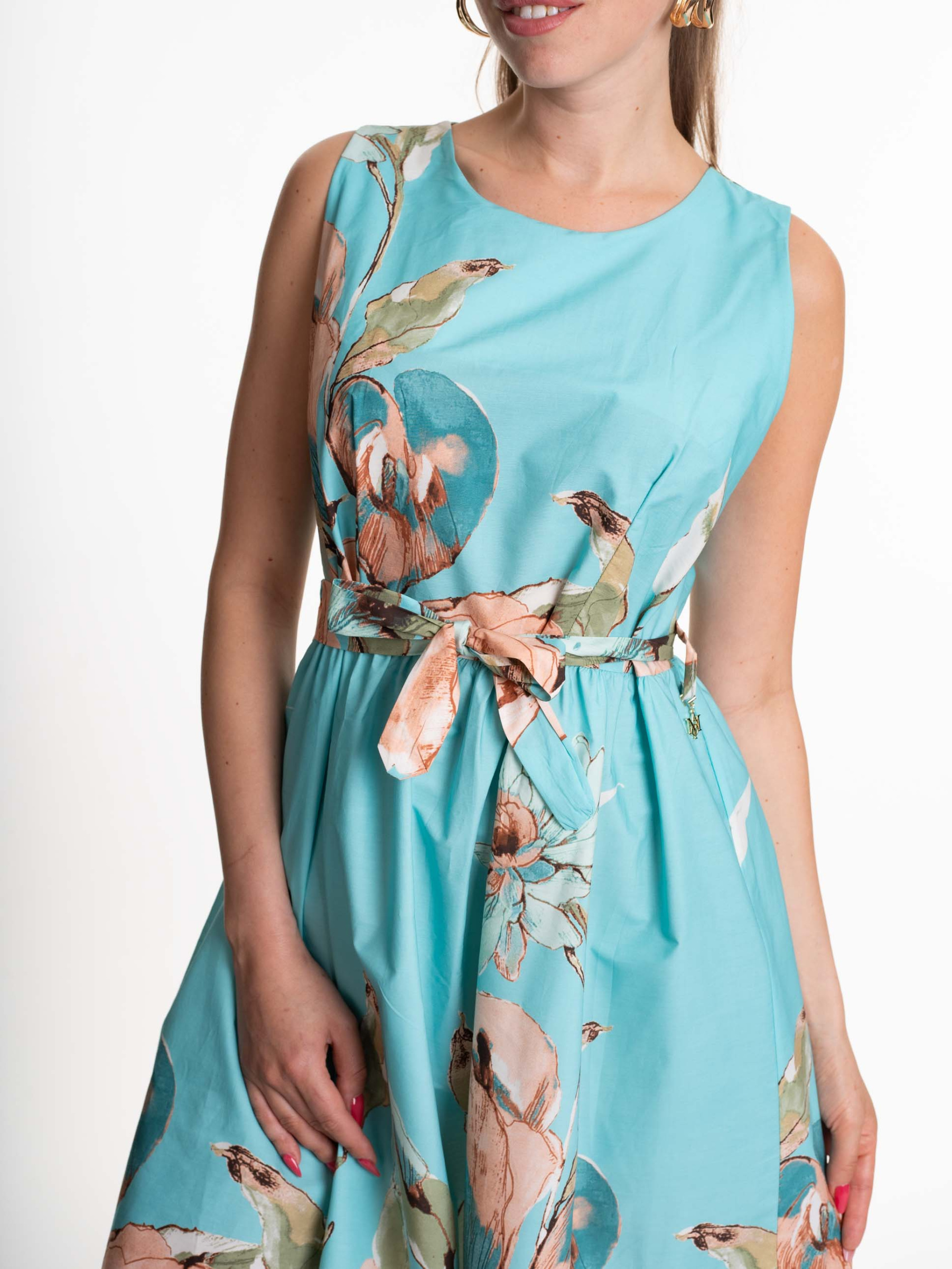 Fix anyagból készült ruha bélelt mellrésszel, hátán gombos záródással, saját anyagából készült megkötővel, mosáshoz levehető kis fém márkajelzéssel.