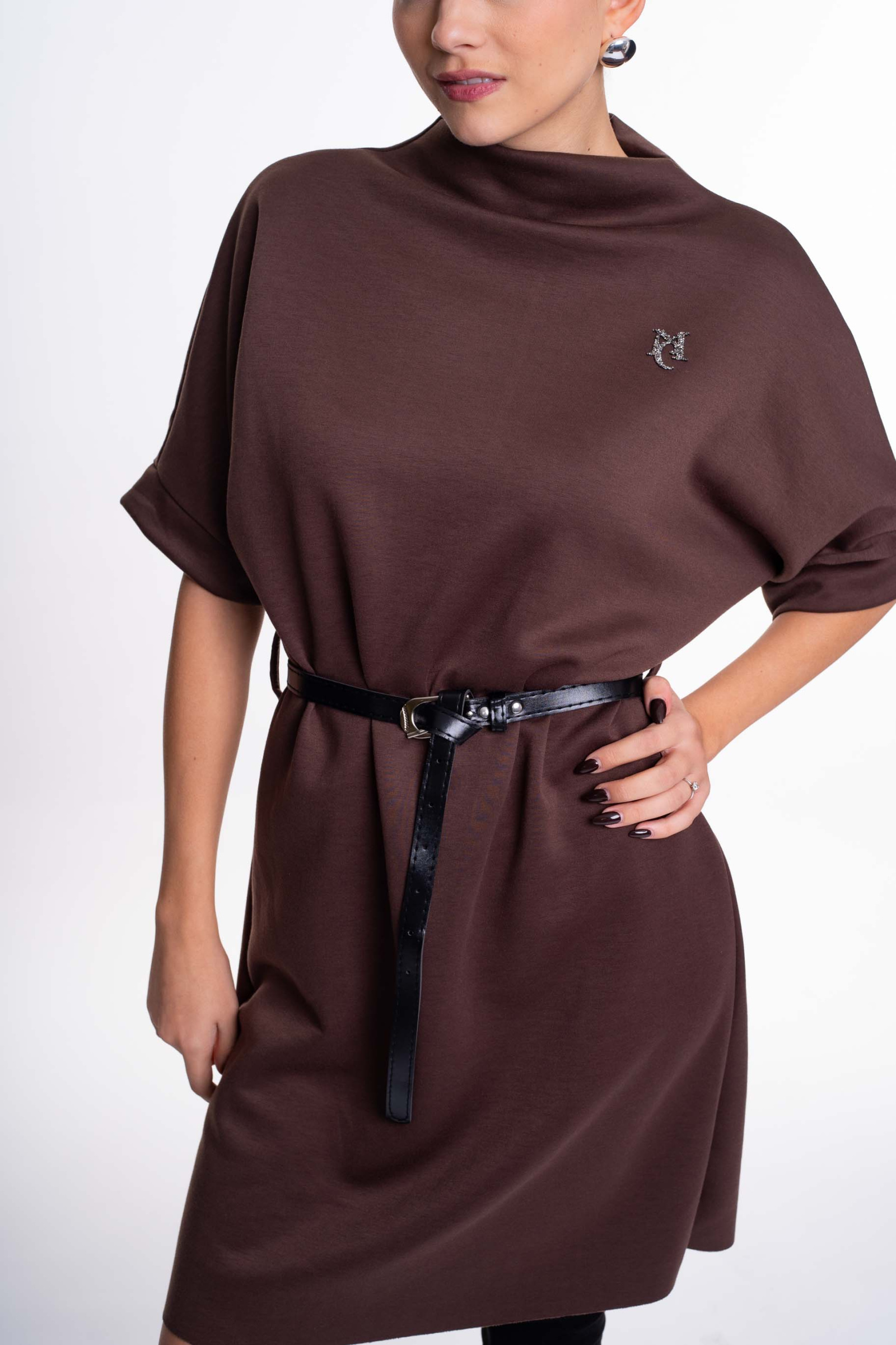 Elasztikus anyagból készült, bő szabásvonalú ruha, ujján saját anyagából passzékkal, szegetlen alja résszel, derekán öv kiegészítővel, strasszos, matrica nyomott márkajelzéssel.