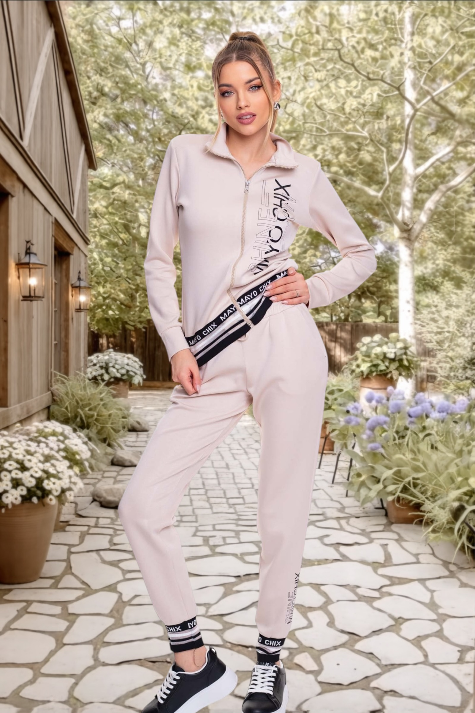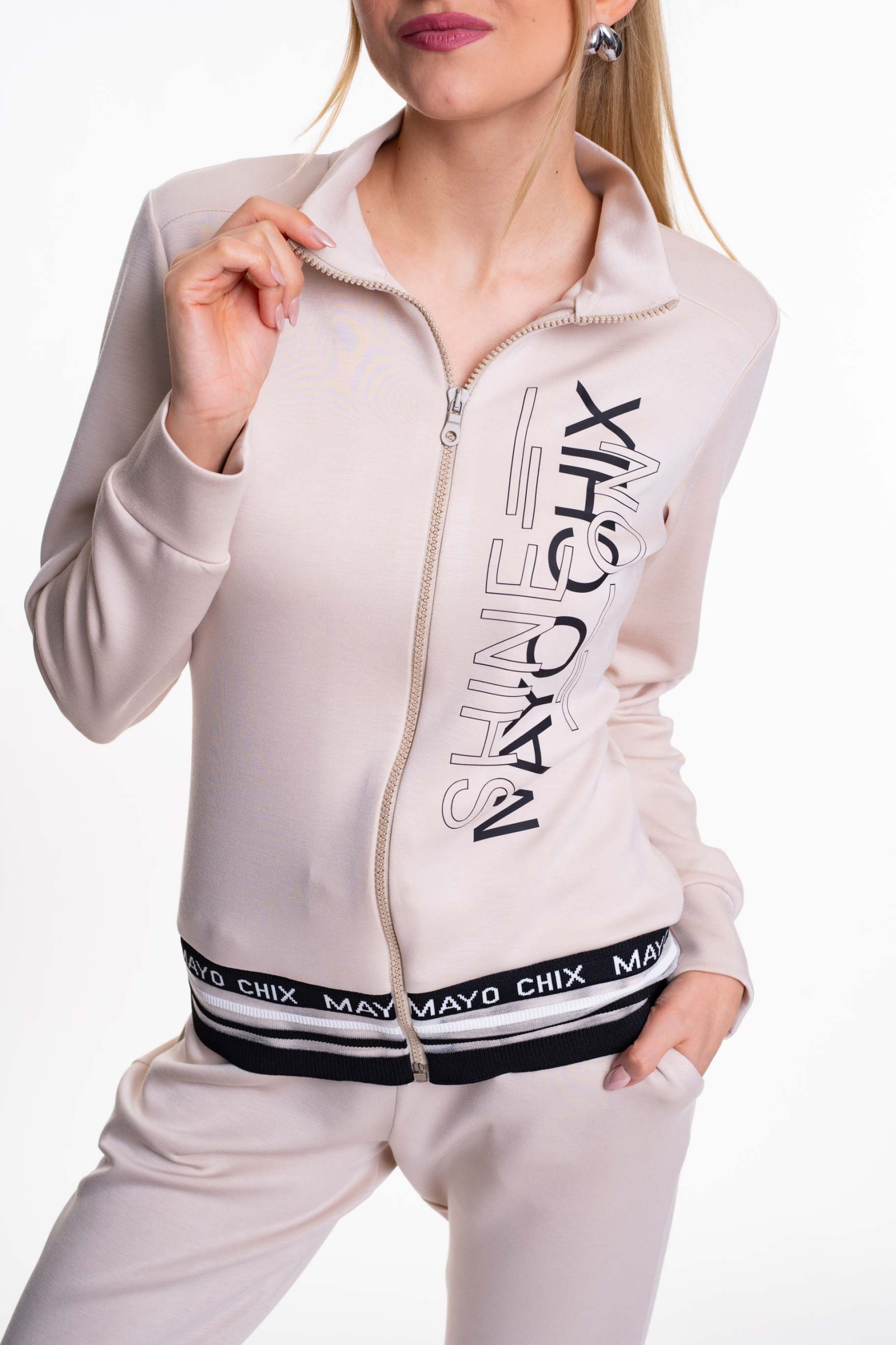 Elasztikus anyagból készült, cipzáras felső, alján márkajelzett passzéval, matricanyomott márkajelzéssel.