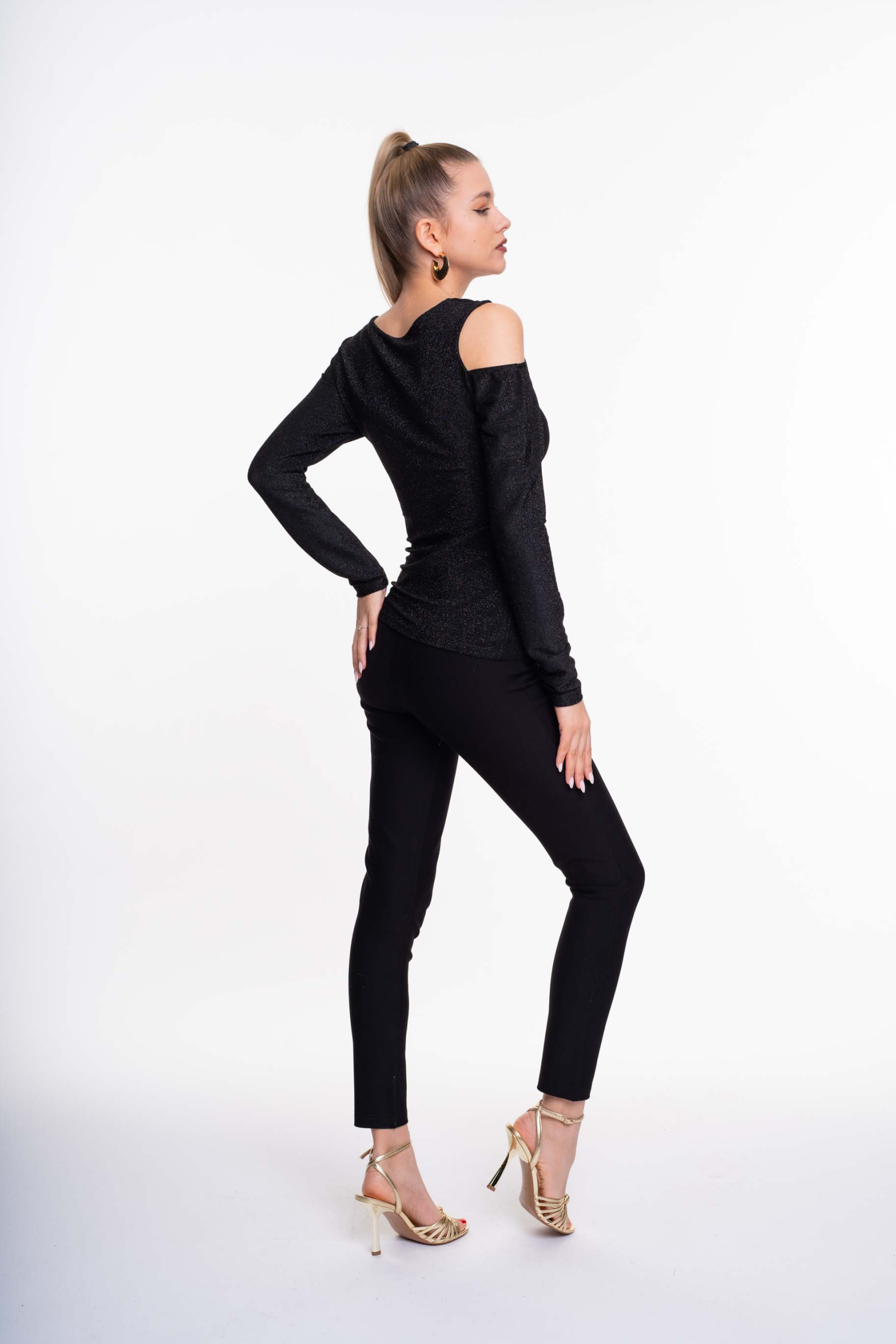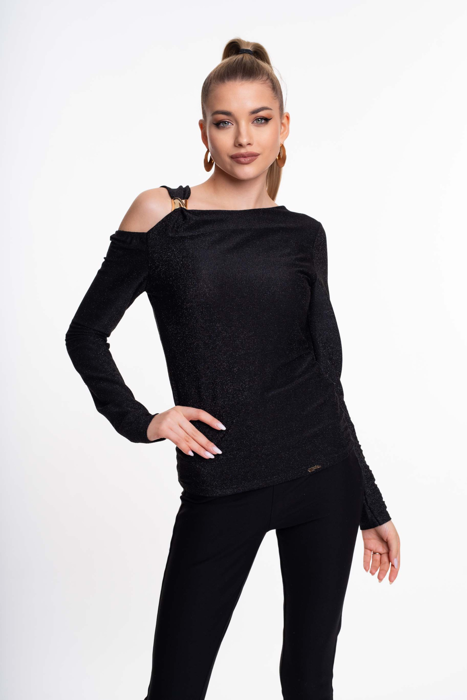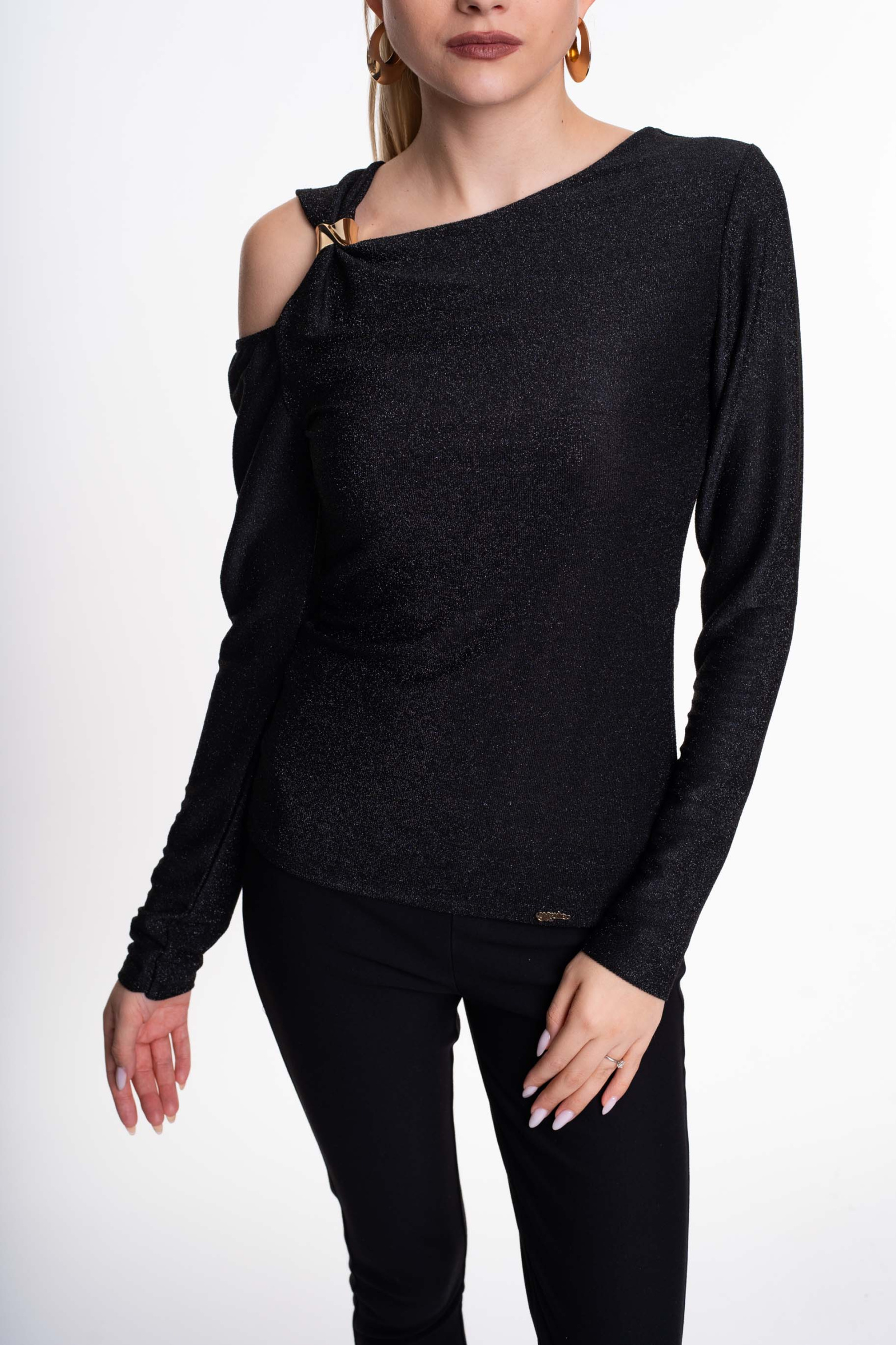 Elasztikus, lurexszálas anyagból készült, karcsúsított fazonú felső, aszimmetrikus vállrész megoldással, kis fém márkajelzéssel.