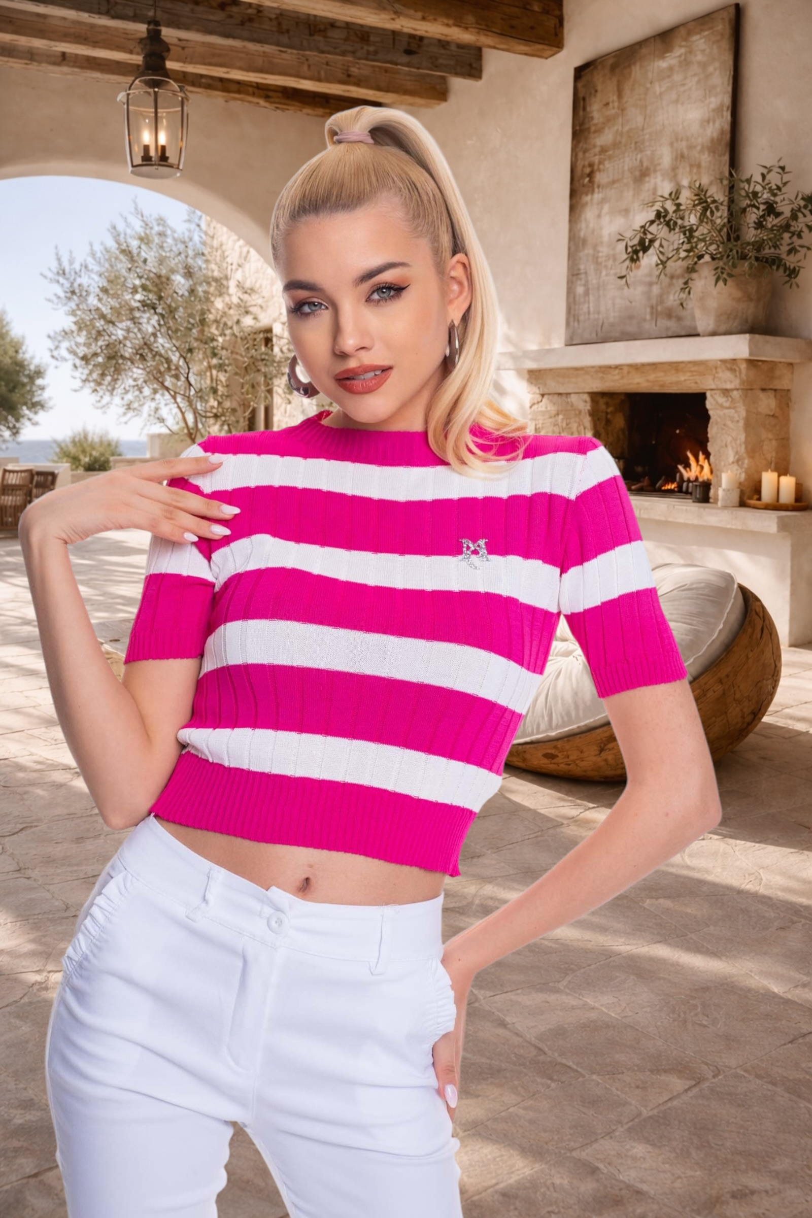 Elasztikus, bordás kötött anyagból készült rövid fazonú top, strasszköves matrica nyomott márkajelzéssel.