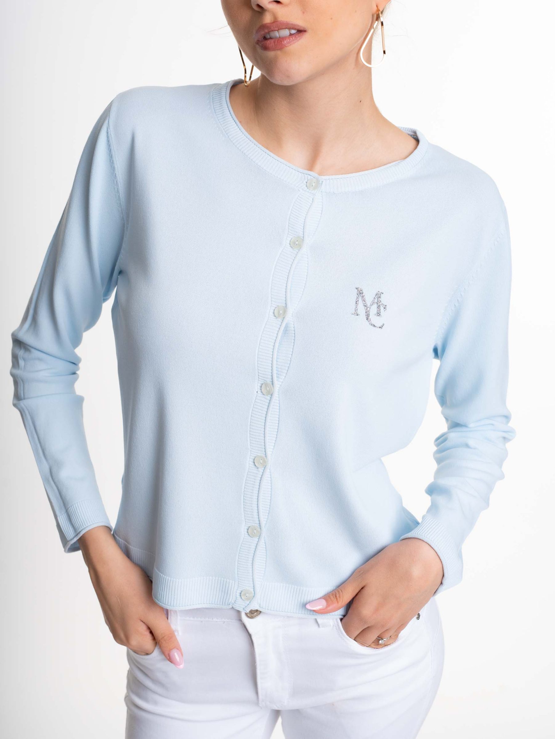 Vékony kötött anyagból készült, gombos záródású kardigán, strasszos matrica nyomott márkajelzéssel.