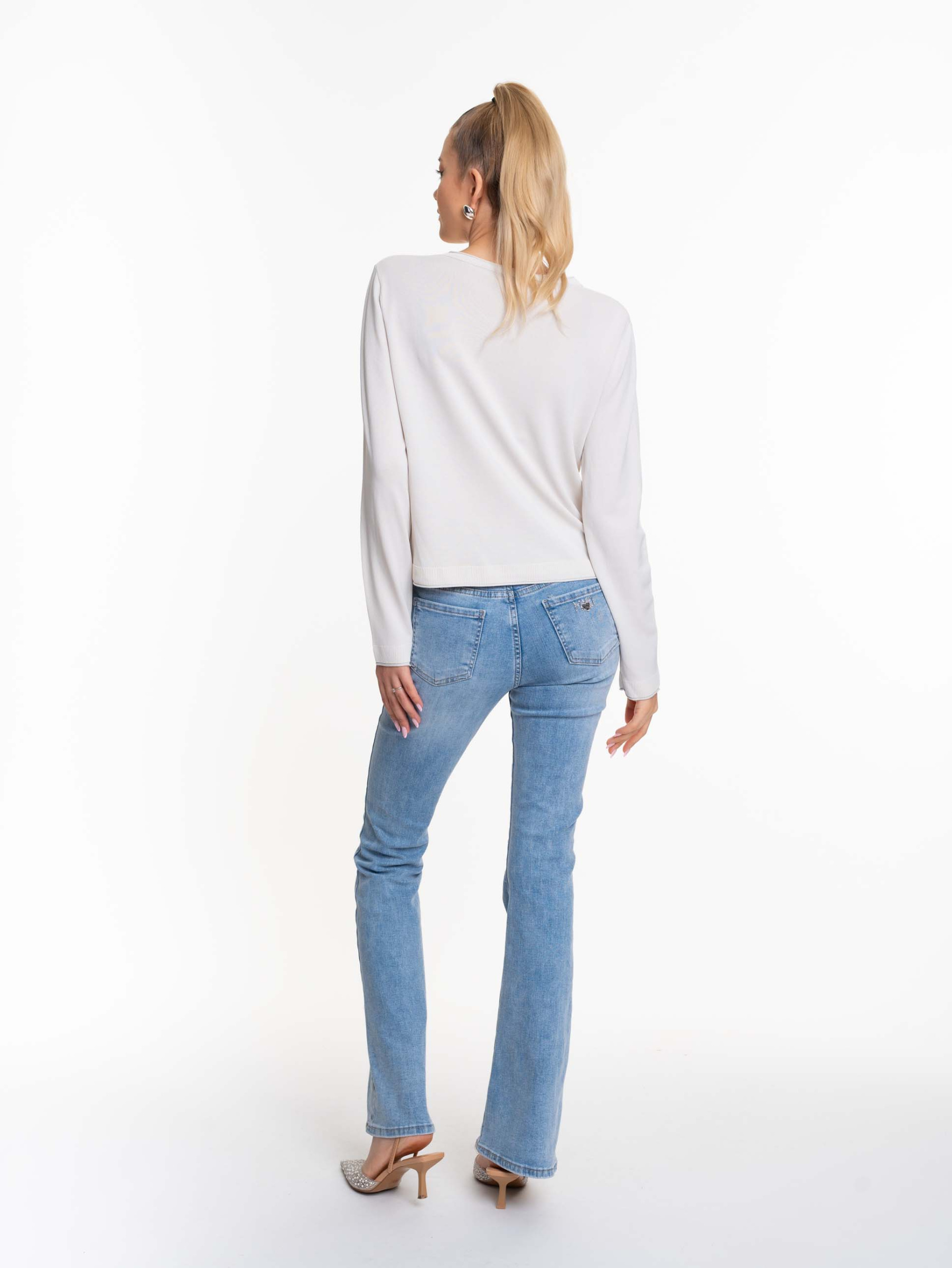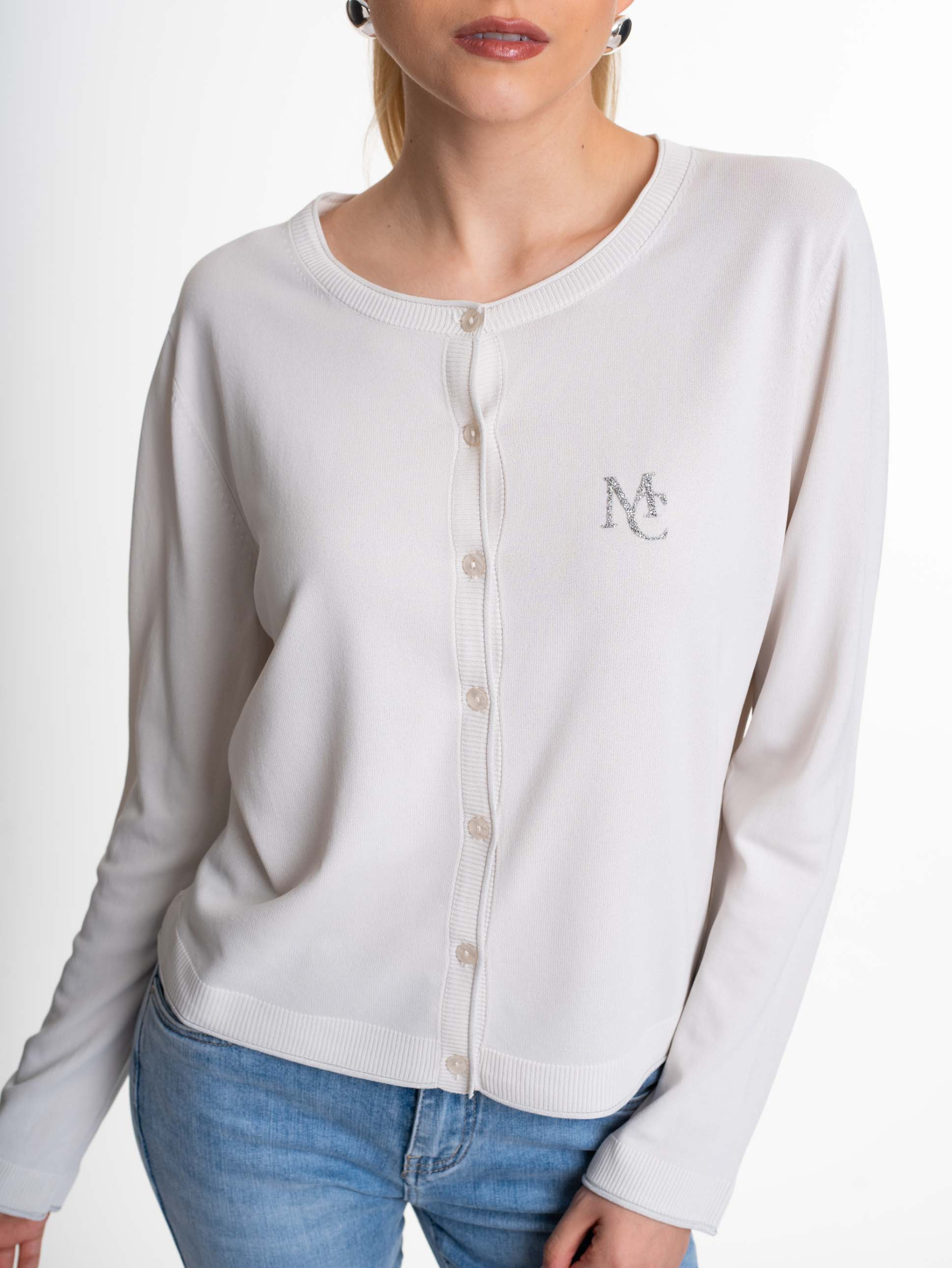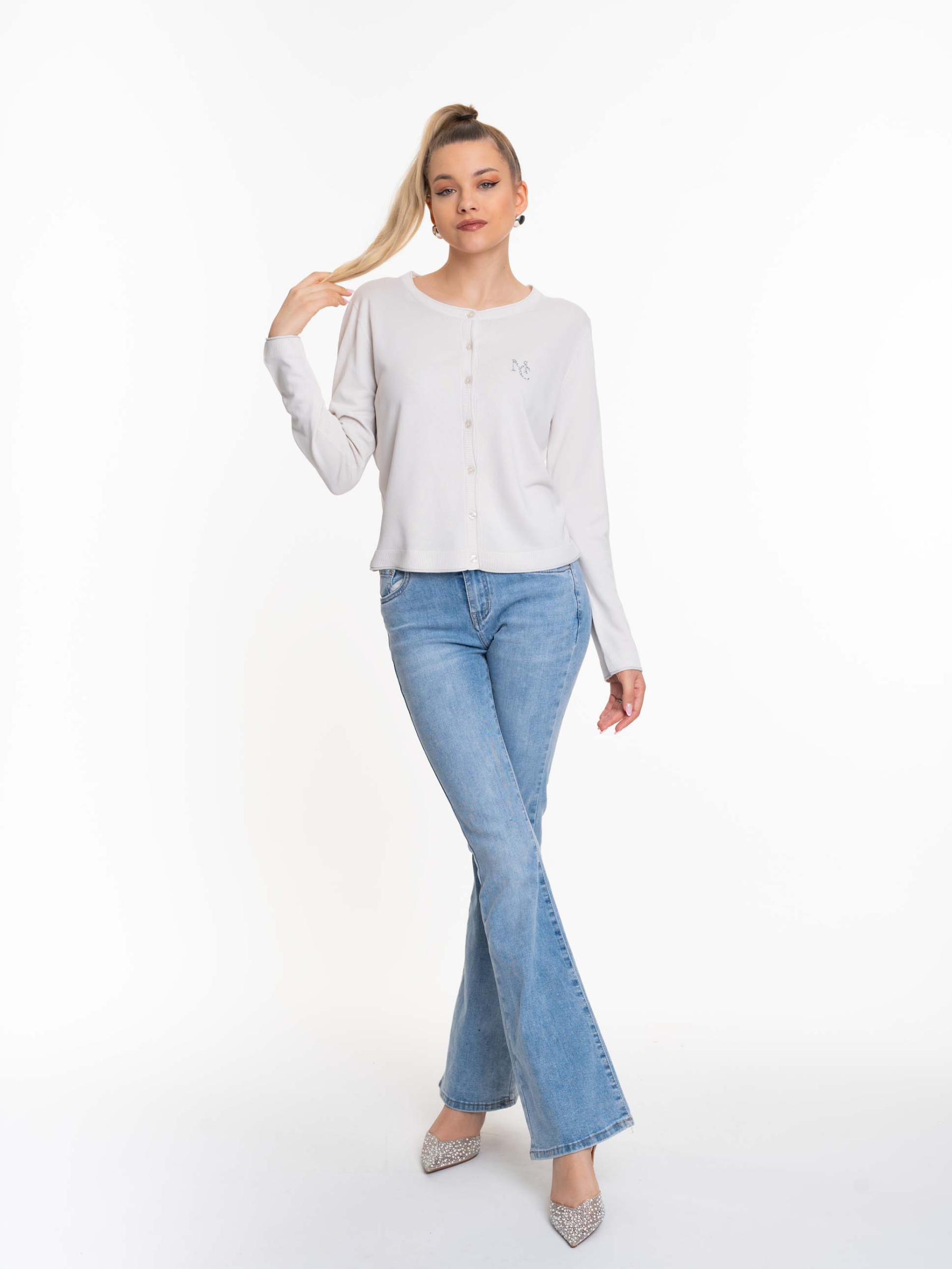 Vékony kötött anyagból készült, gombos záródású kardigán, strasszos matrica nyomott márkajelzéssel.