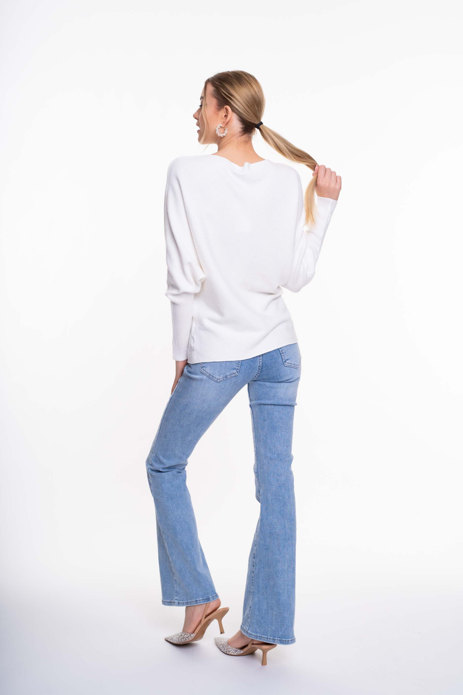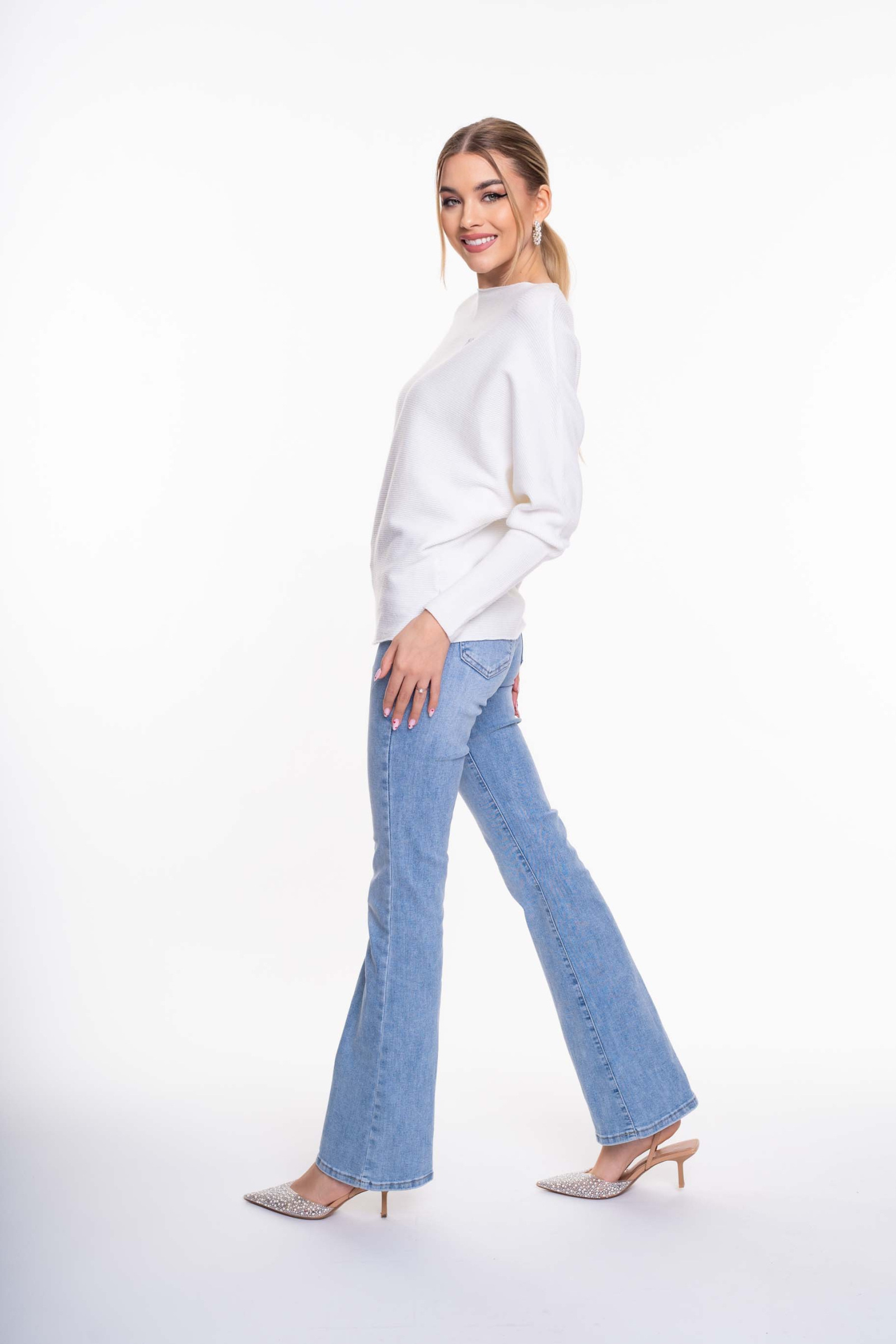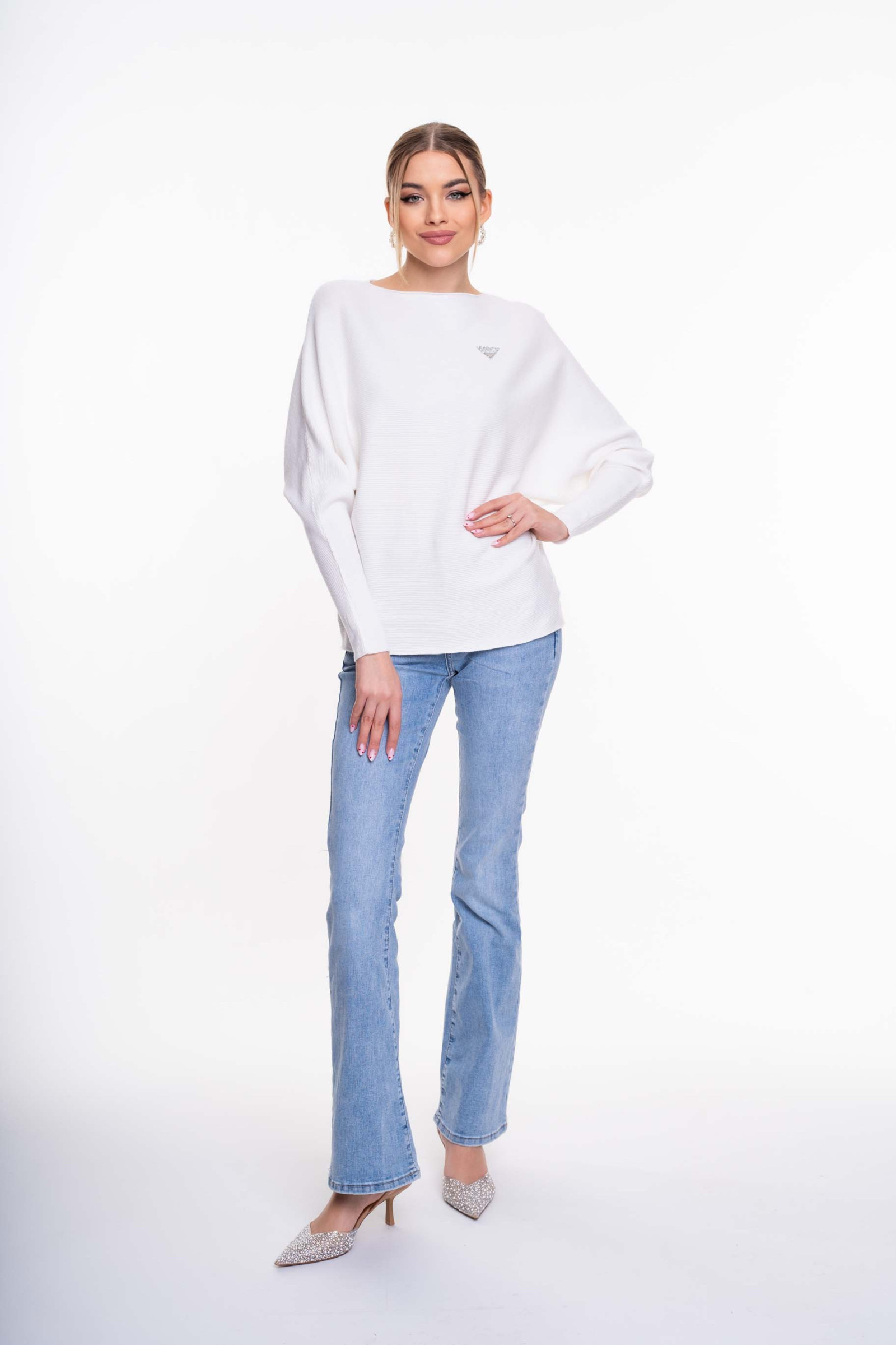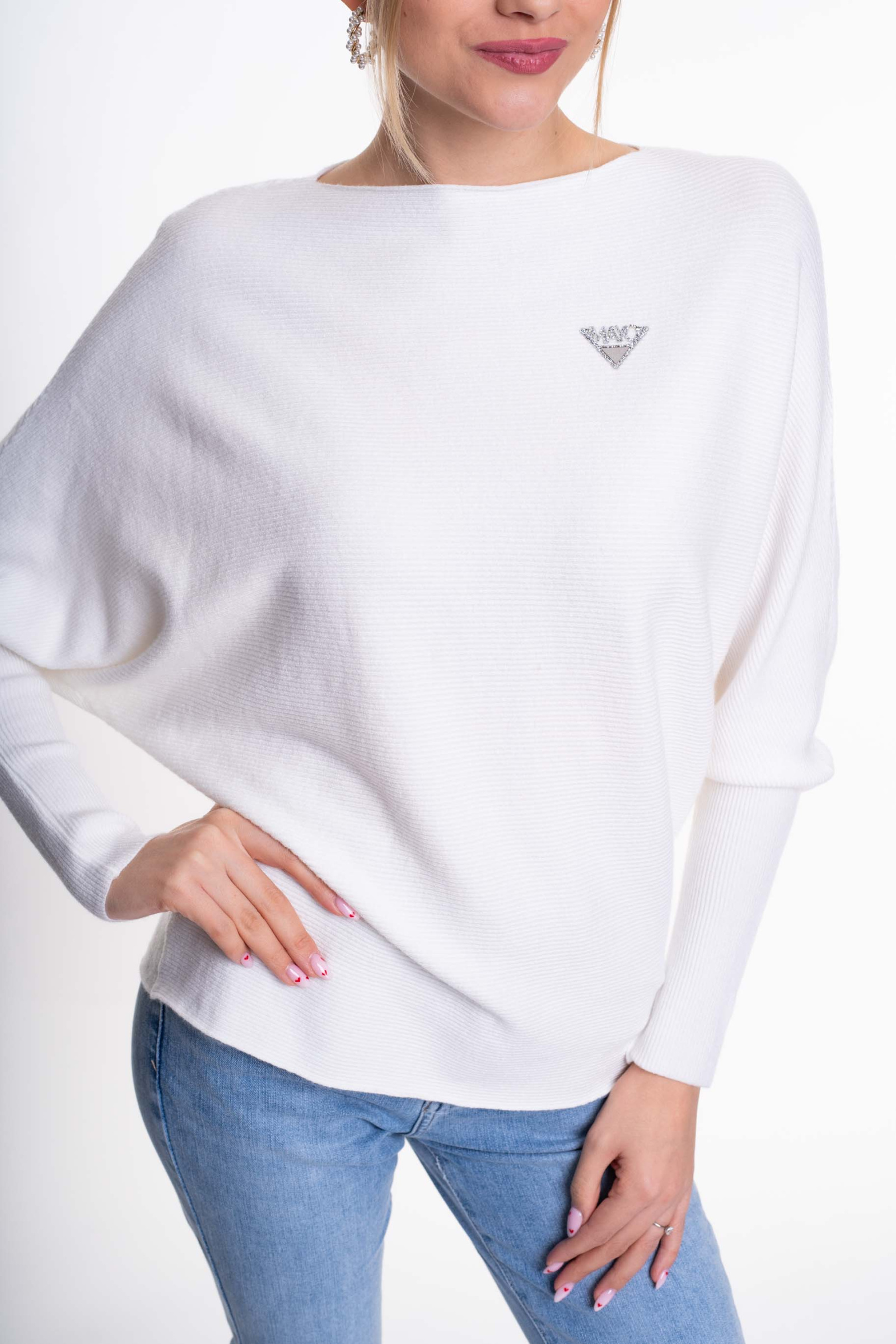 Bordás kötött anyagból készült, lezser szabásvonalú pulóver, strasszköves matrica nyomott márkajelzéssel.