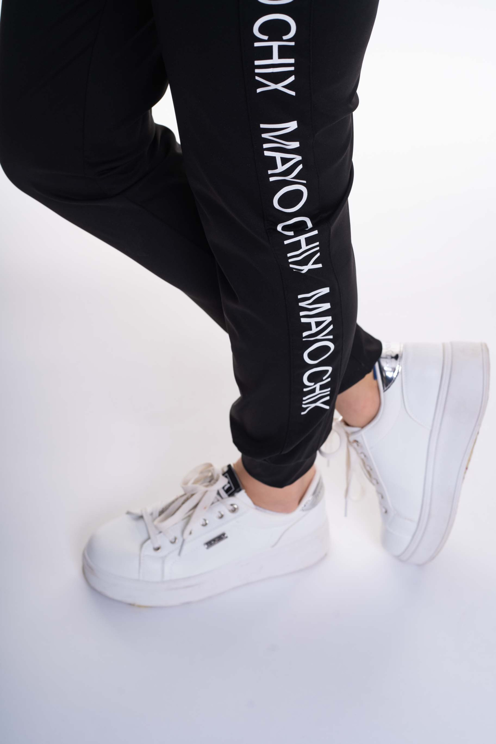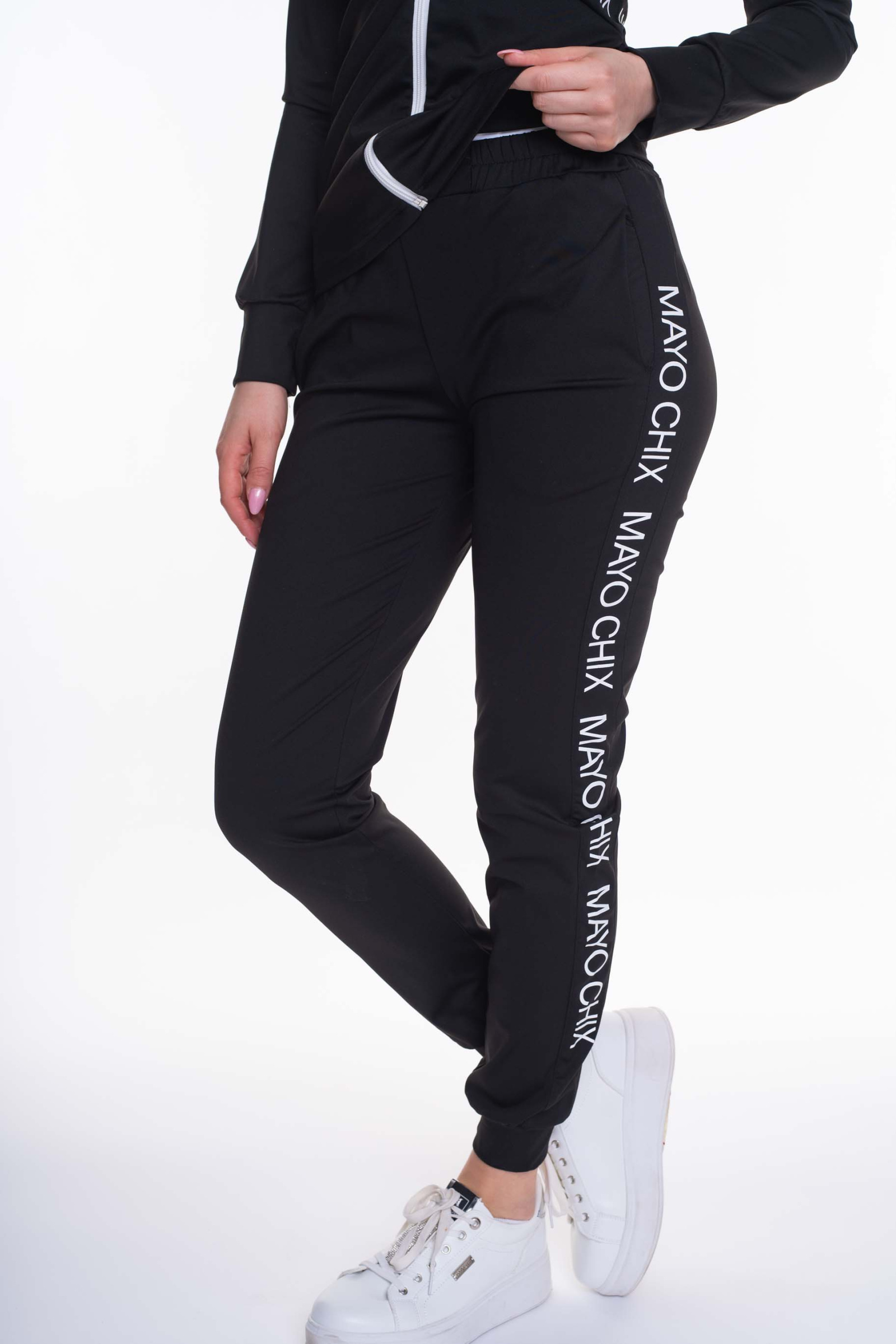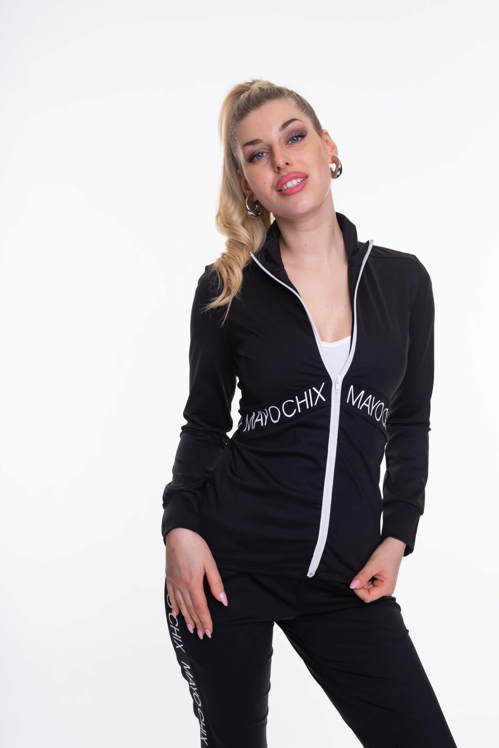 Elasztikus anyagból készült, karcsúsított fazonú cippzáras felső, gumis derekú, zsebes melegítőnadrággal, film nyomott márka jelzéskkel.
