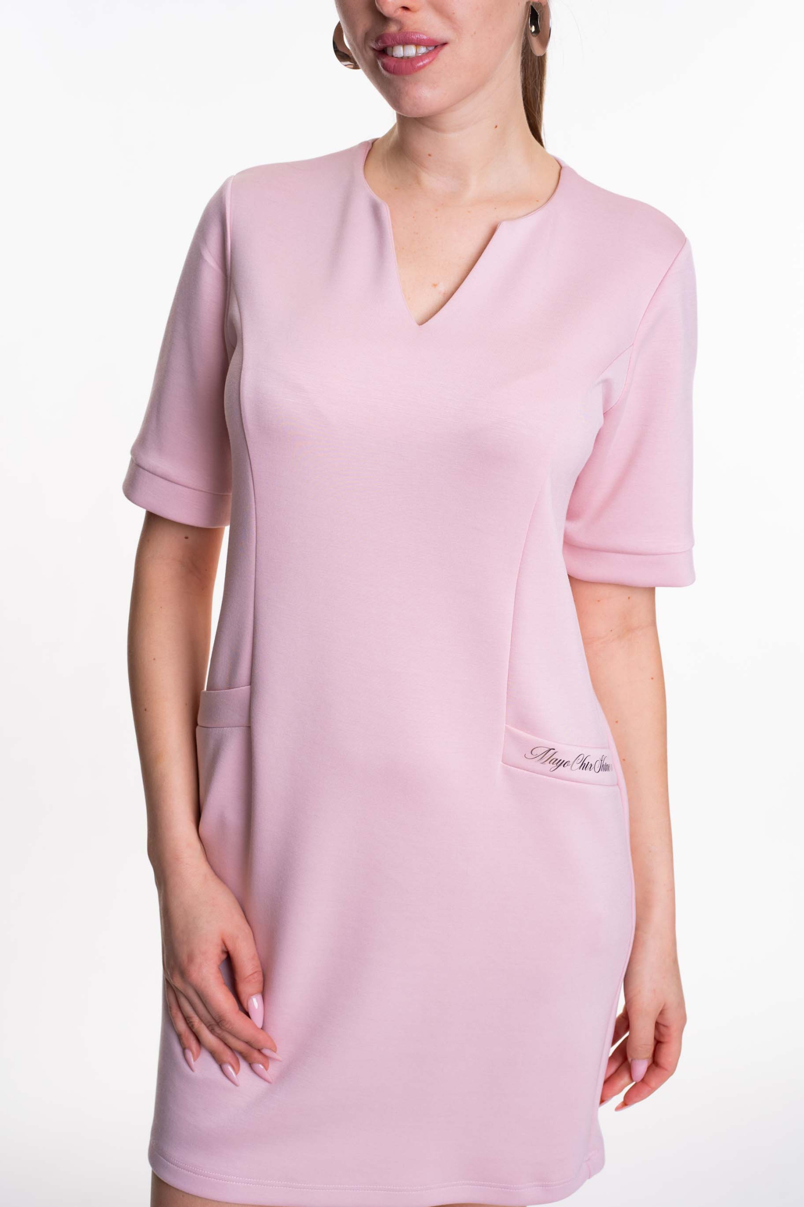 Elasztikus anyagból készült ruha álzsebekkel, matrica nyomott márkajelzéssel.