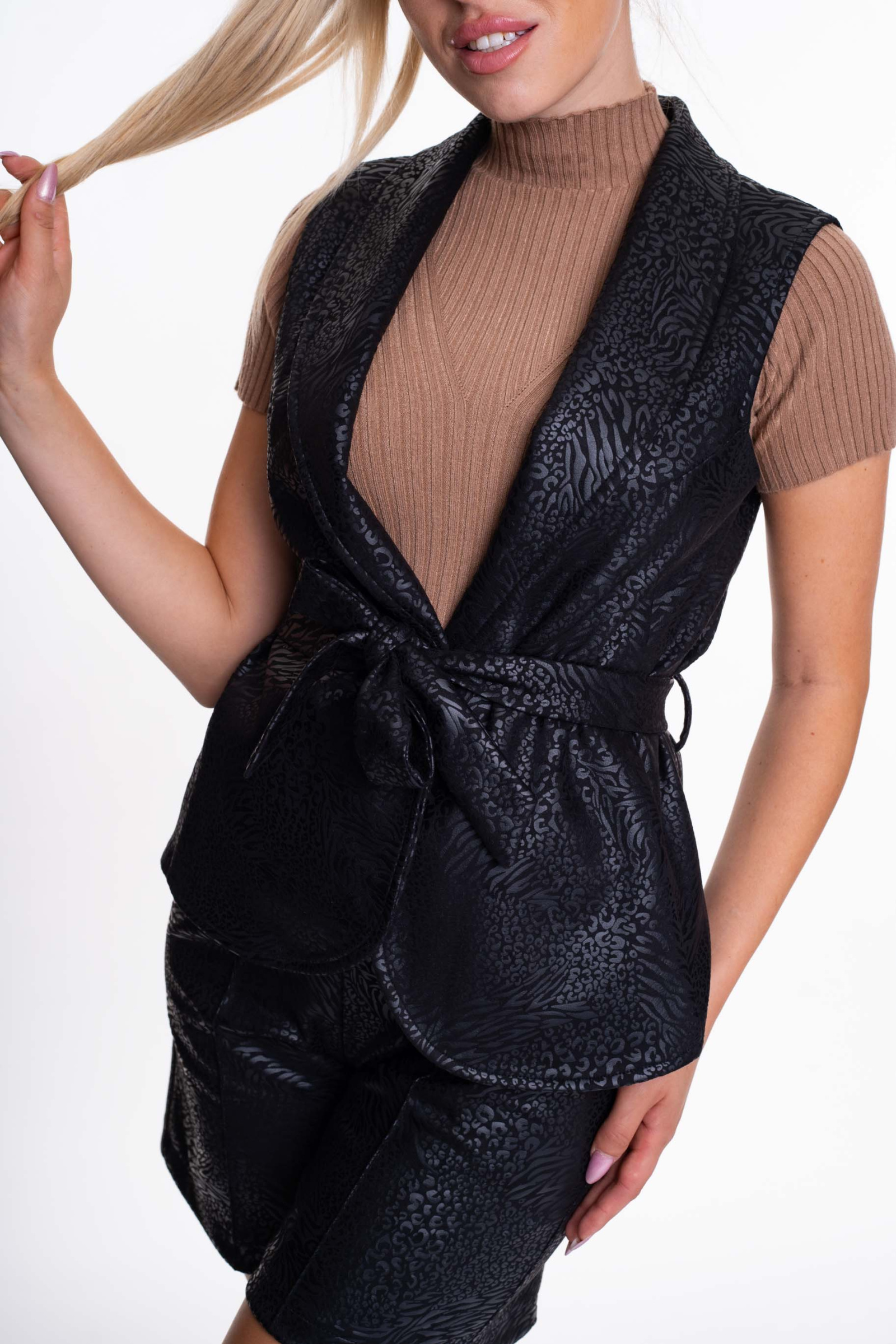 Elasztikus anyagból készült mellény, saját anyagából készült megkötős öv kiegészítővel.