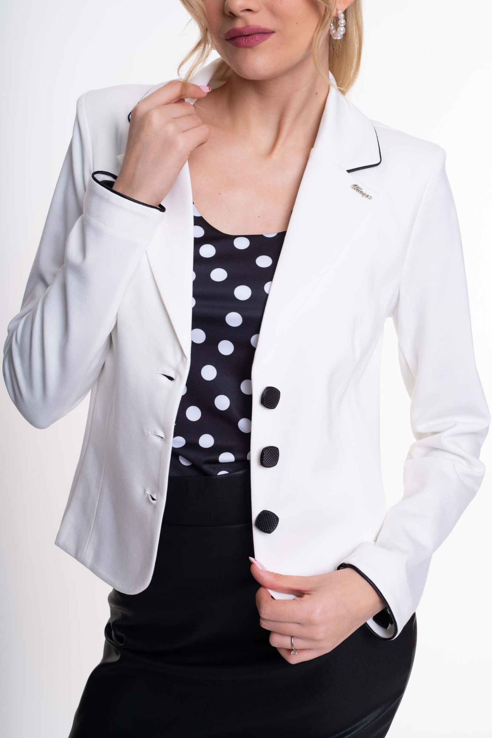 Elasztikus anyagból készült karcsúsított fazonú blézer válltöméssel, dísszegőkkel, gombos záródással, kis fém márkajelzéssel.