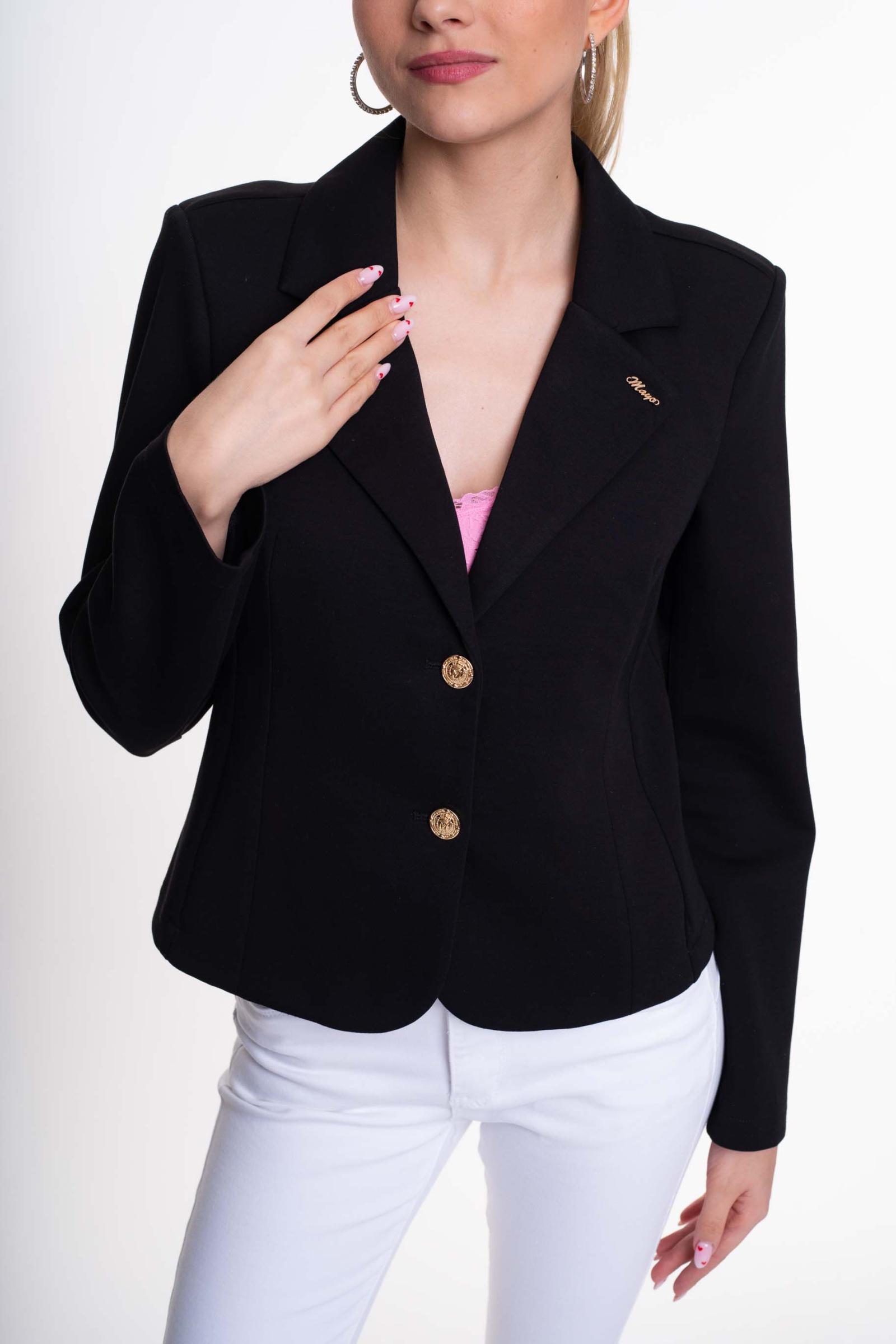 Elasztikus anyagból készült karcsúsított fazonú blézer válltöméssel, gombos záródással, kis fém márkajelzéssel.