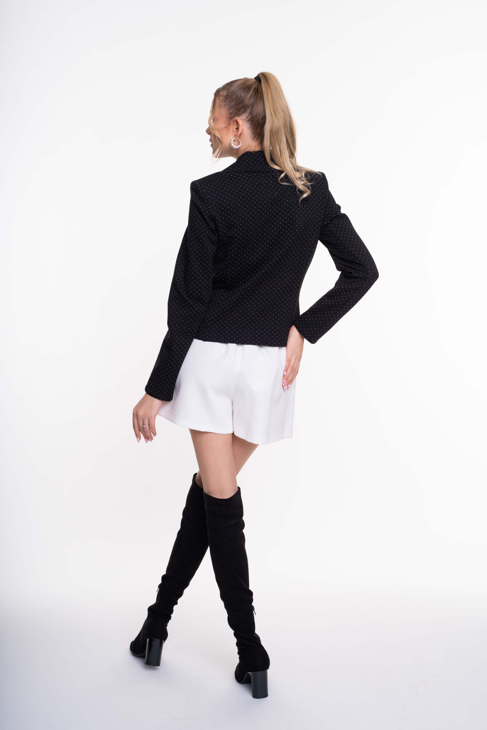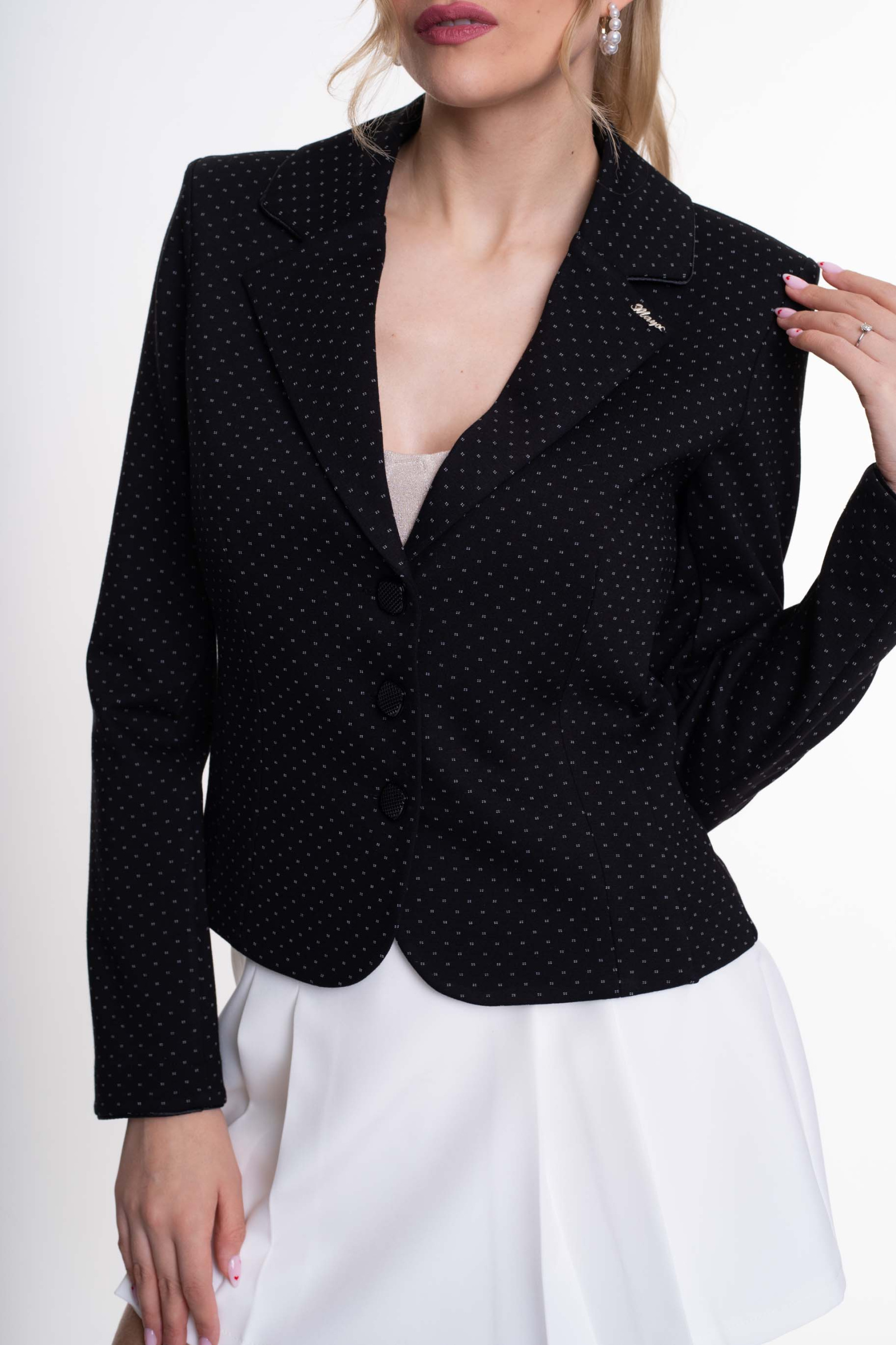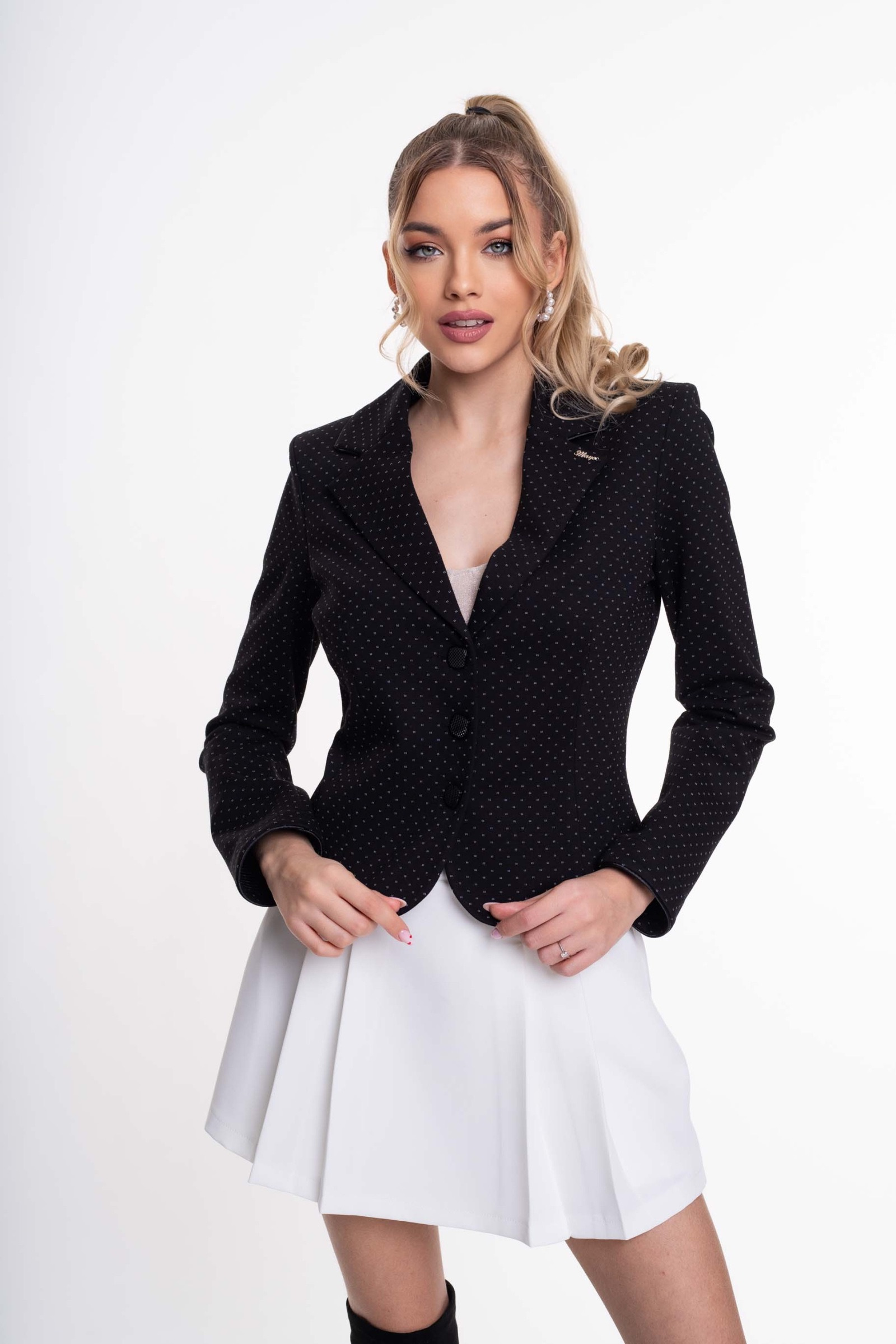 Elasztikus anyagból készült karcsúsított fazonú blézer válltöméssel, dísszegőkkel, gombos záródással, kis fém márkajelzéssel.