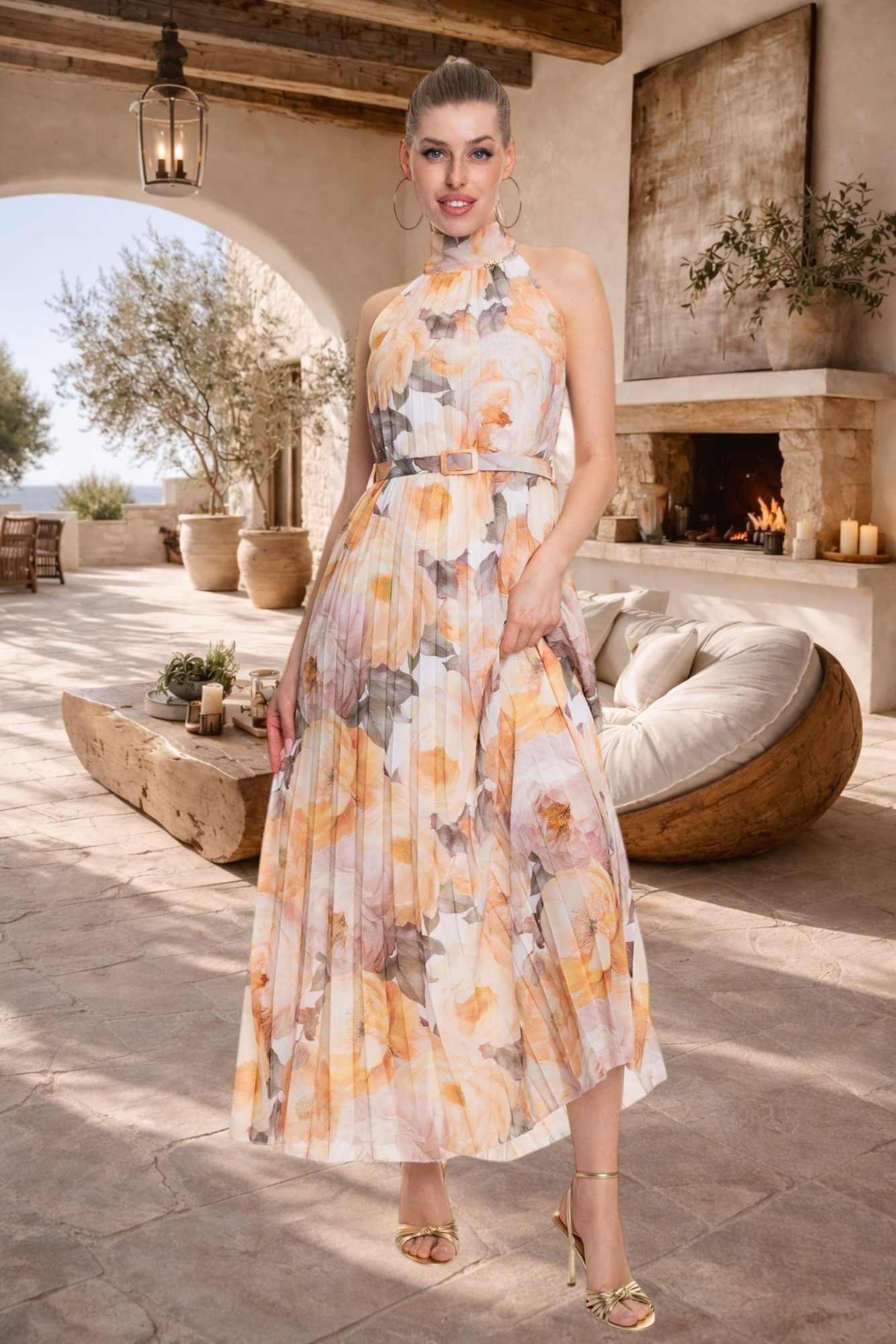 Fix, plisszírozott zsorzsett anyagból készült ruha bélelővel, nyakrészén megkötővel, öv kiegészítővel, mosáshoz levehető fém bross márkajelzéssel.