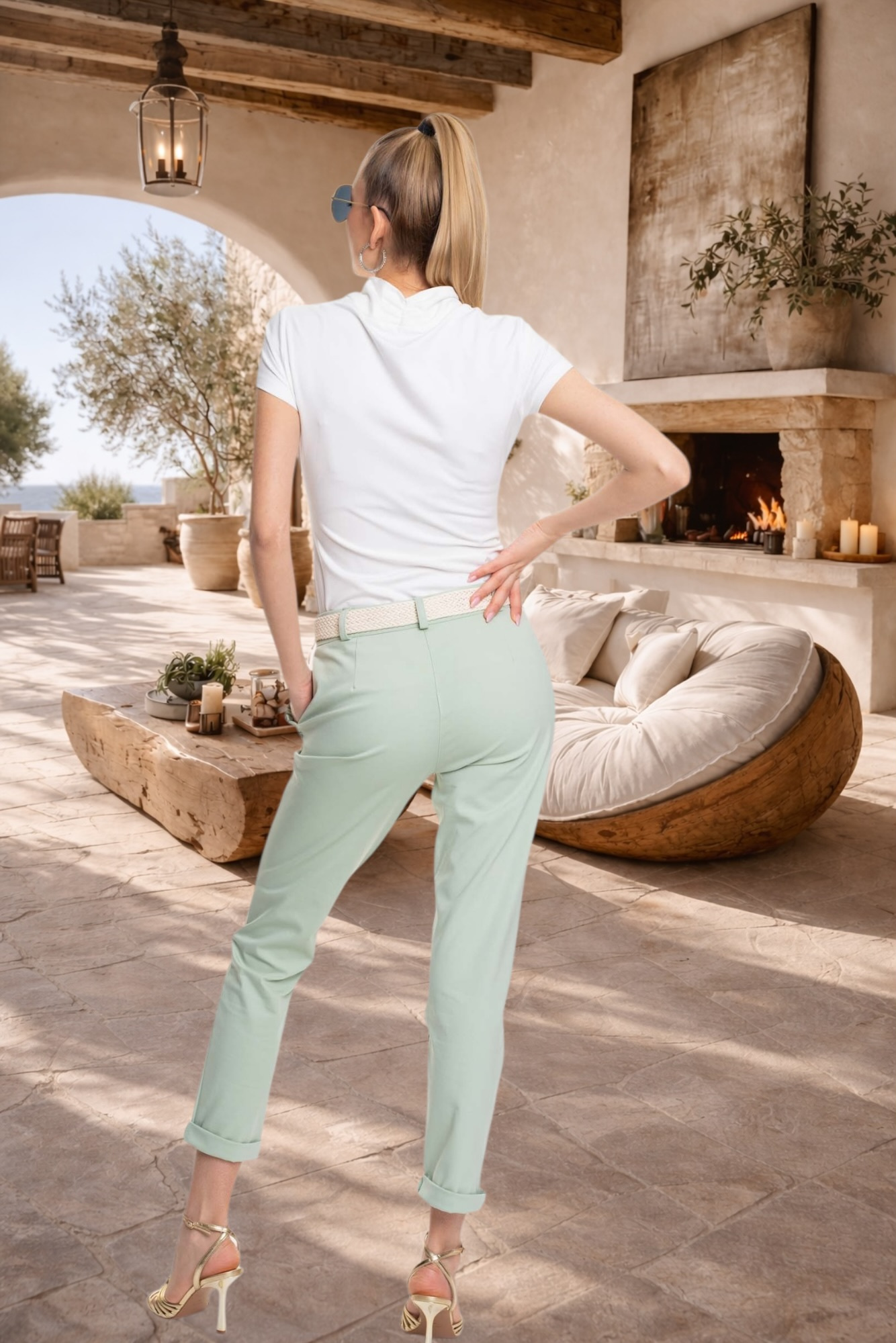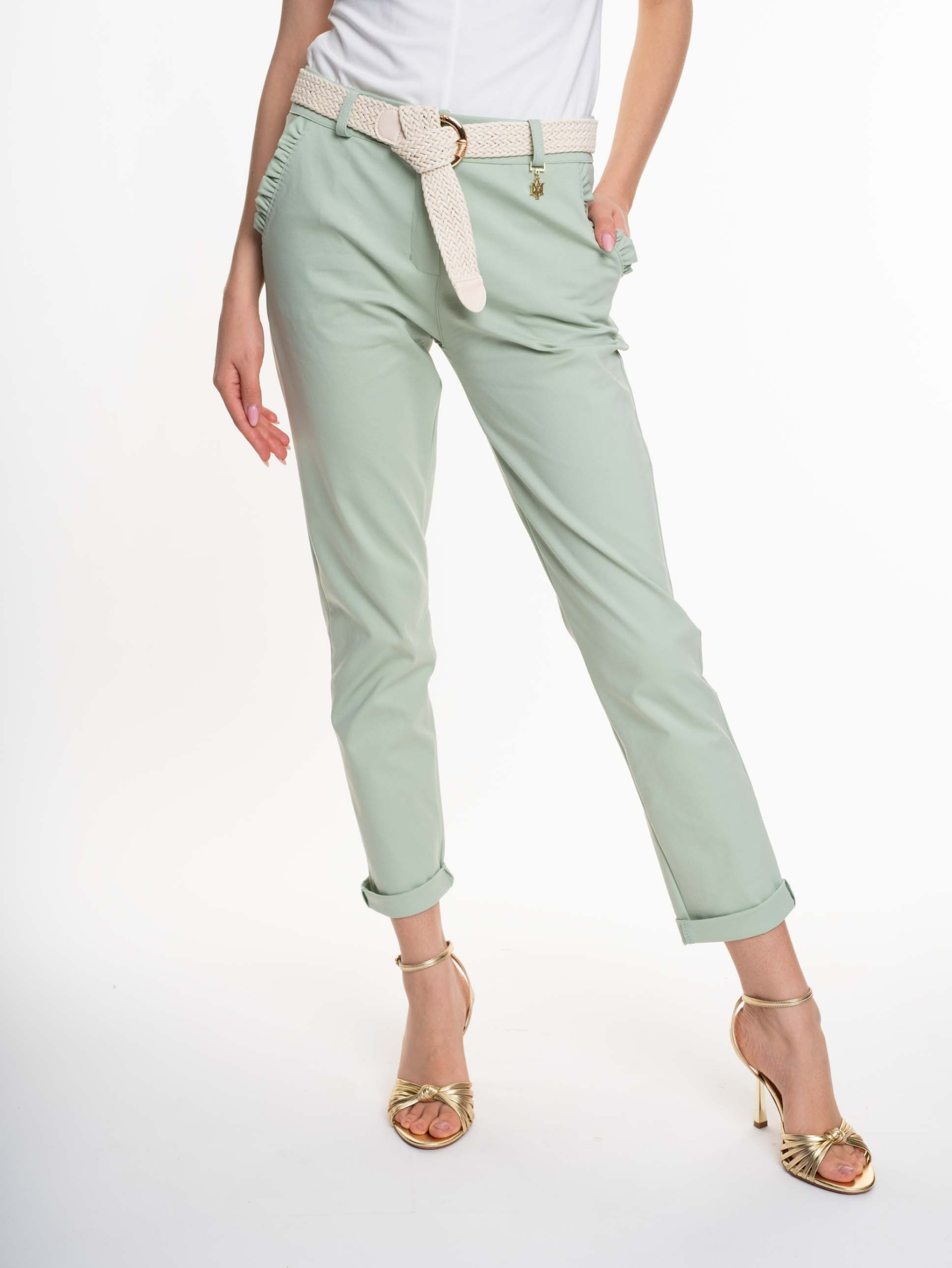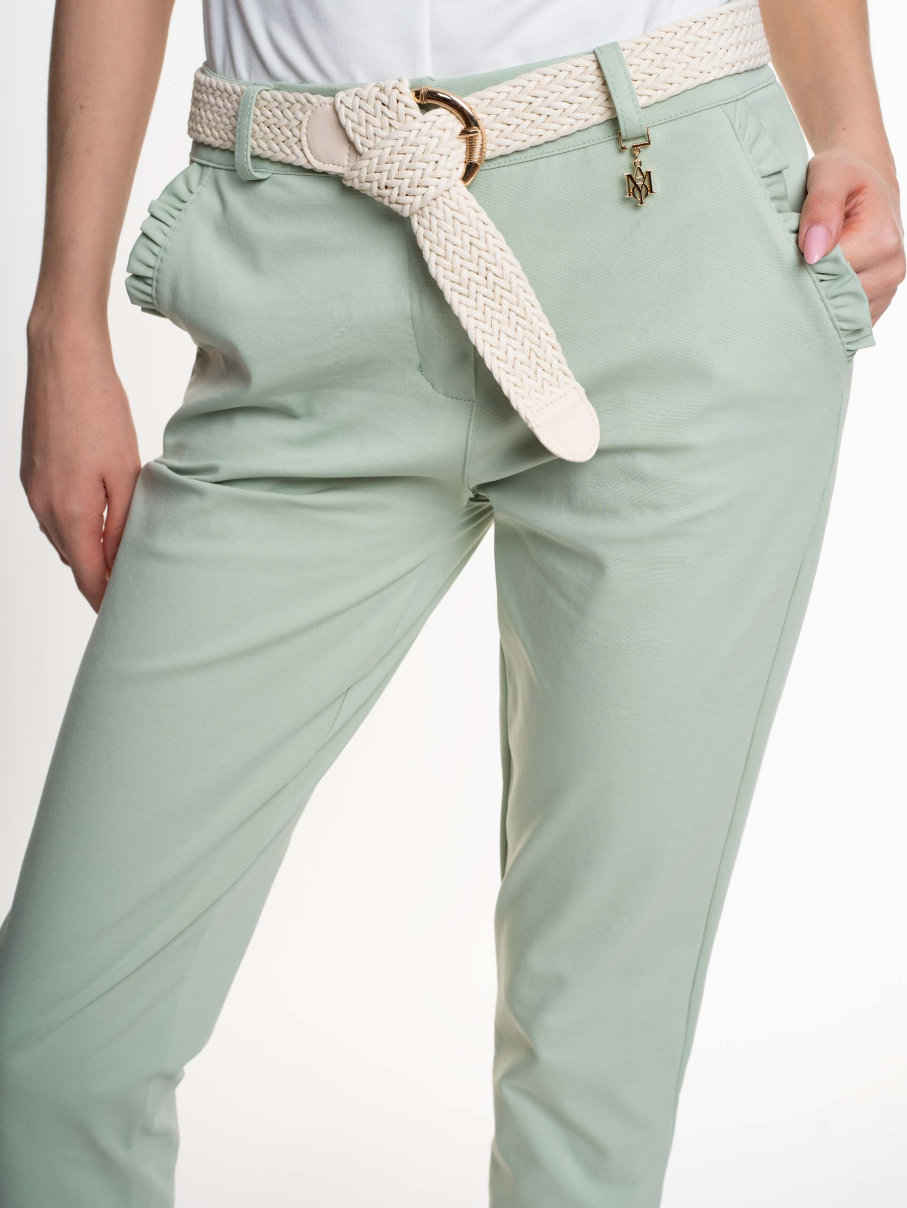 Elasztikus anyagból készült nadrág fodros díszítésű zsebekkel, öv kiegészítővel, mosáshoz levehető kis fém márkajelzéssel.