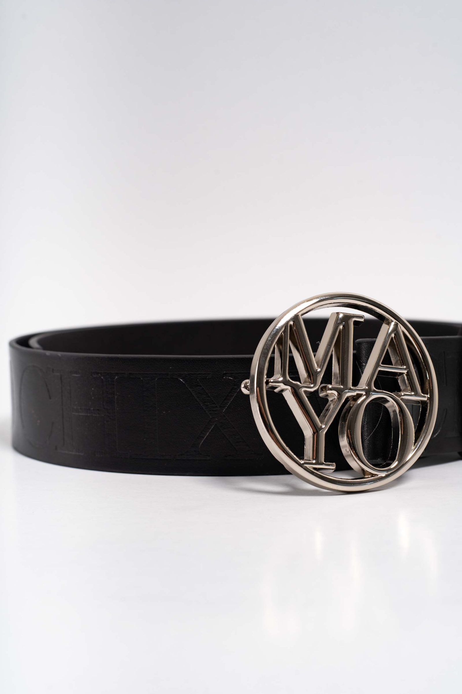 Matt műbőr öv dombornyomással, kerek ezüst színű csattal.