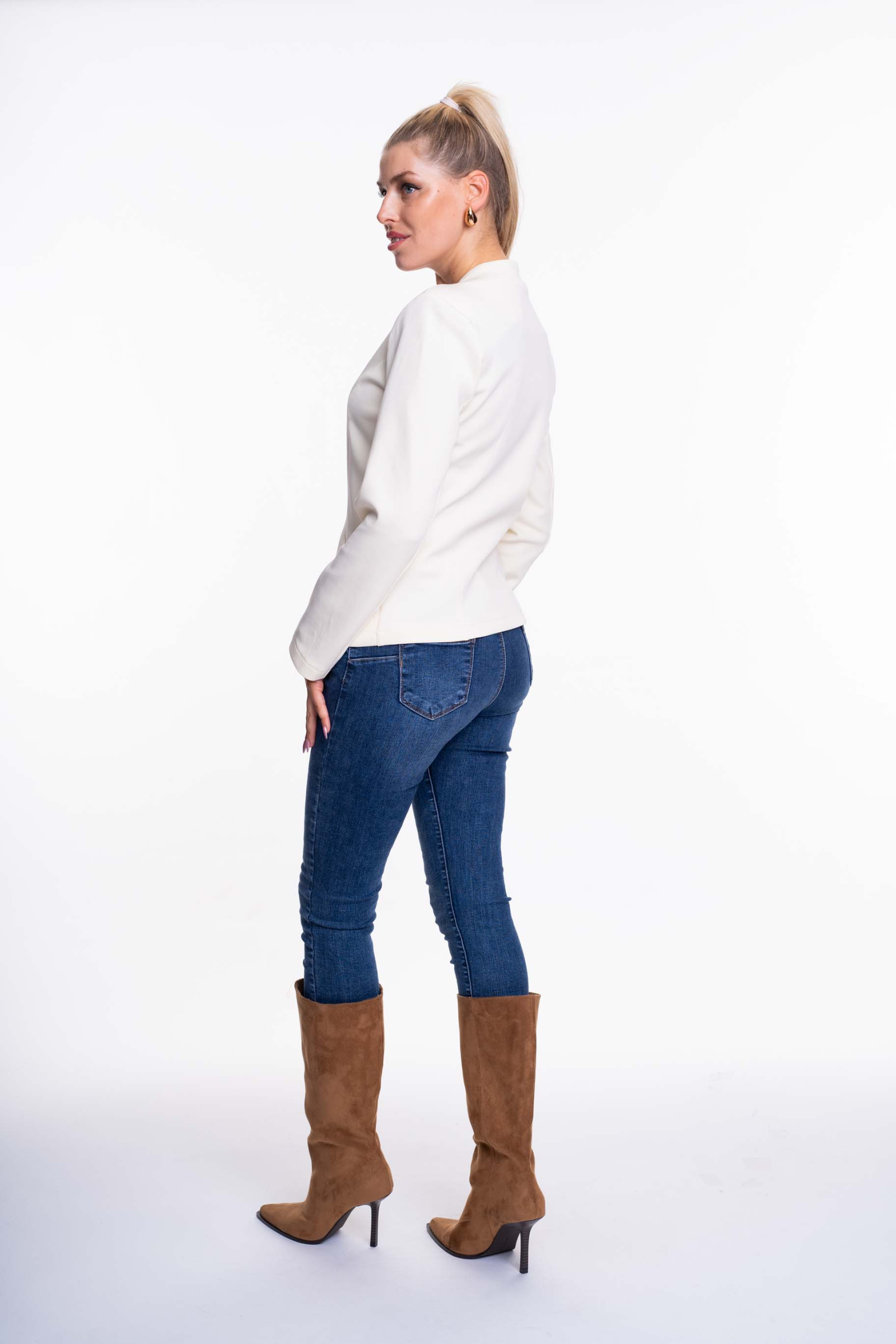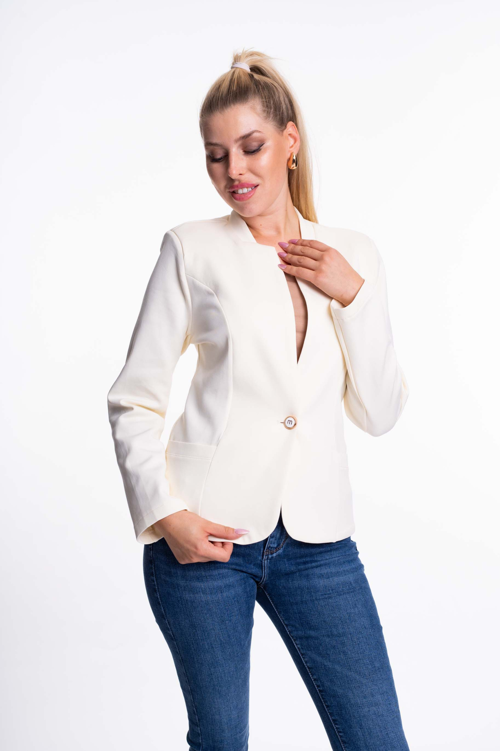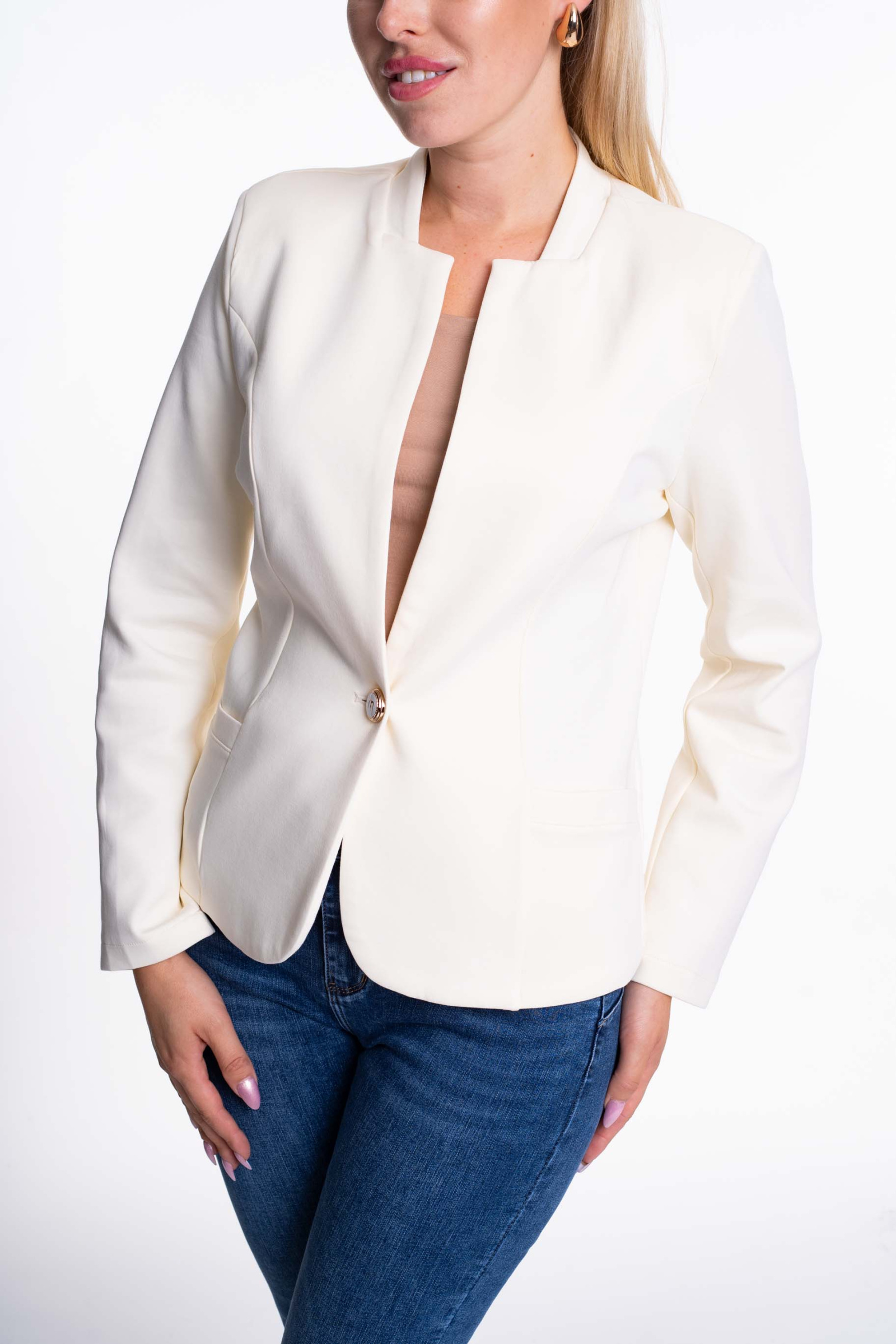 Elasztikus anyagból készült letisztult fazonú, zsebes blézer, emelt nyakrésszel, egy gombos záródással és válltöméssel.