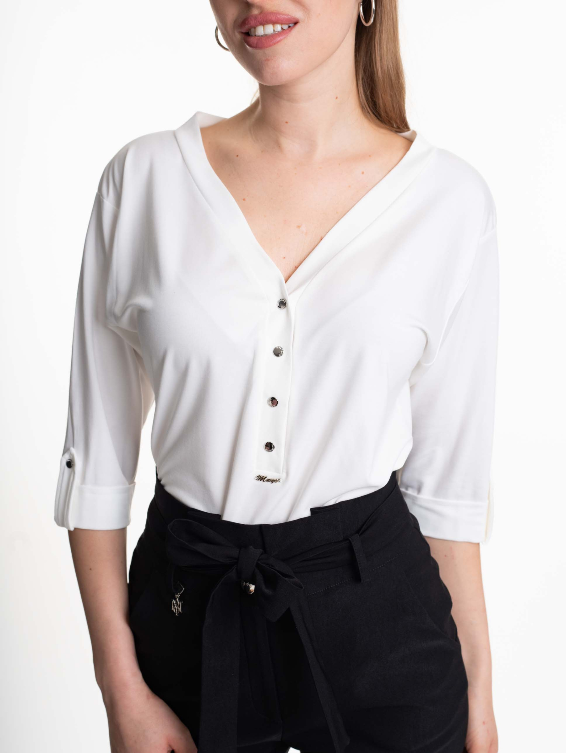 Elasztikus anyagból készült, lezser szabásvonalú felső, patentos záródással, kis fém márkajelzéssel.