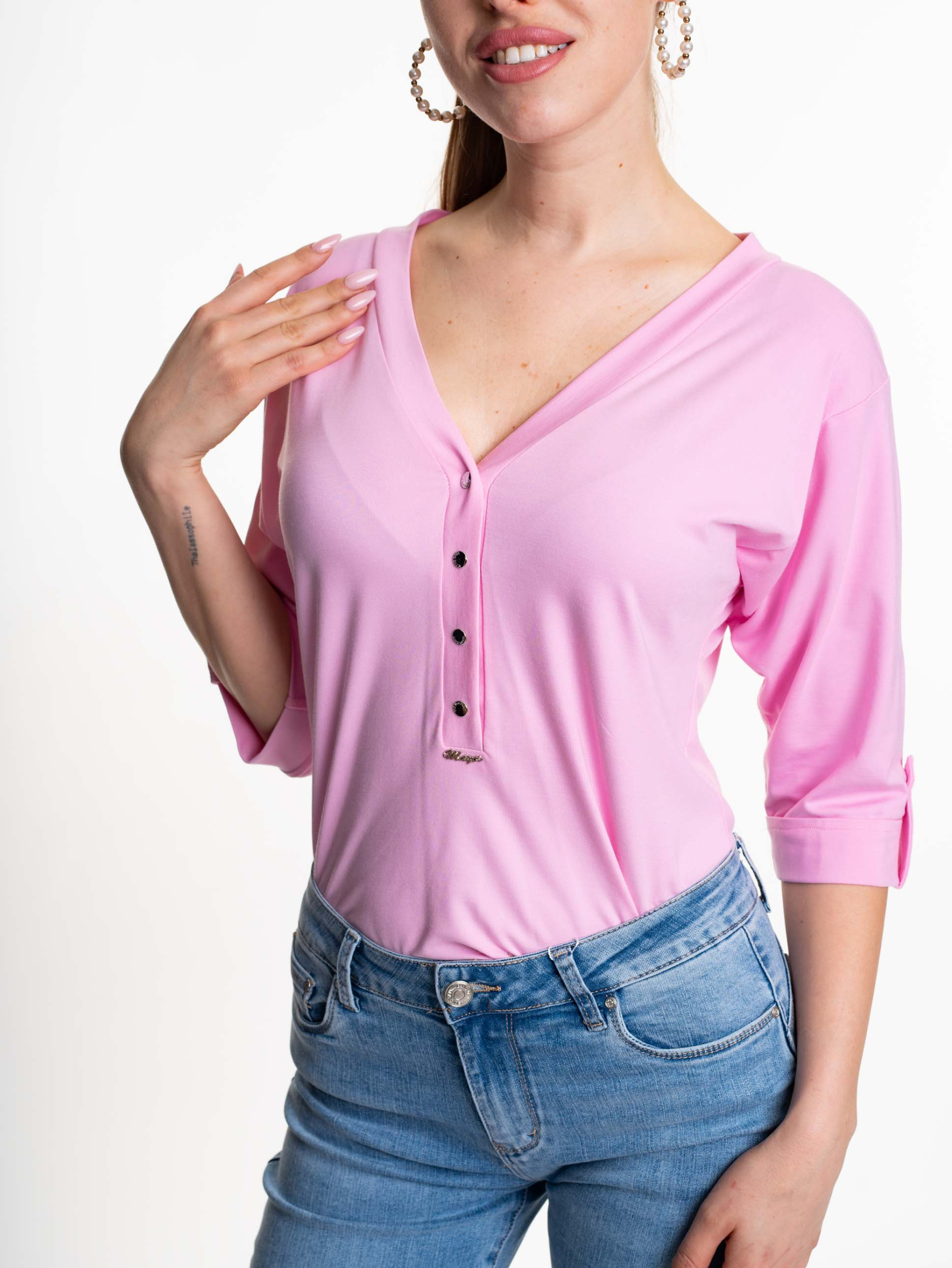 Elasztikus anyagból készült, lezser szabásvonalú felső, patentos záródással, kis fém márkajelzéssel.