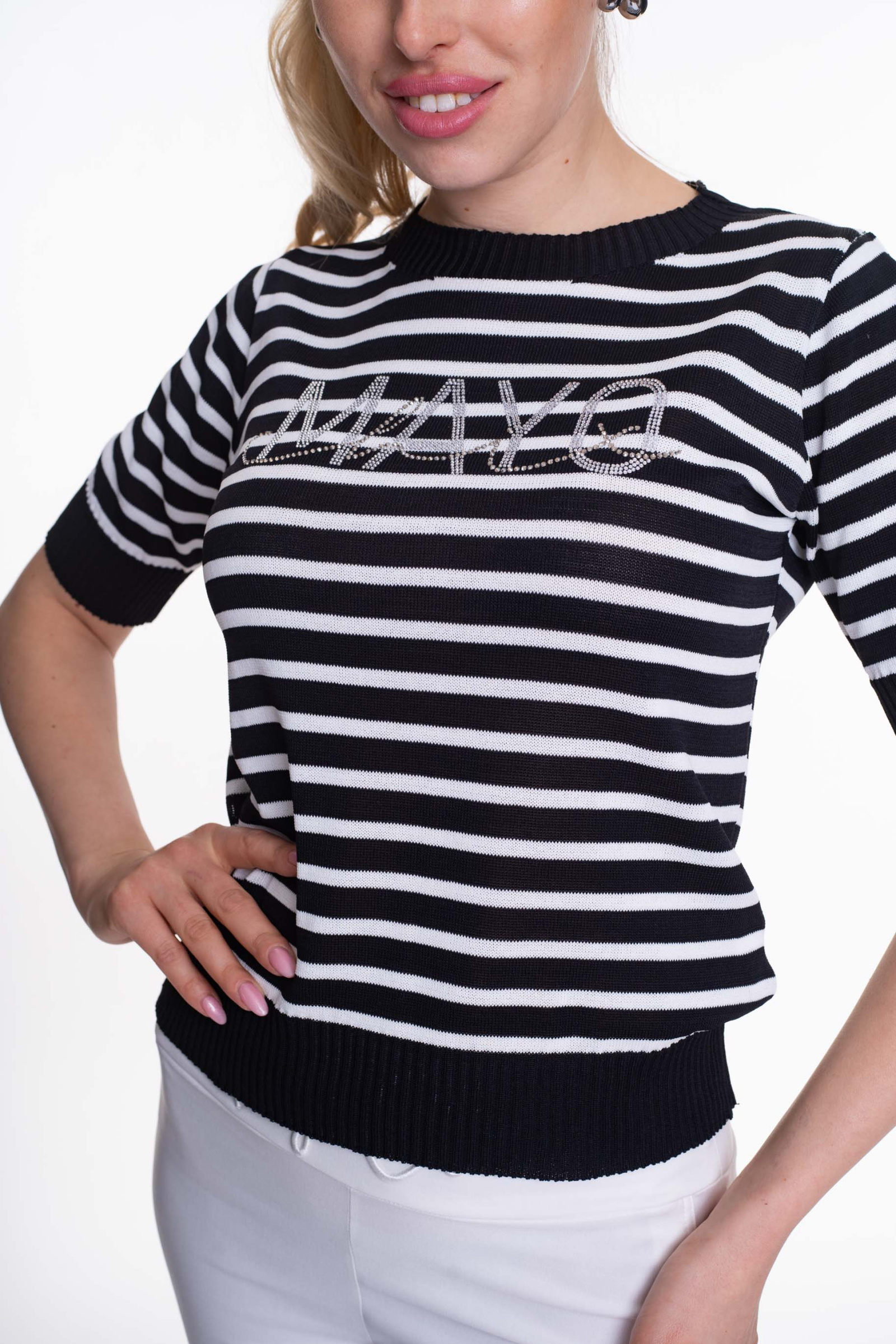 Vékony kötött anyagú, lezser szabásvonalú pulóver, strasszköves márkajelzéssel.