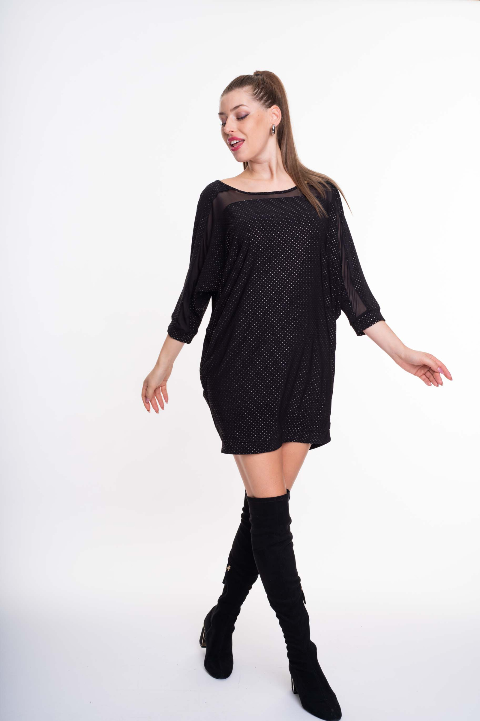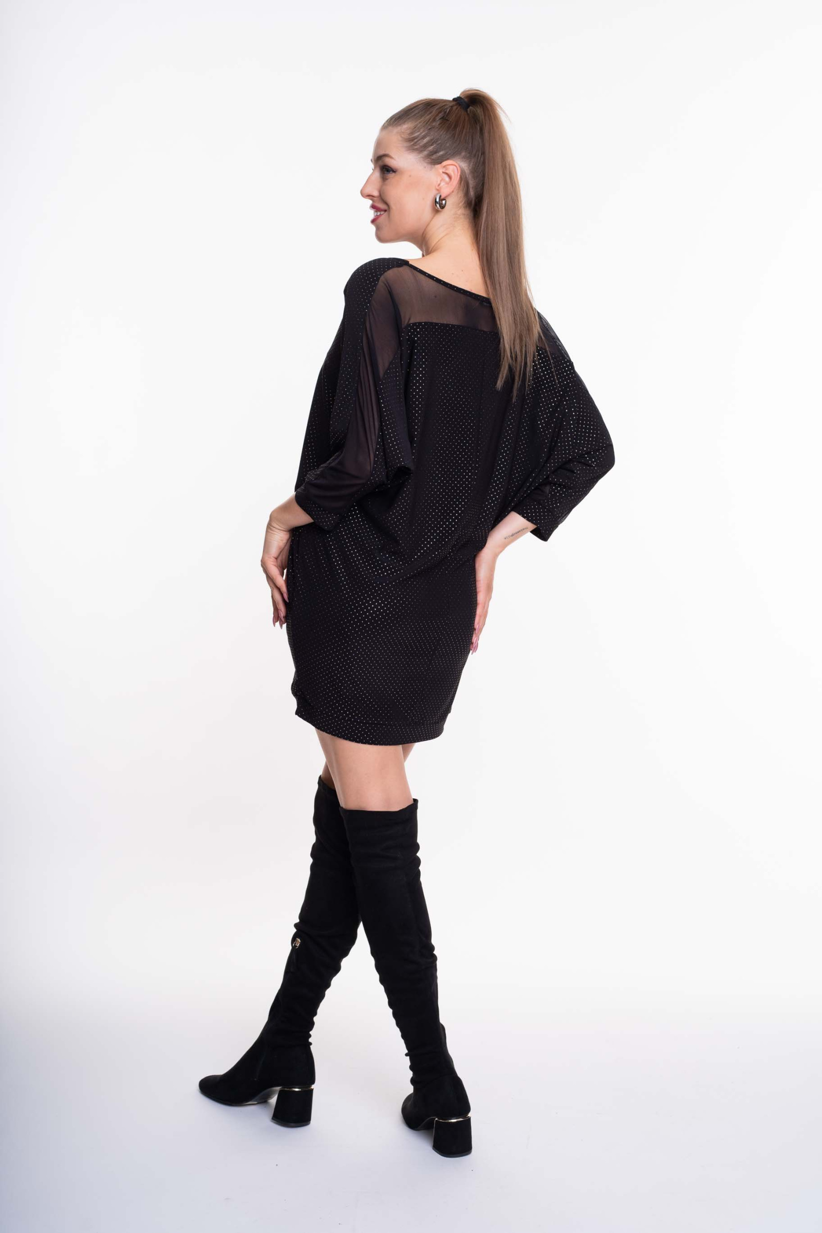 Elasztikus anyagból készült, bő szabású tunika necc anyaggal kombinálva, kis fém márkajelzéssel.