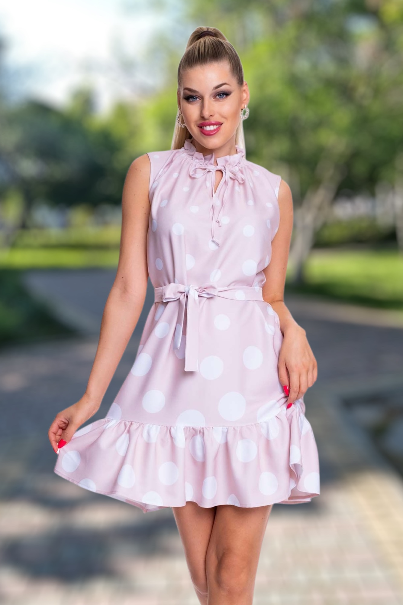 Enyhén elasztikus anyagból készült, lezser szabásvonalú ruha fodros alja résszel, saját anyagából készült megkötővel, gumírozott nyakrésszel, kis fém márkajelzéssel.