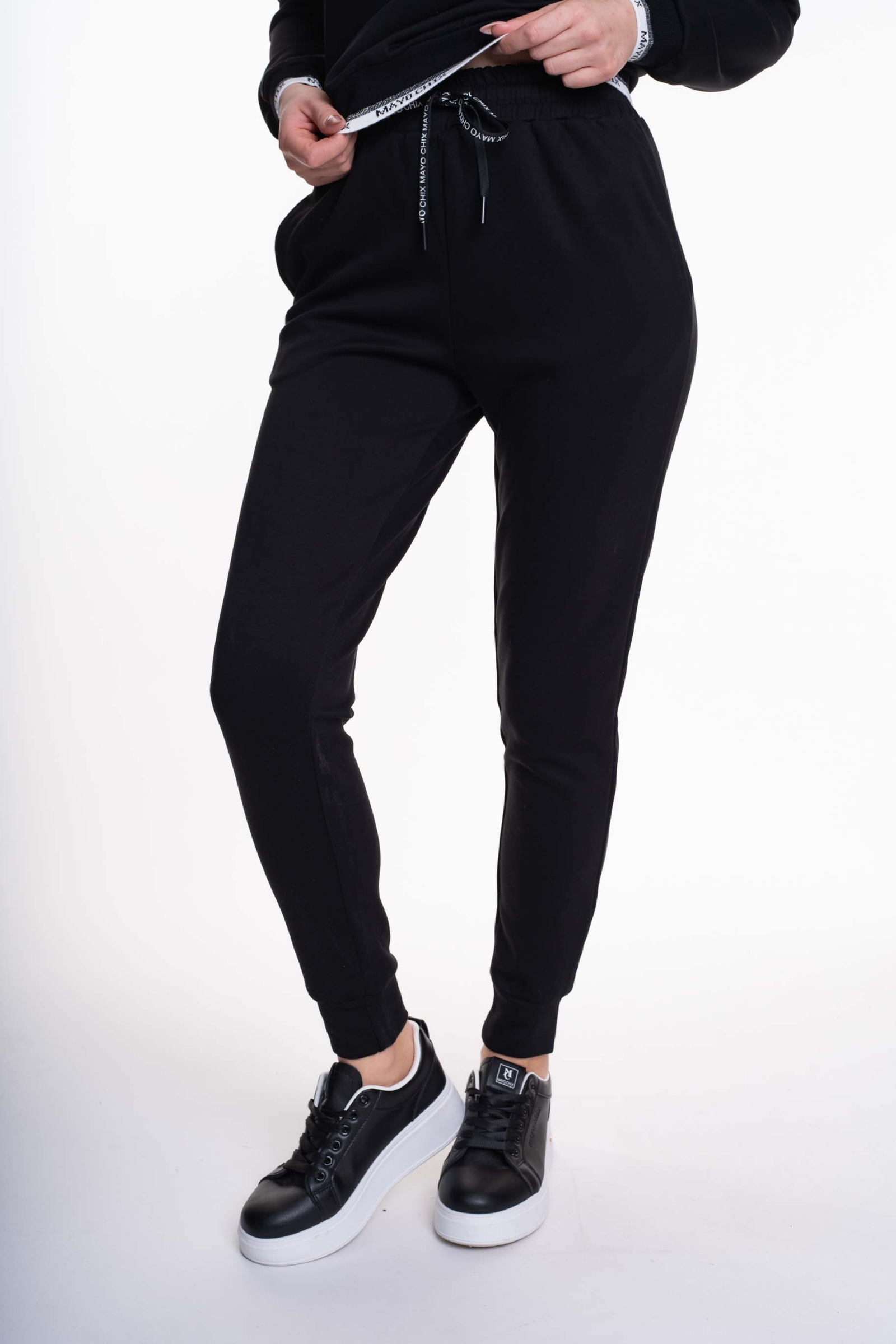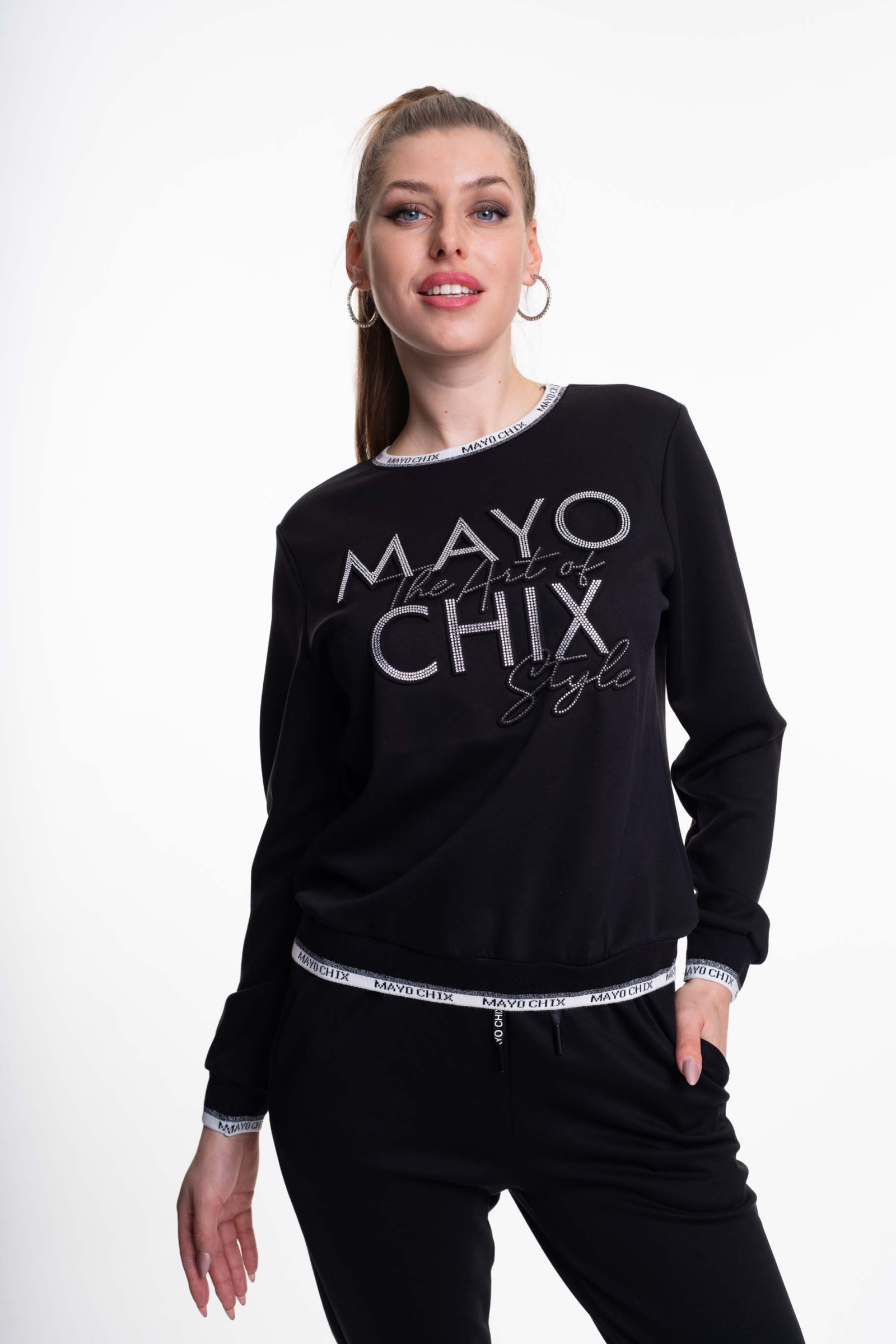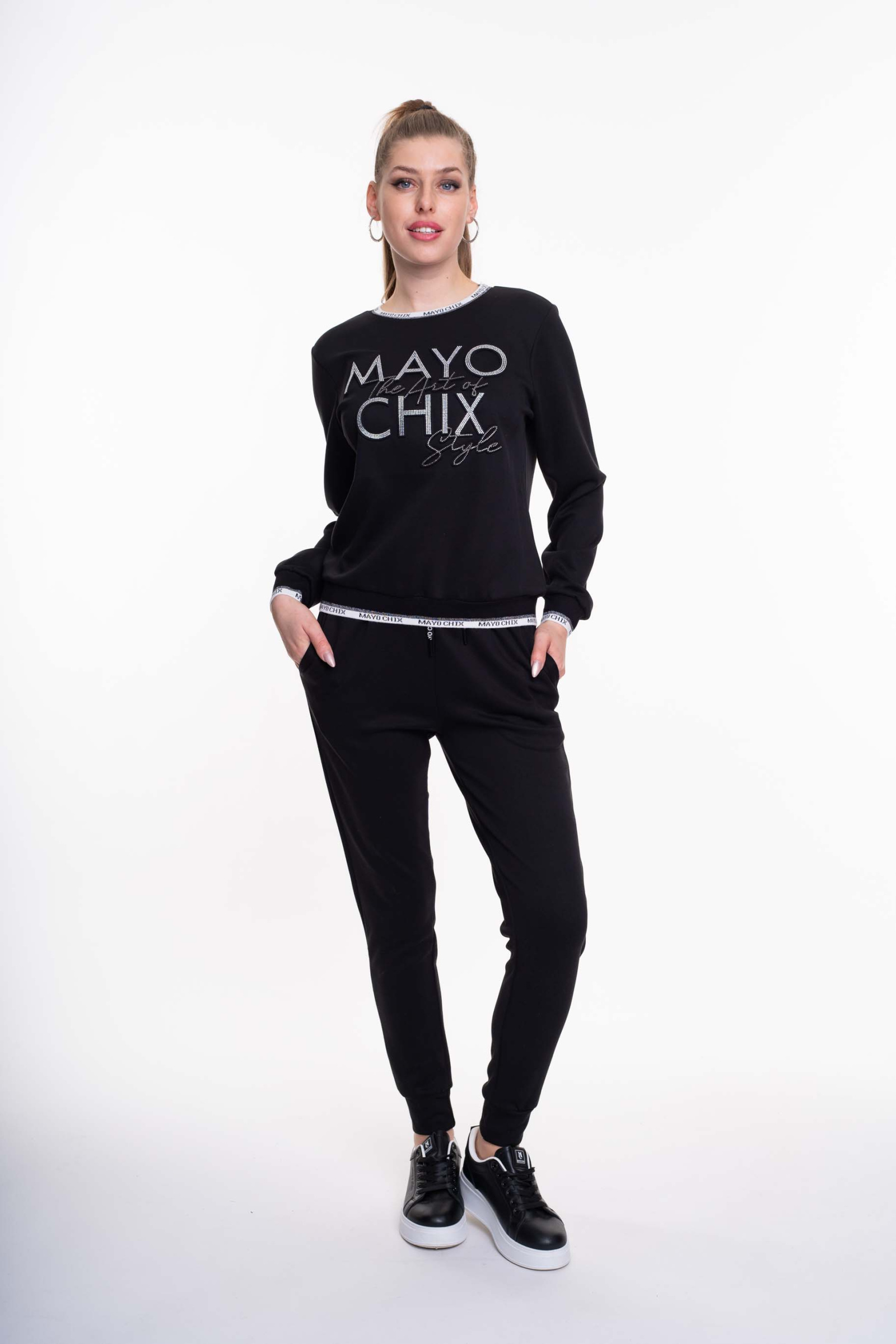 Elasztikus anyagból készült, sportos melegítőegyüttes, gumis derekú, zsebes alsó résszel, lezser fazonú pulóverrel, matrica nyomott díszítésekkel.