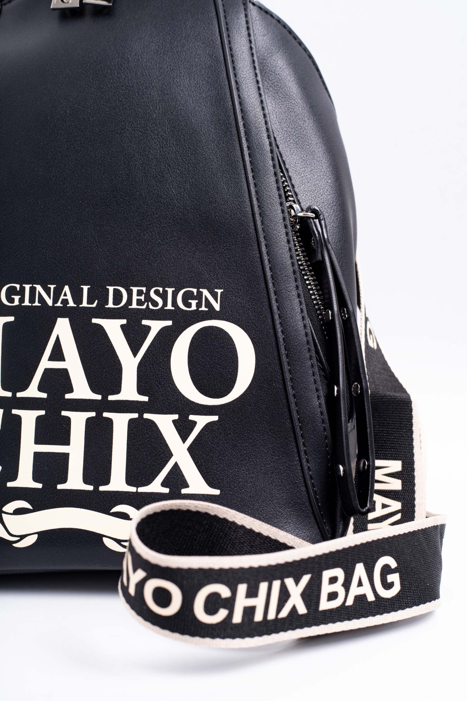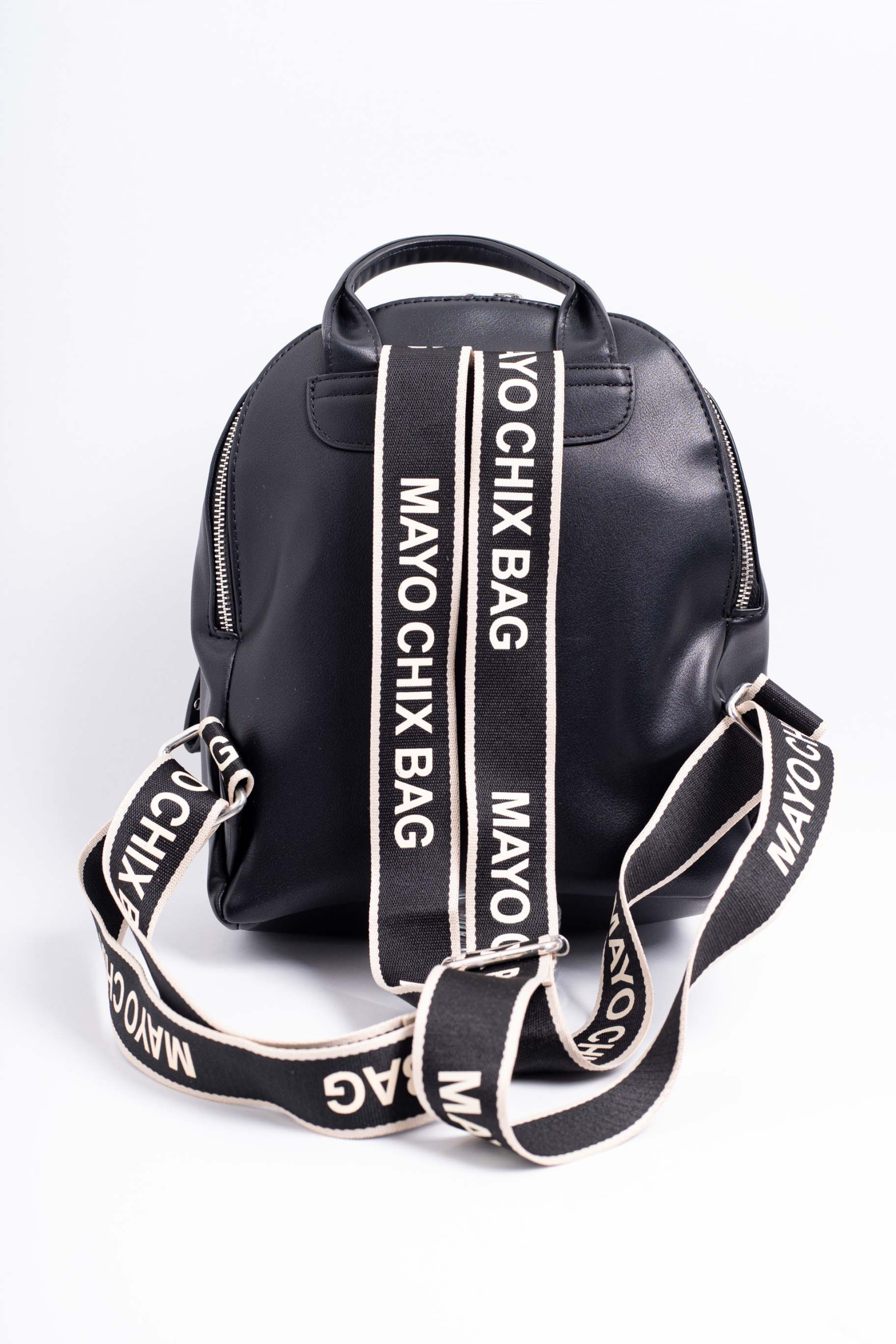 Műbőrből készült, közepes méretű hátizsák zsebekkel, fém márkajelzéssel.