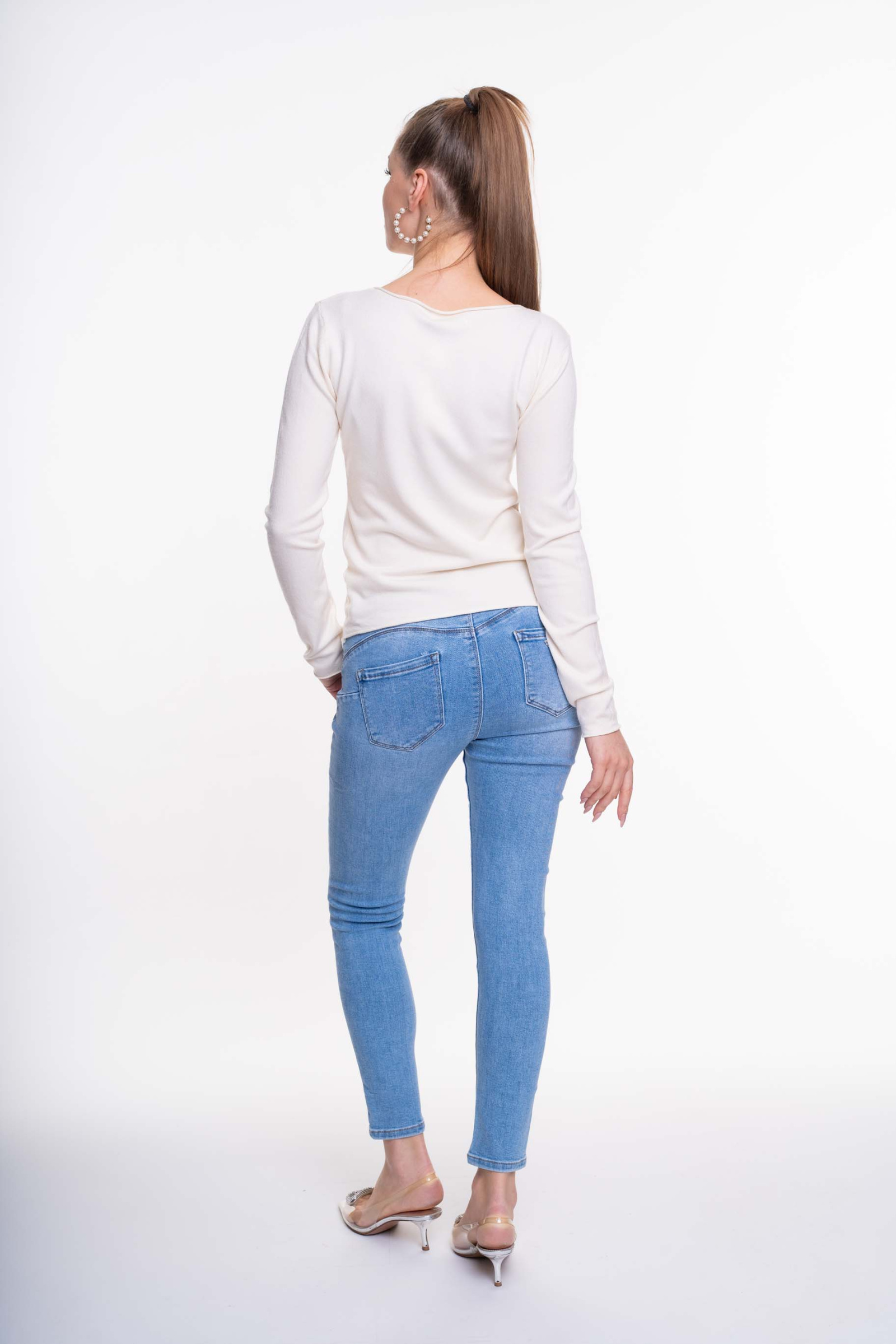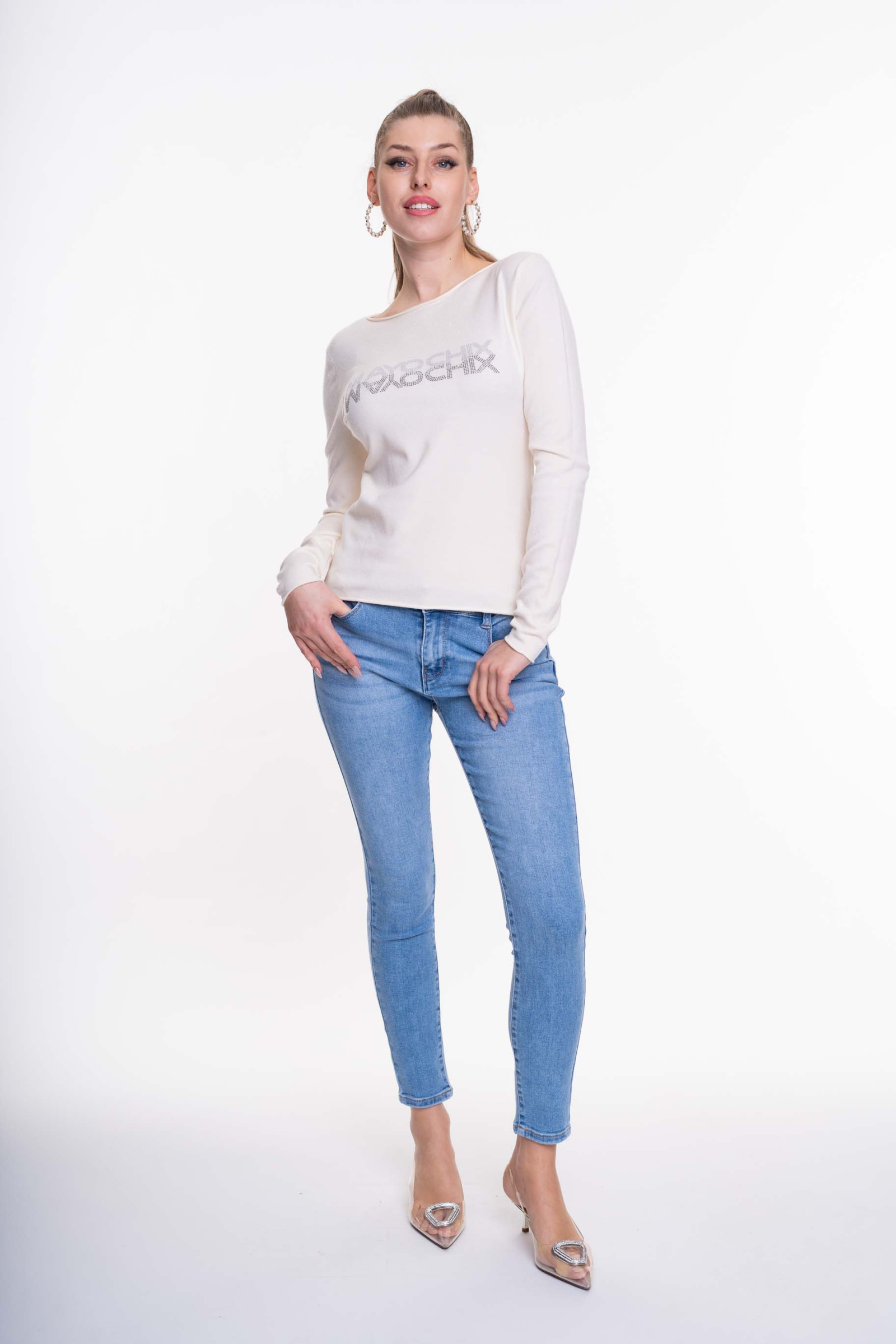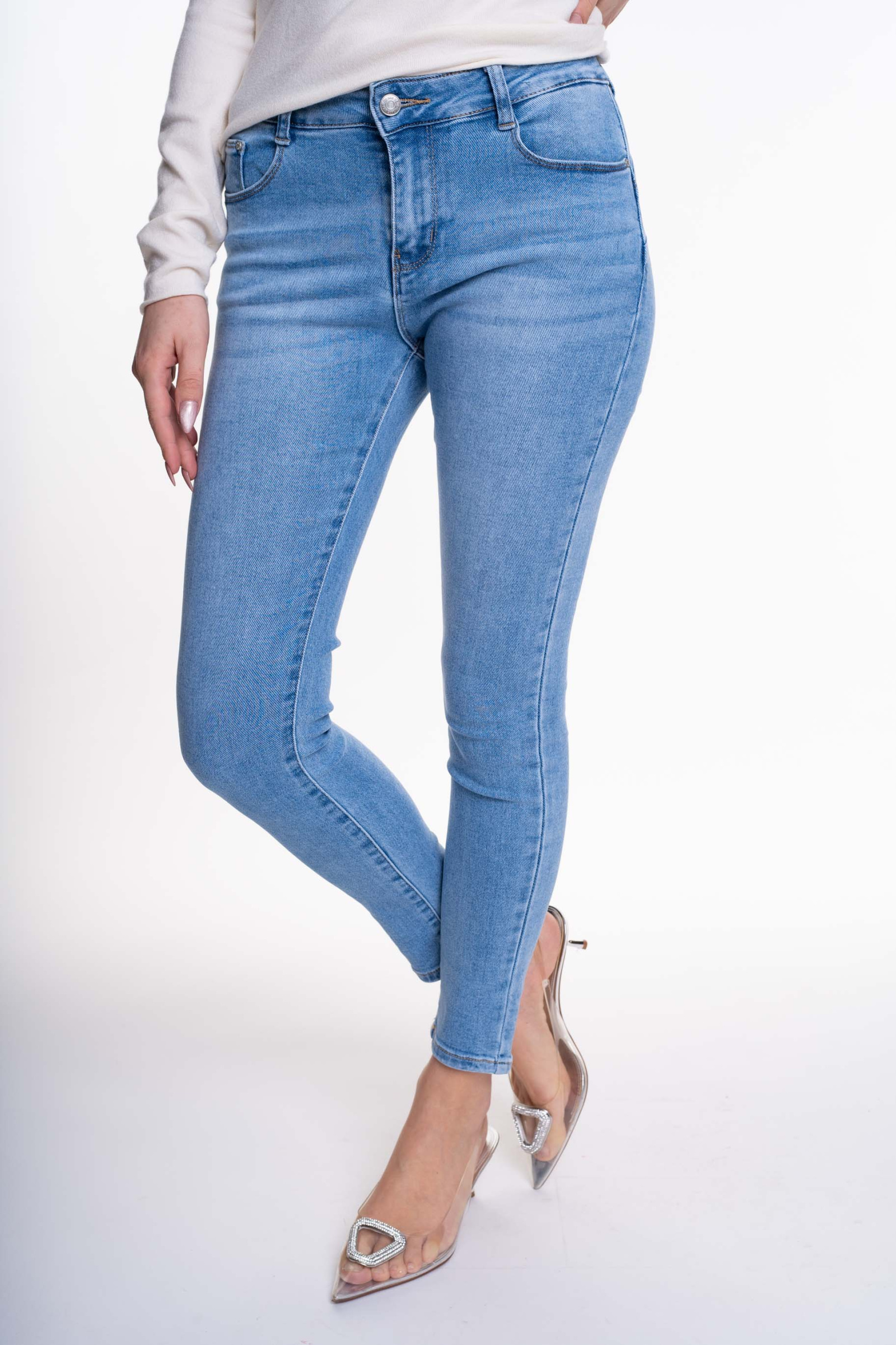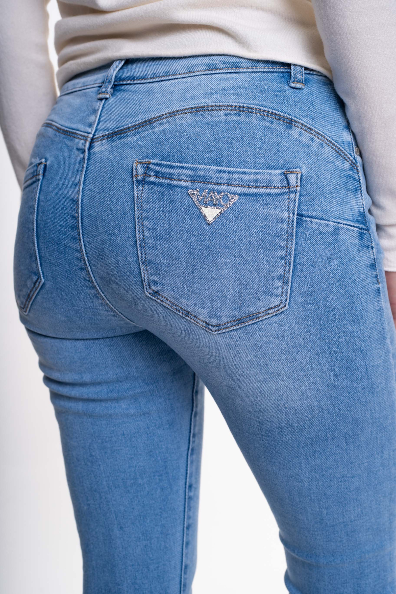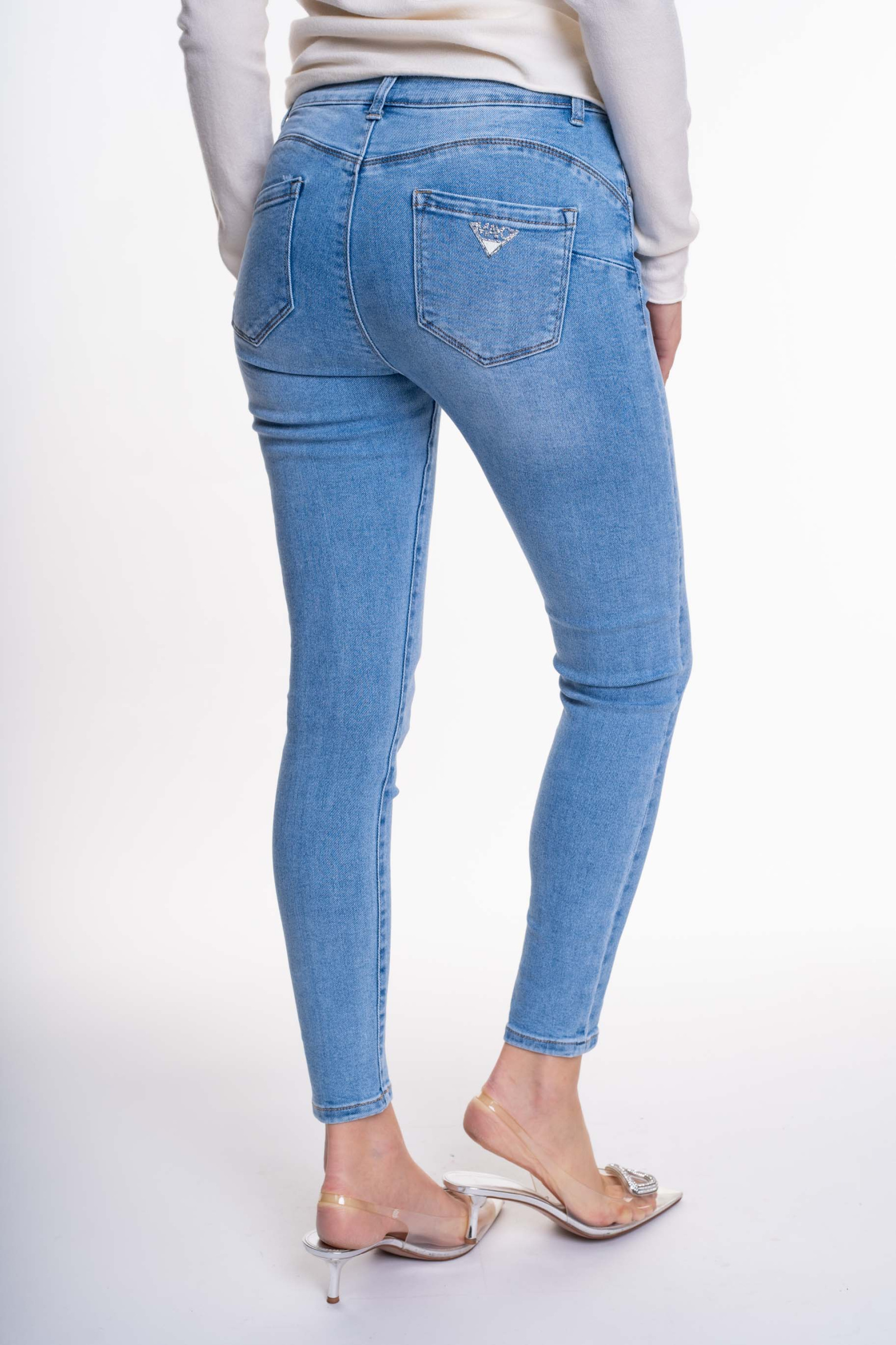 Elasztikus anyagból készült, szűk szárú farmernadrág, strasszköves matrica nyomott márkajelzéssel.