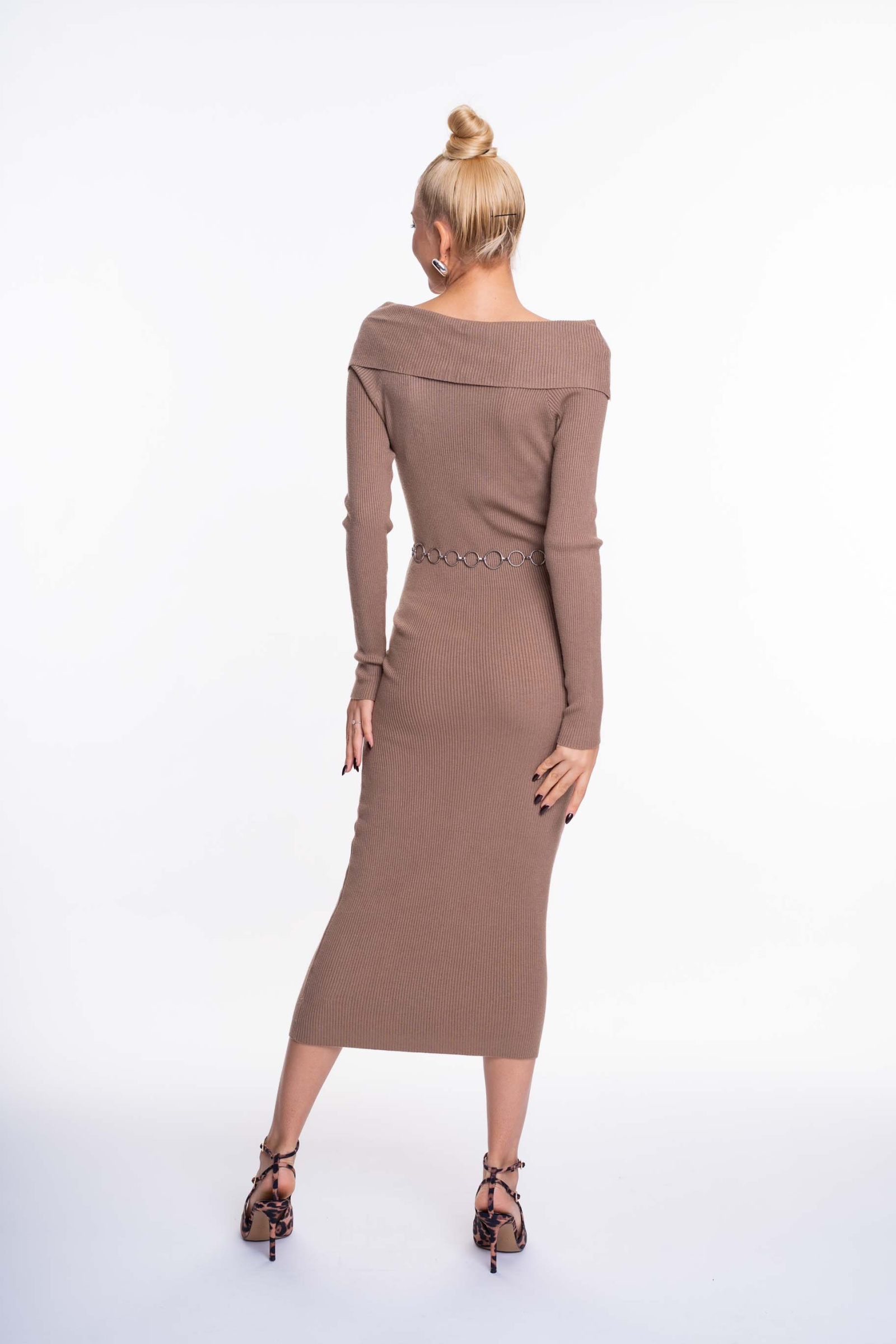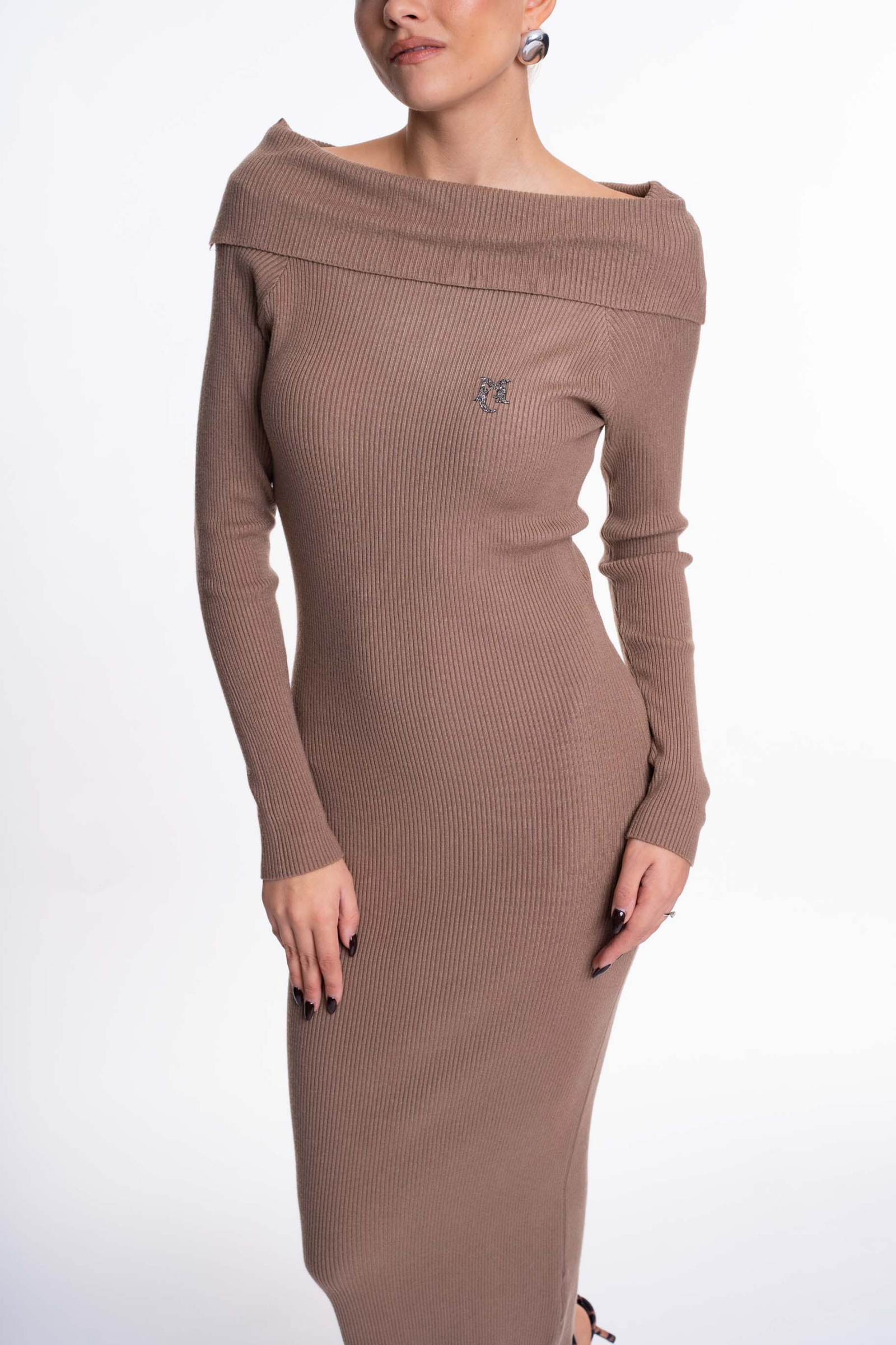 Bordás, kötött anyagból készült csónak nyakú ruha, strasszos matrica nyomott márkajelzéssel.