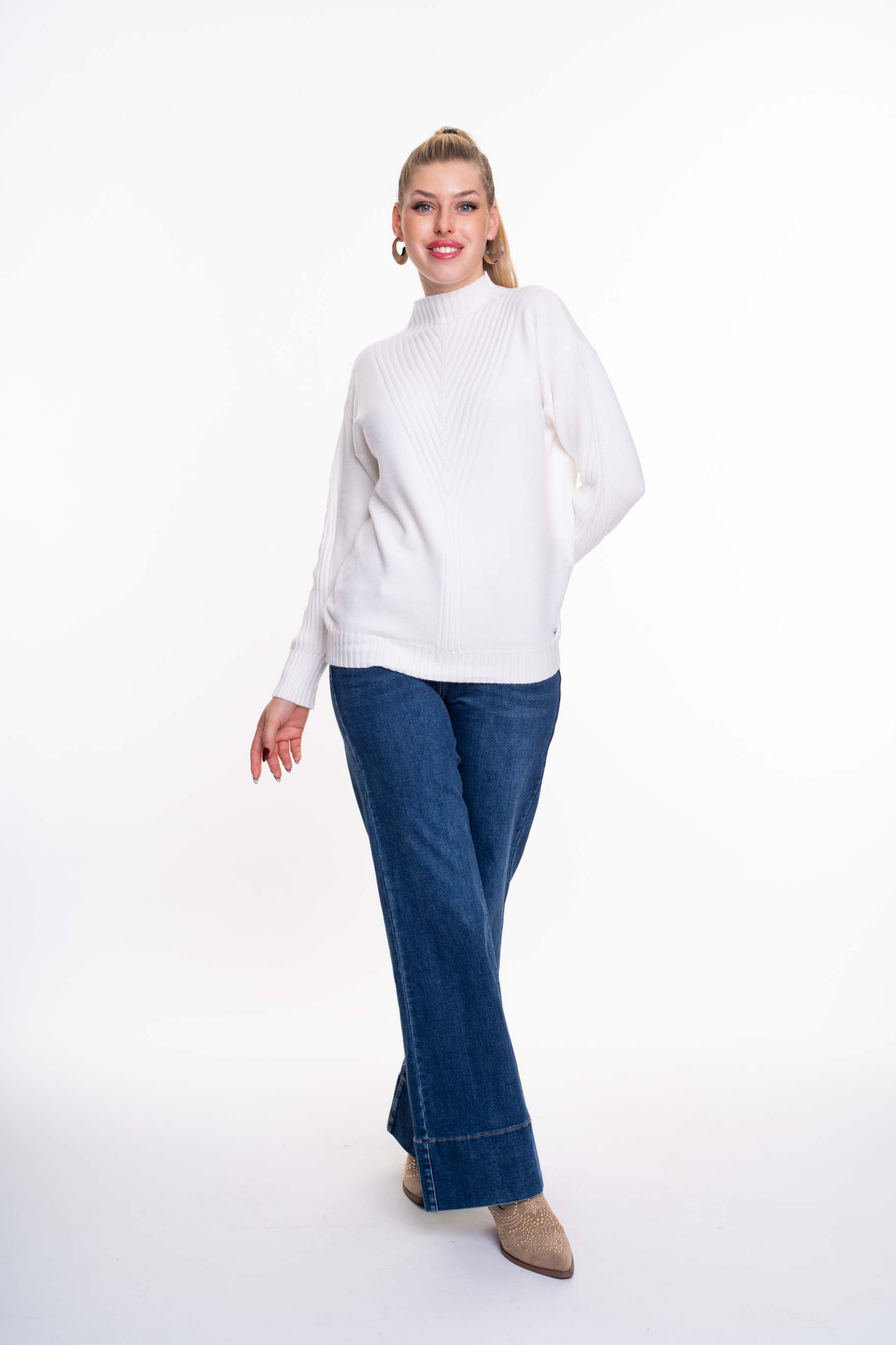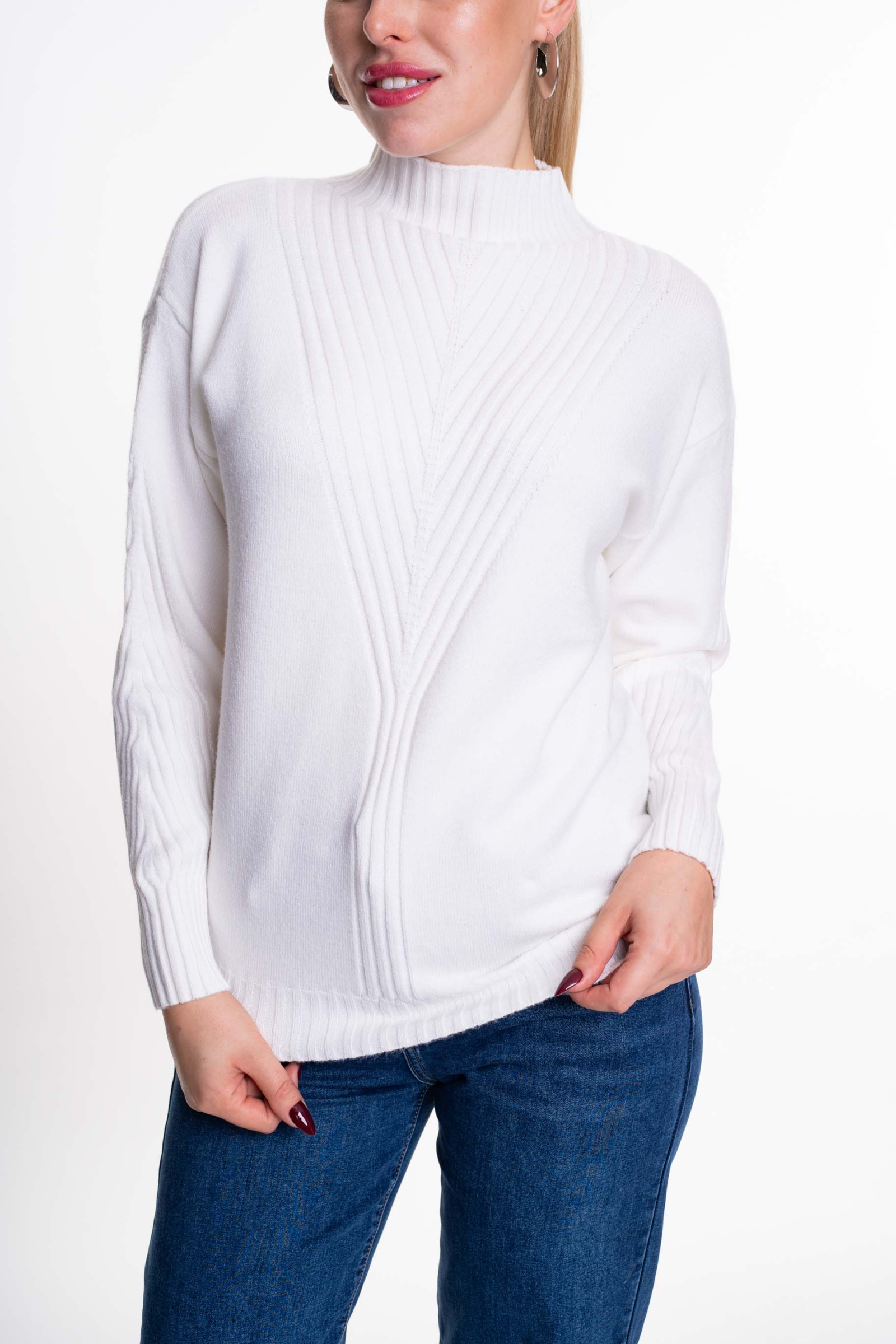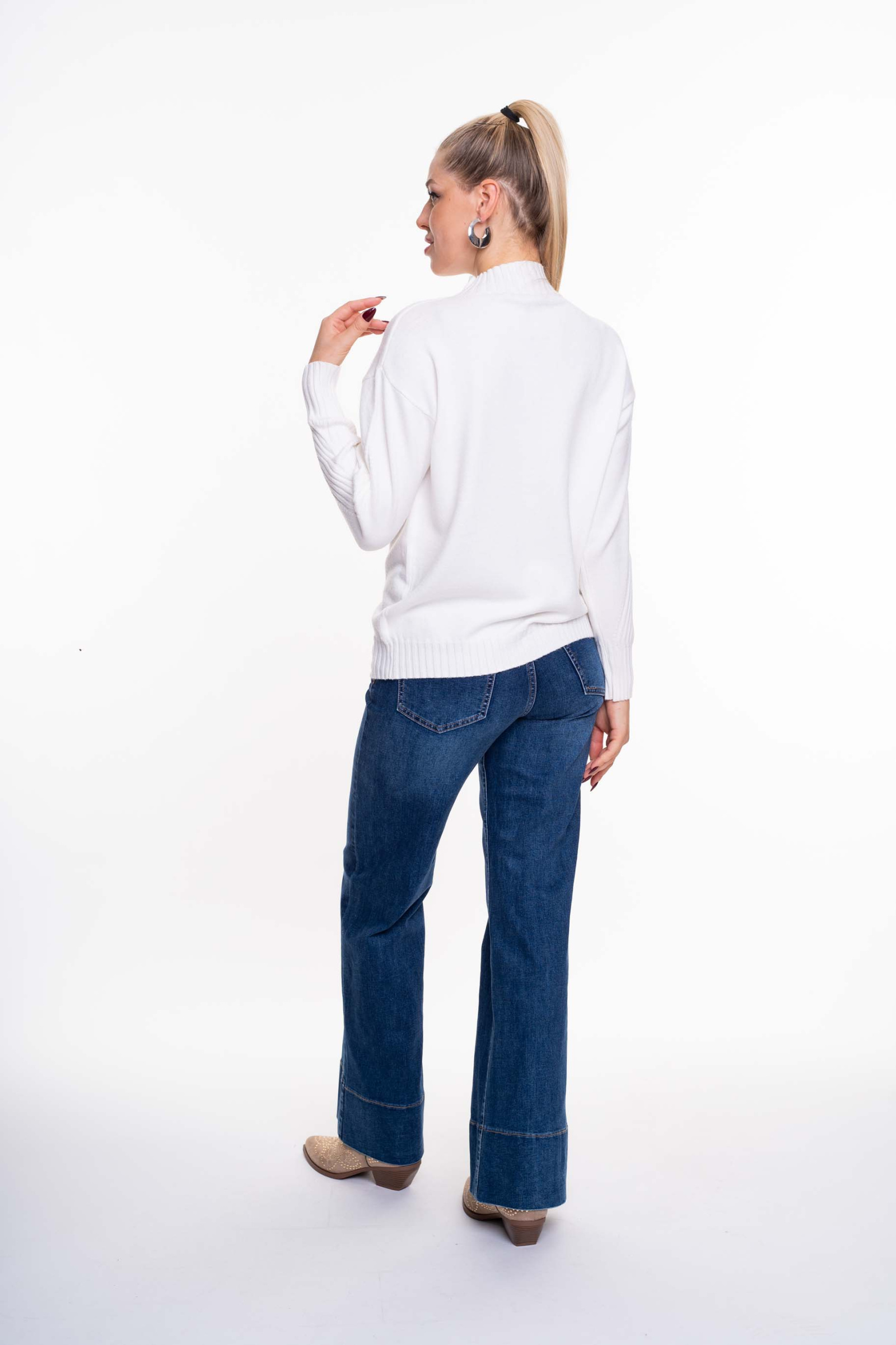 Vékony, kötött anyagú, lezser szabásvonalú pulóver emelt nyakrésszel, alján kis fém márkajelzéssel.