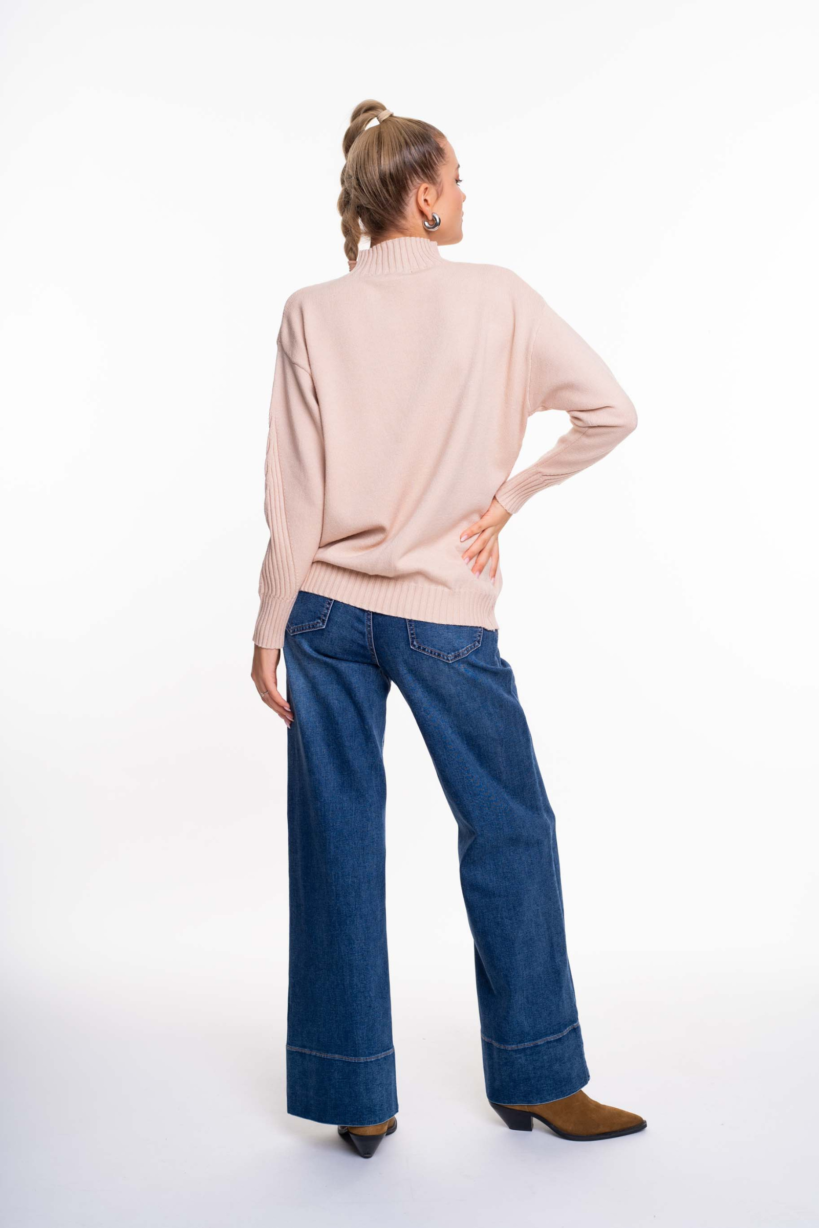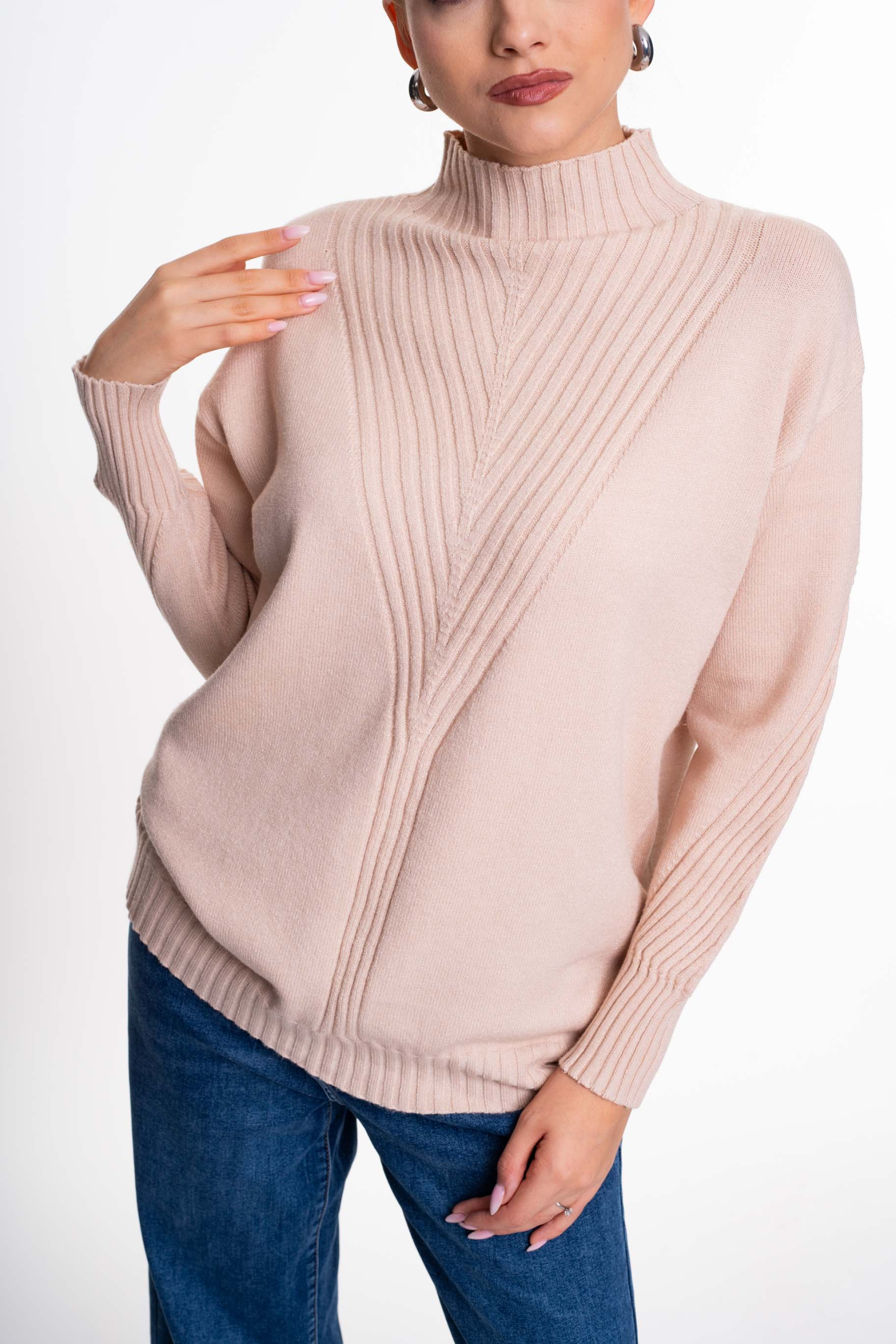 Vékony, kötött anyagú, lezser szabásvonalú pulóver emelt nyakrésszel, alján kis fém márkajelzéssel.