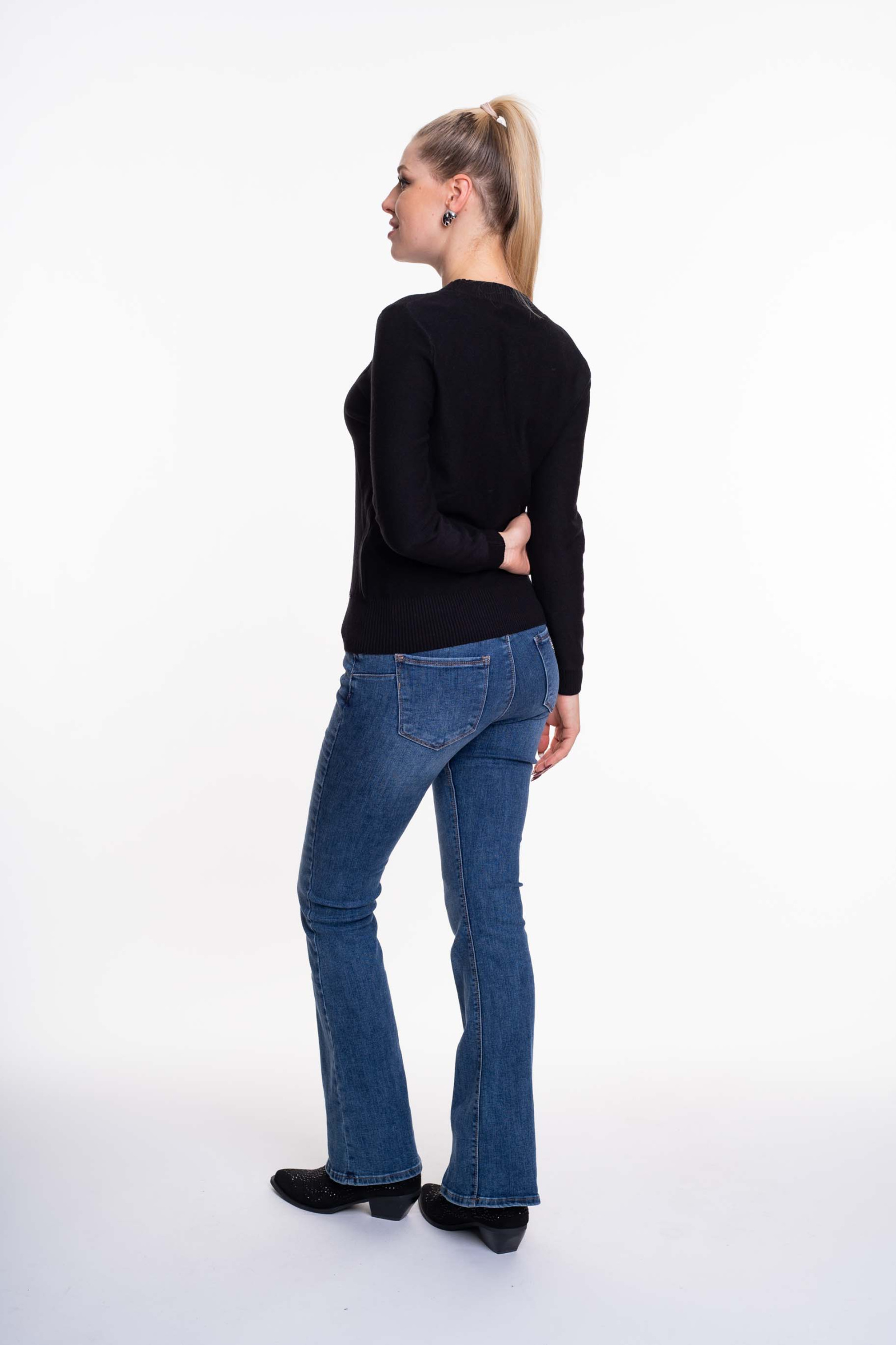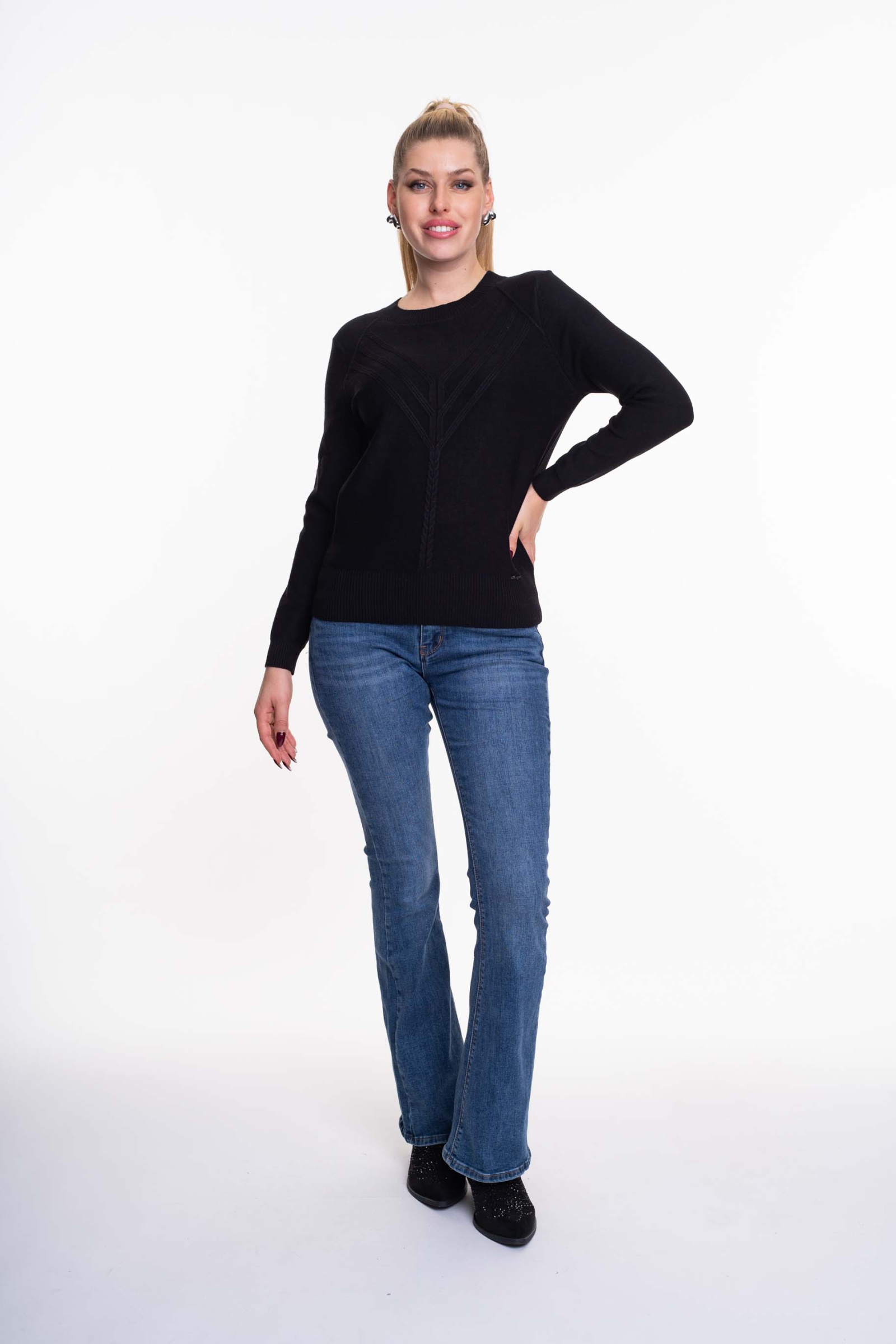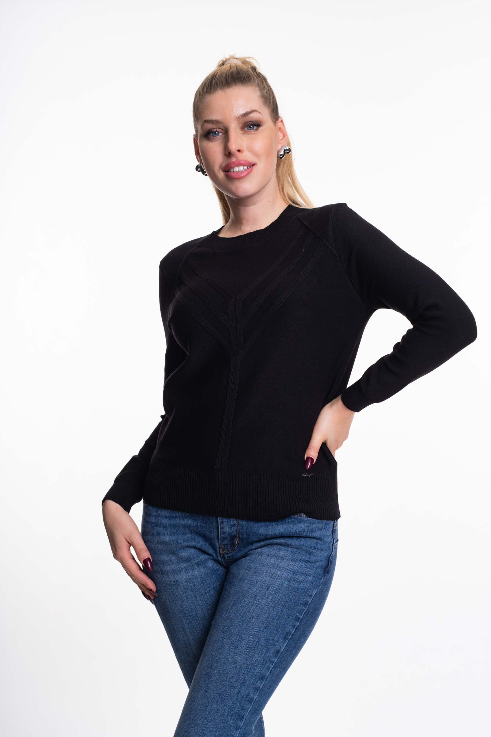 Vékony kötött anyagból készült pulóver anyagában kötött mintával, kis fém márkajelzéssel.