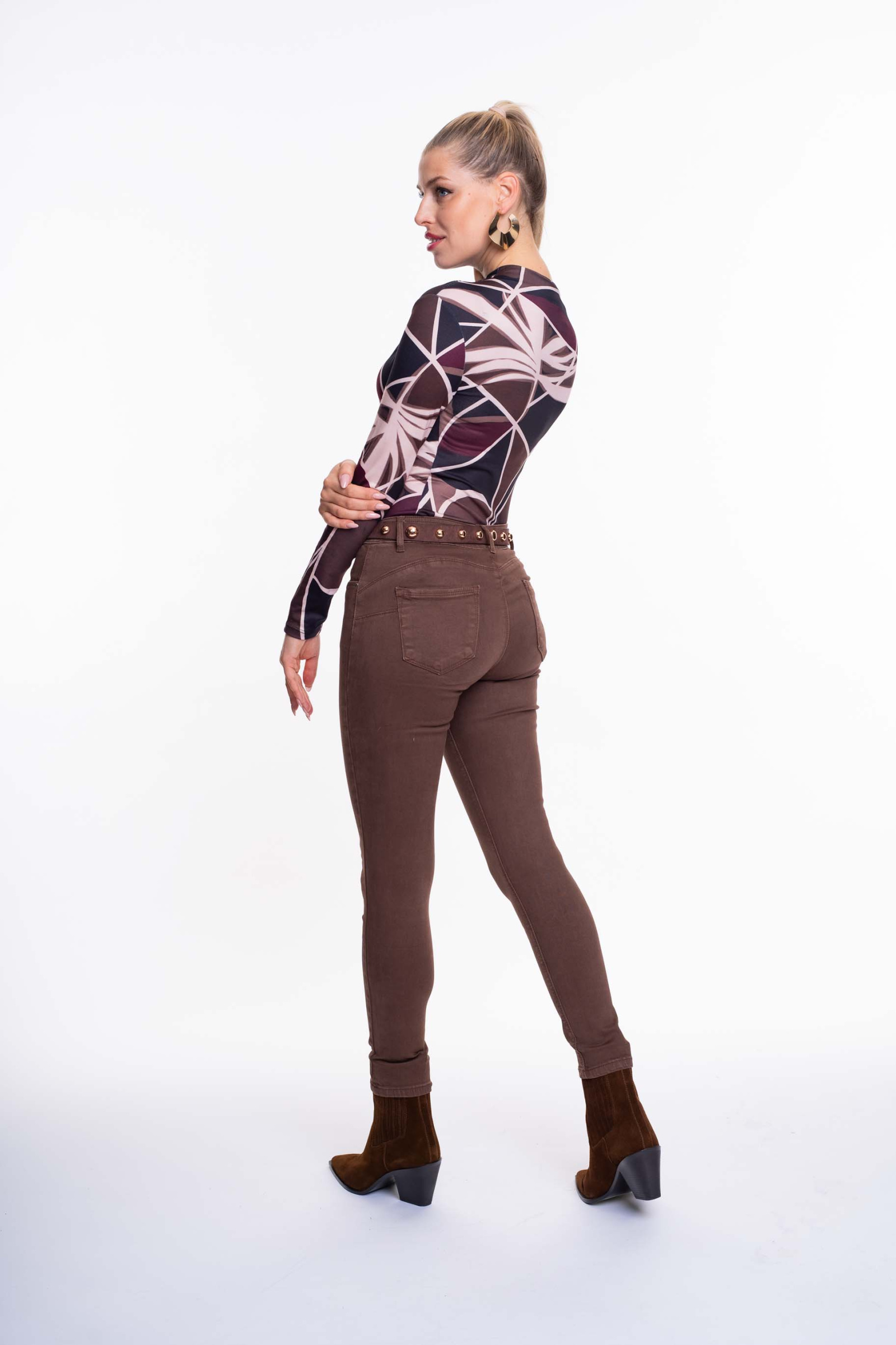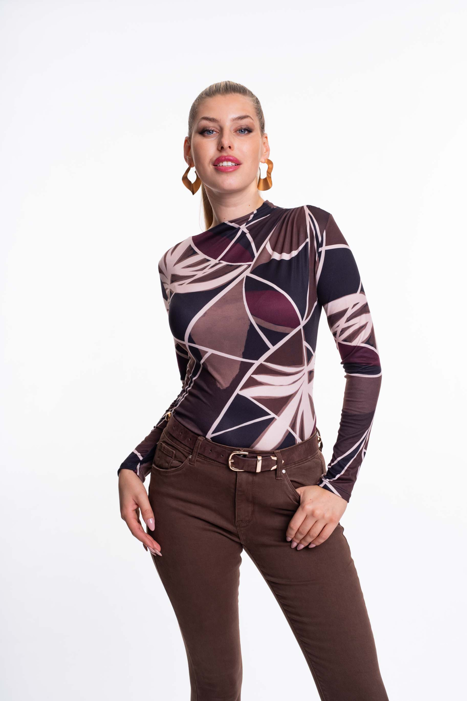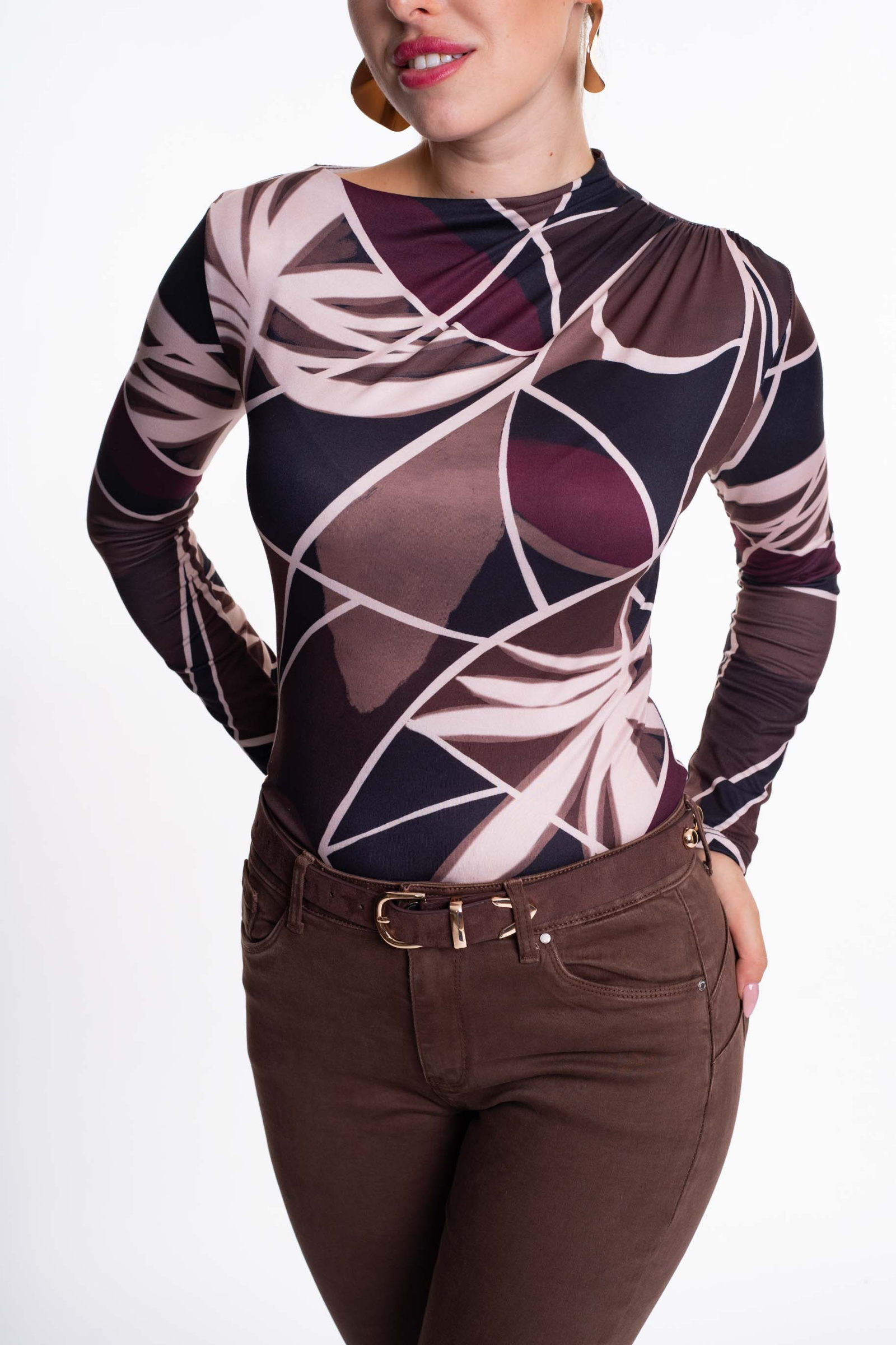 Elasztikus anyagból készült emelt nyakú felső, aszimmetrikus eleje megoldással, kis fém márkajelzéssel.