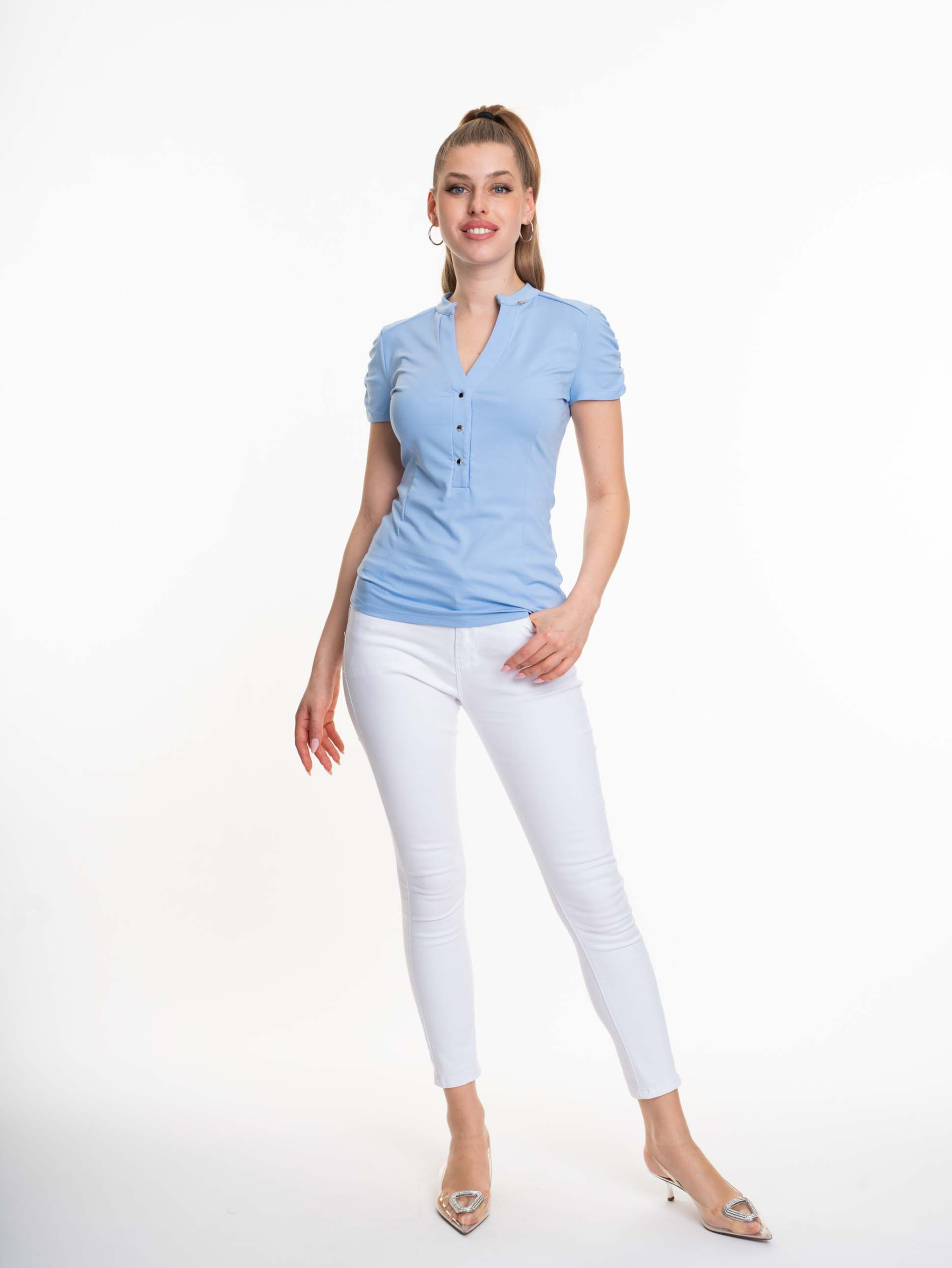 Elasztikus anyagból készült karcsúsított fazonú felső, patentos záródással, kis fém márkajelzéssel.
