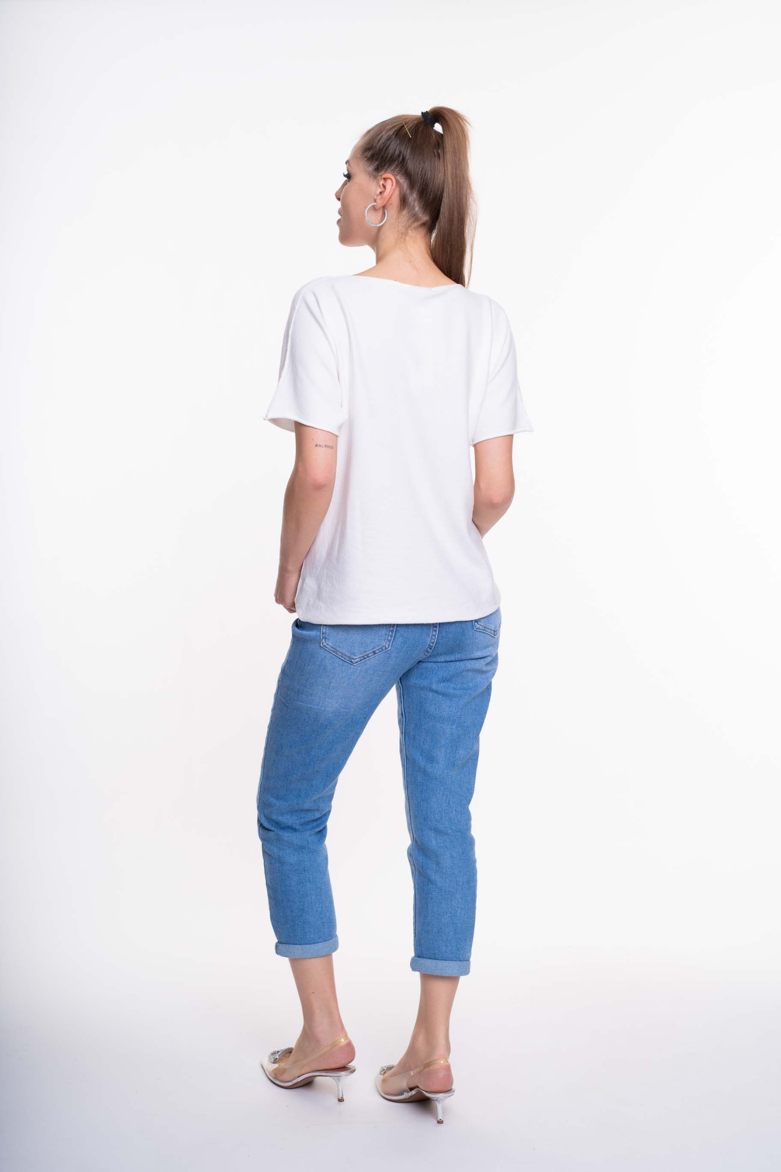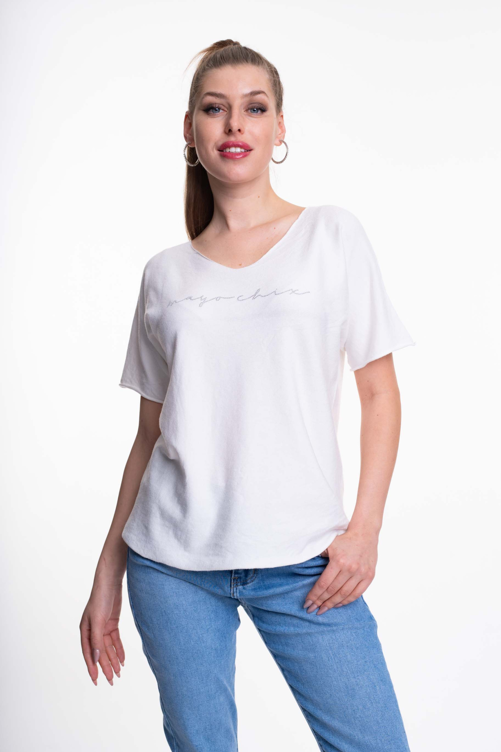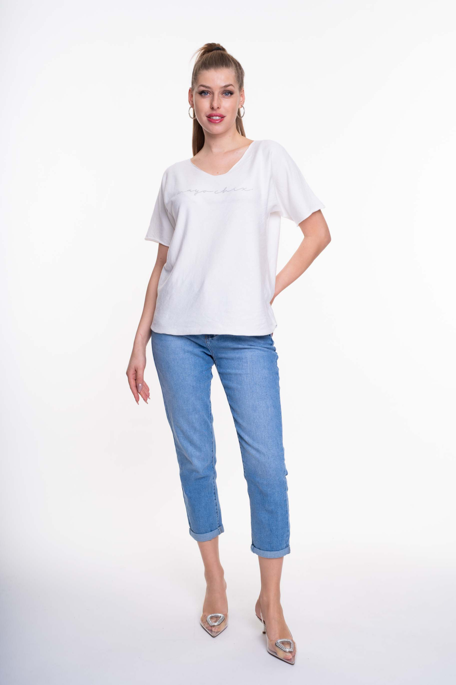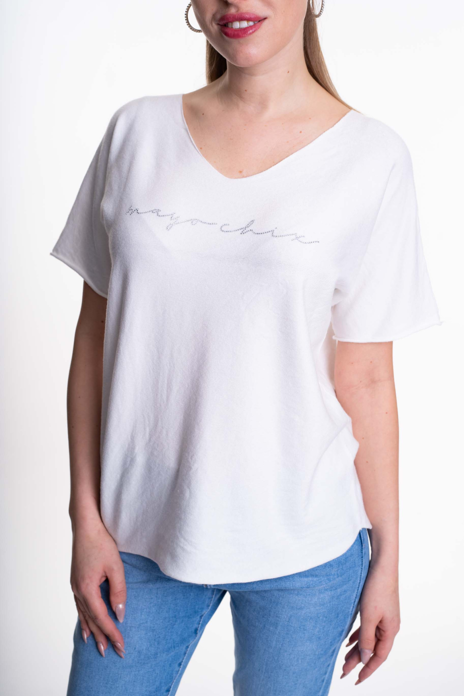 Vékony, puha kötött anyagból készült lezser fazonú felső, strasszköves márkajelzéssel.