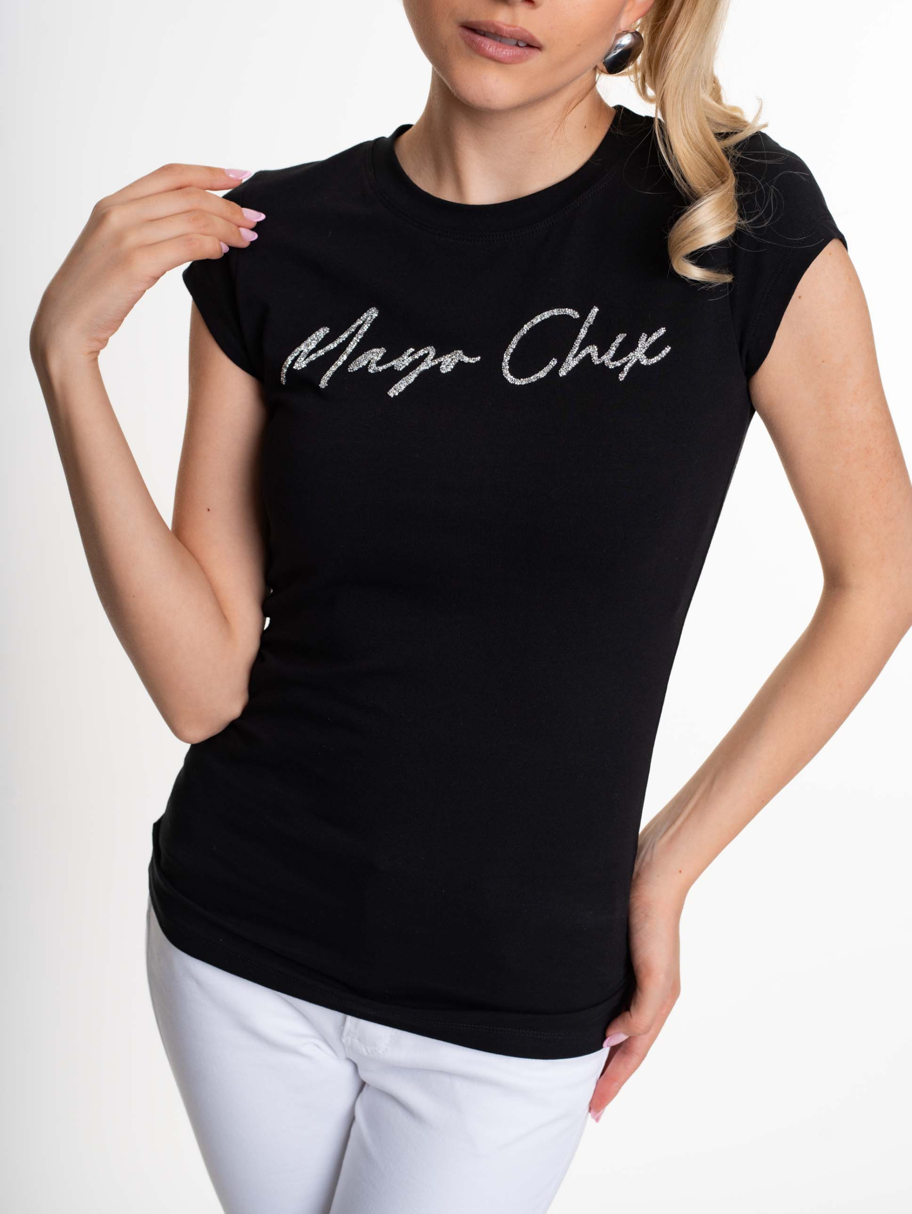 Elasztikus pamut anyagból készült sportos fazonú felső, strasszköves matrica nyomott díszitéssel.