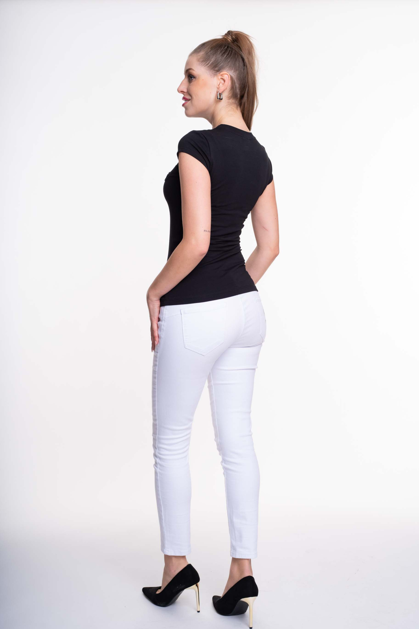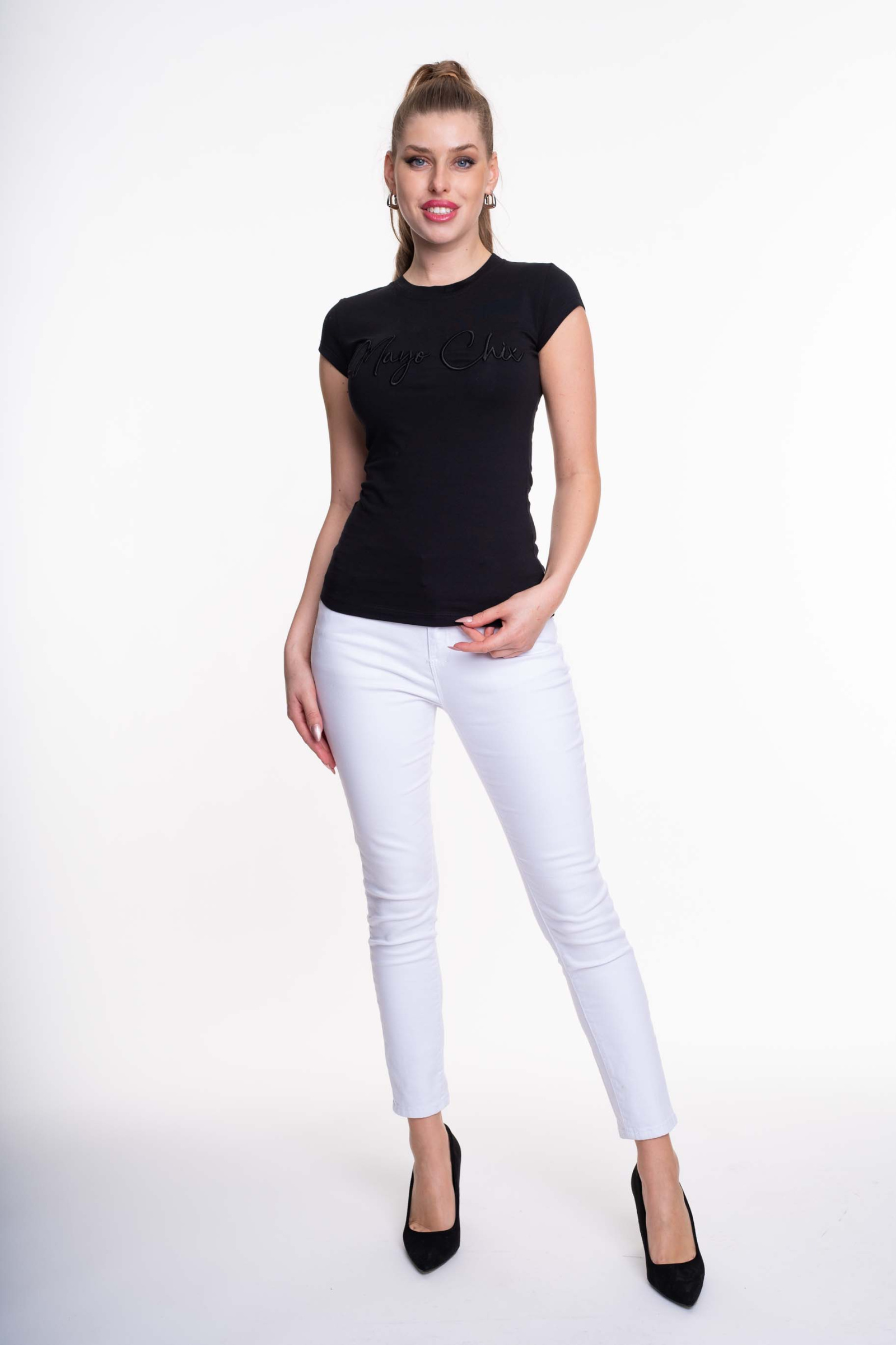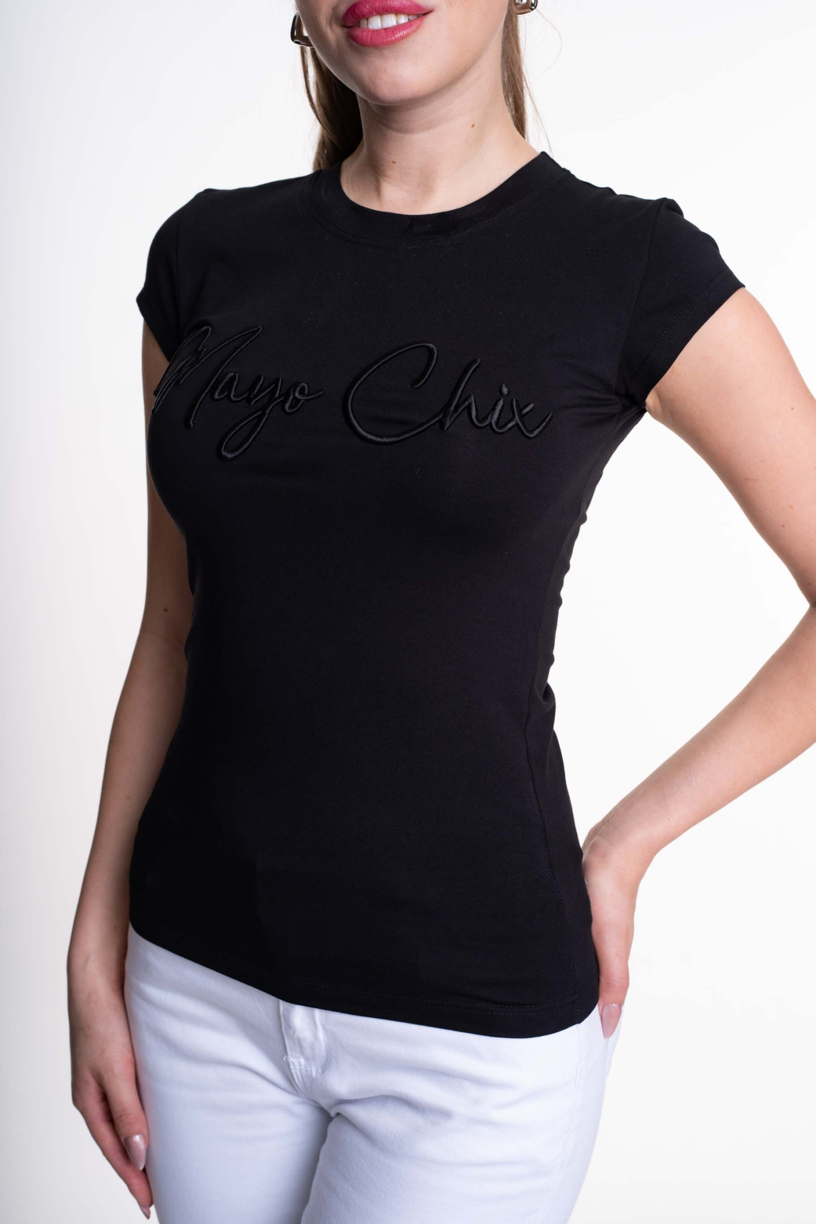 Elasztikus pamut anyagból készült, sportos fazonú felső, hímzett márkajelzéssel.