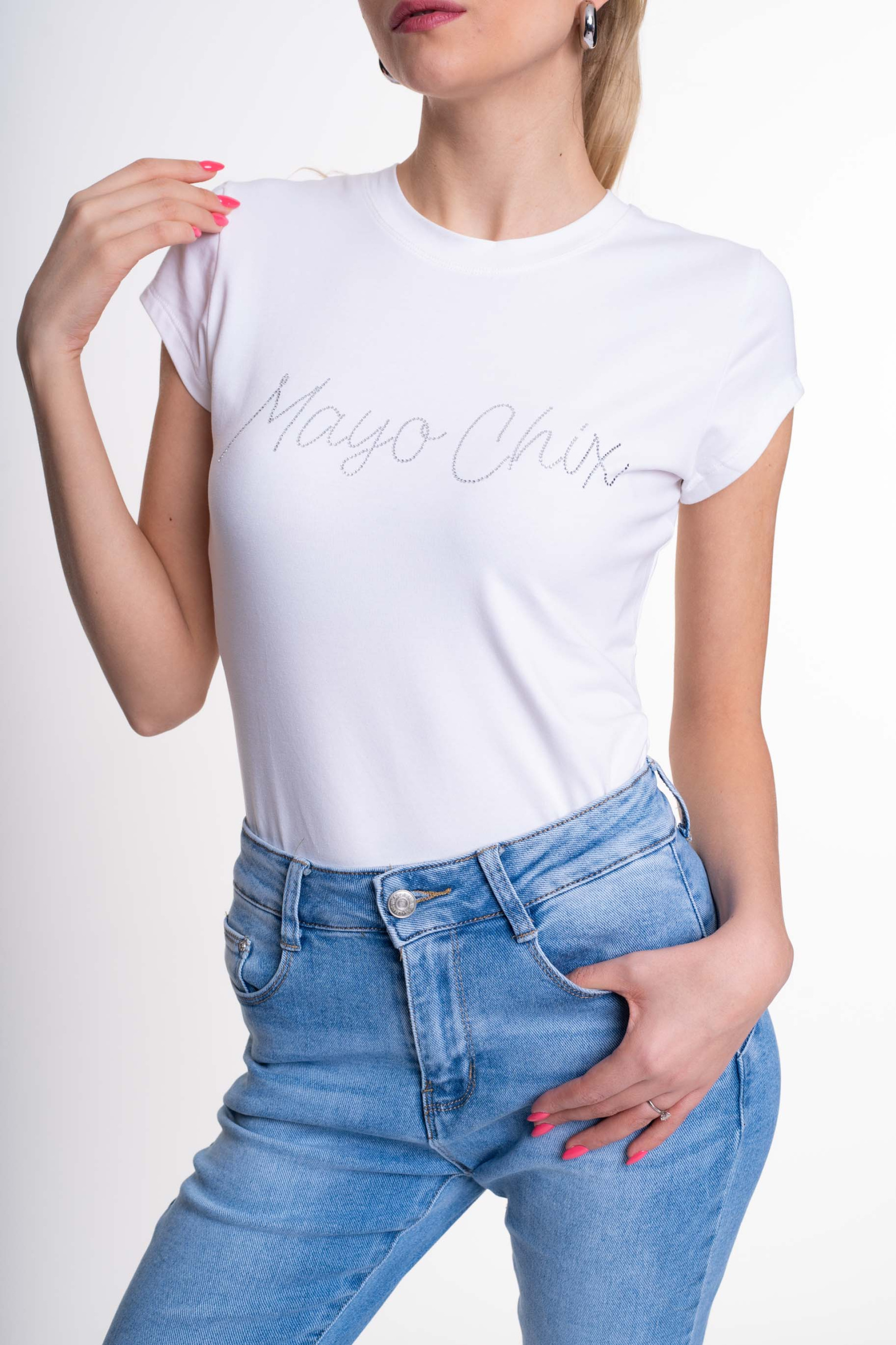 Elasztikus pamut anyagból készült sportos fazonú felső, strasszköves díszitéssel.