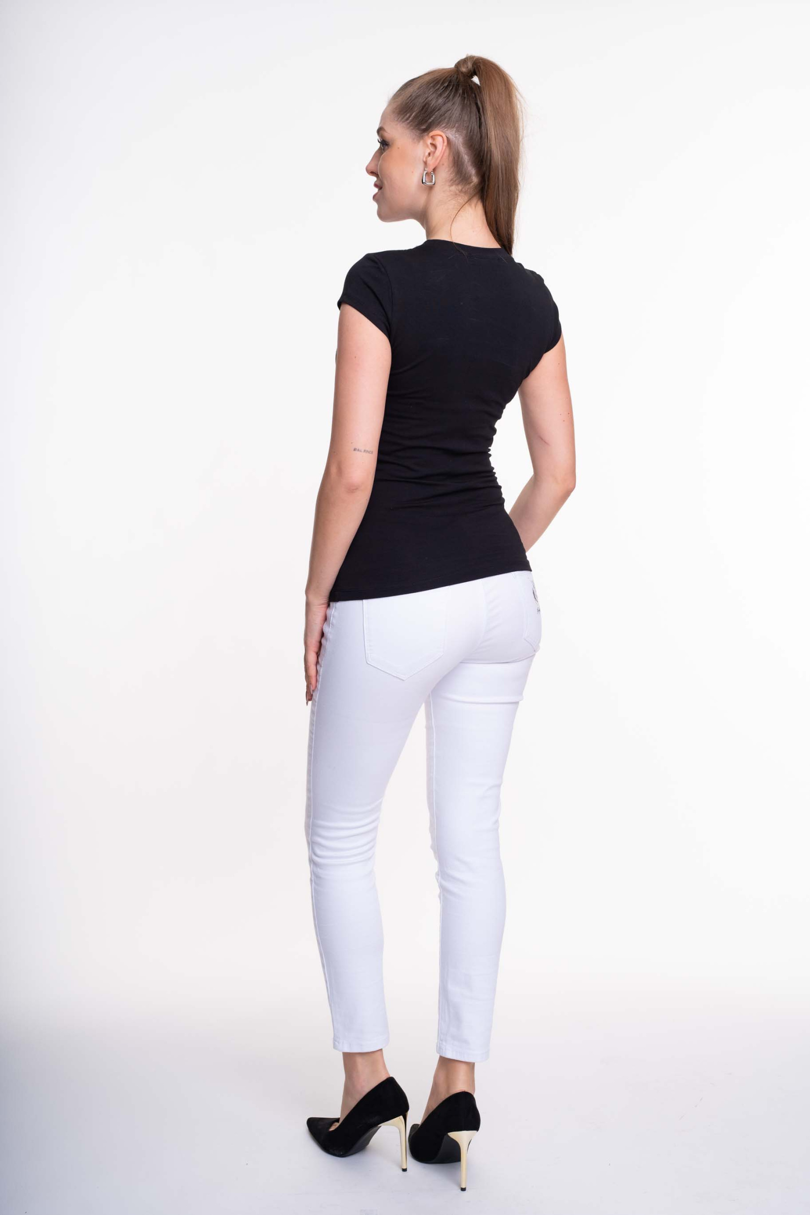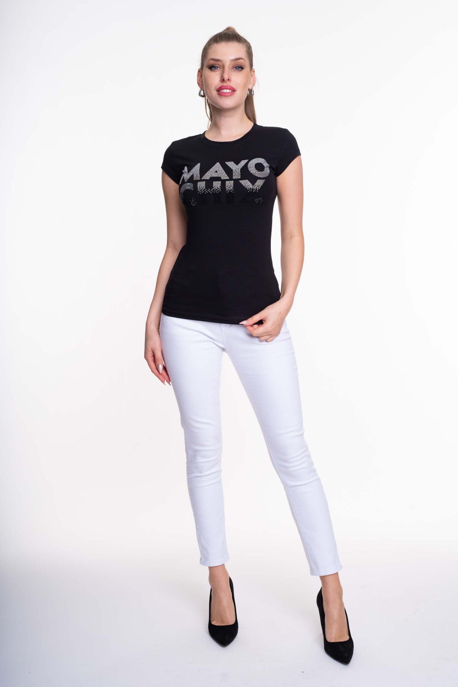 Elasztikus anyagból készült sportos fazonú felső, straszköves márkajelzéssel.