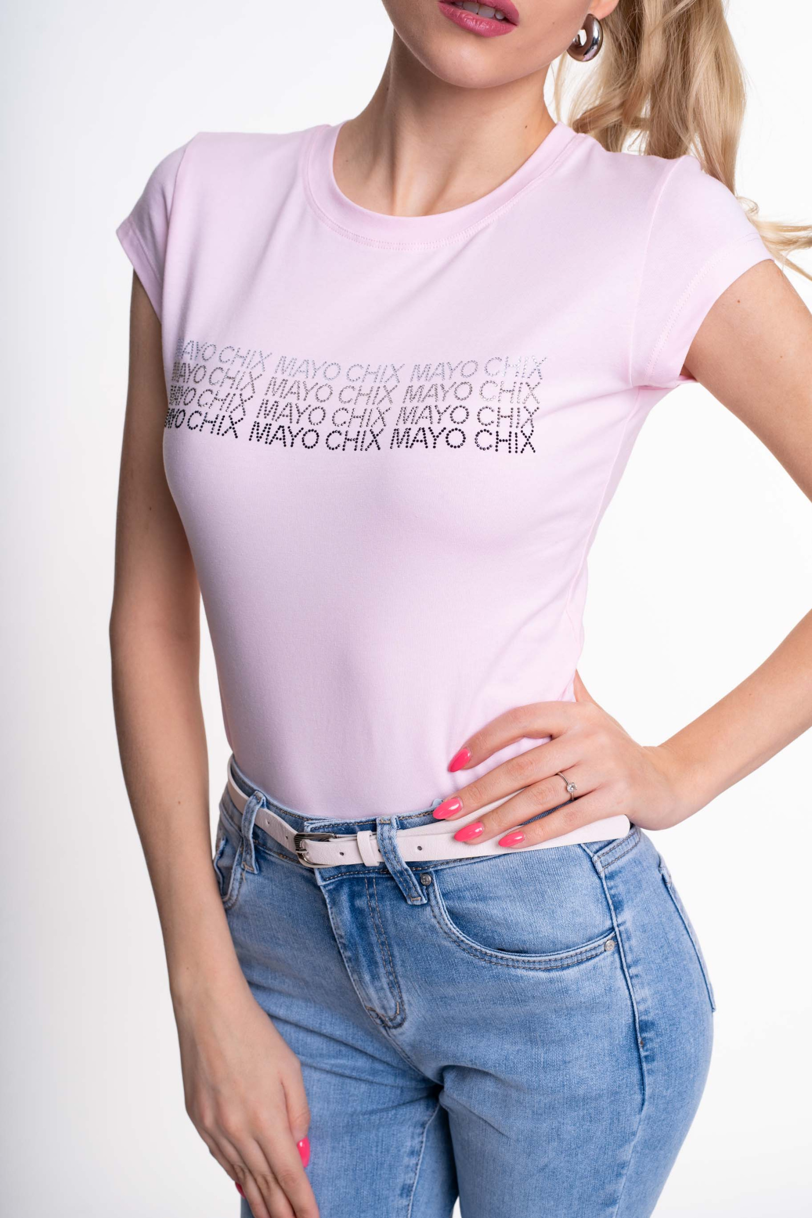 - Elasztikus pamut anyagból készült sportos fazonú felső, strasszköves díszitéssel.Anyaga: 100% Pamut