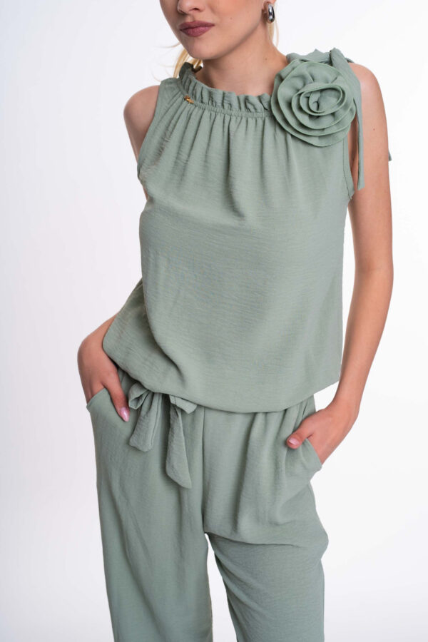 Enyhén elasztikus krepp anyagból készült zsebes overall vállán masnival, gumis derekán saját anyagából készült megkötővel, elején kis fém márkajelzéssel és bross kiegészítővel.