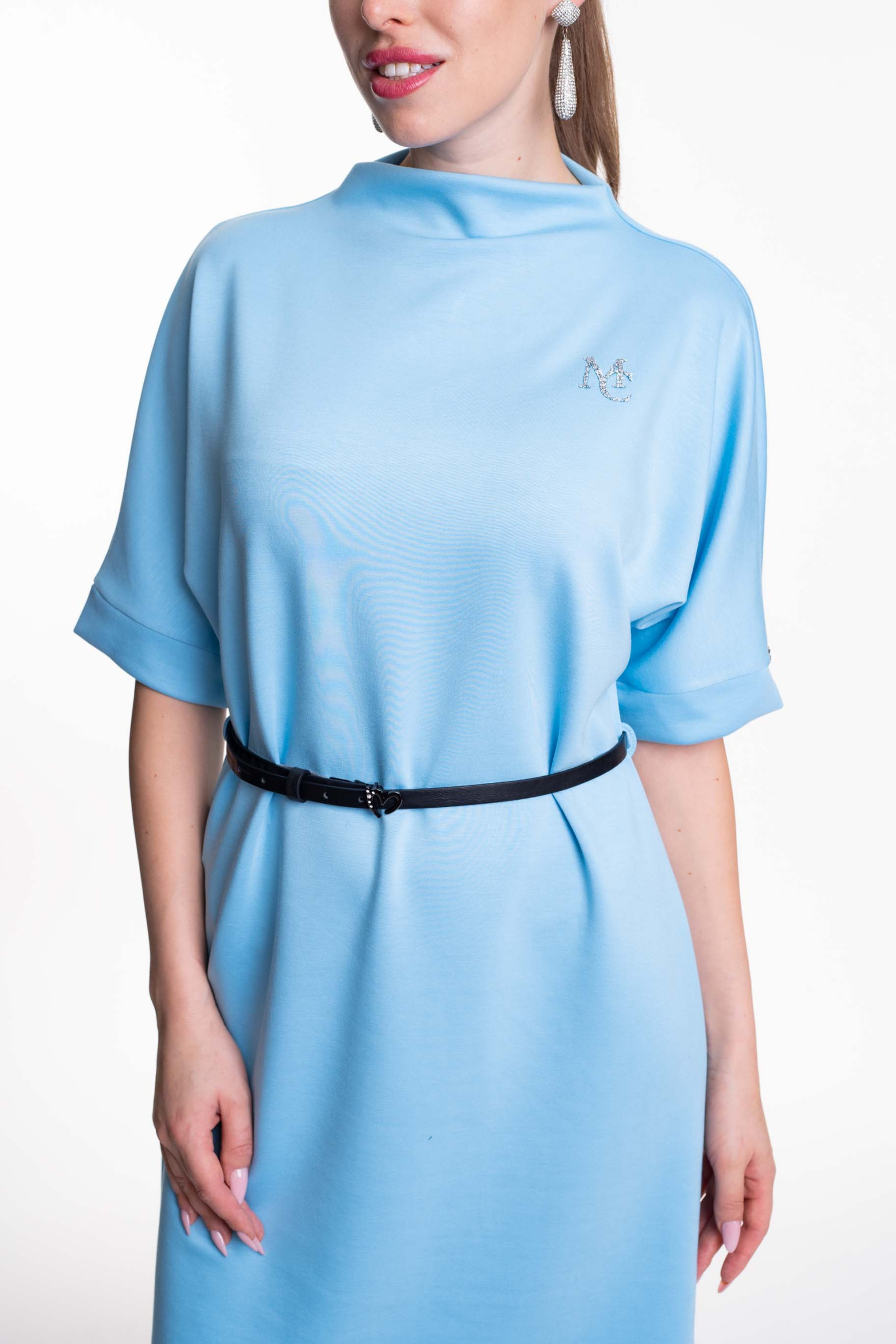 Elasztikus anyagból készült, lezser szabásvonalú, emelt nyakú ruha, öv kiegészítővel, strasszköves matricanyomott márkajelzéssel.