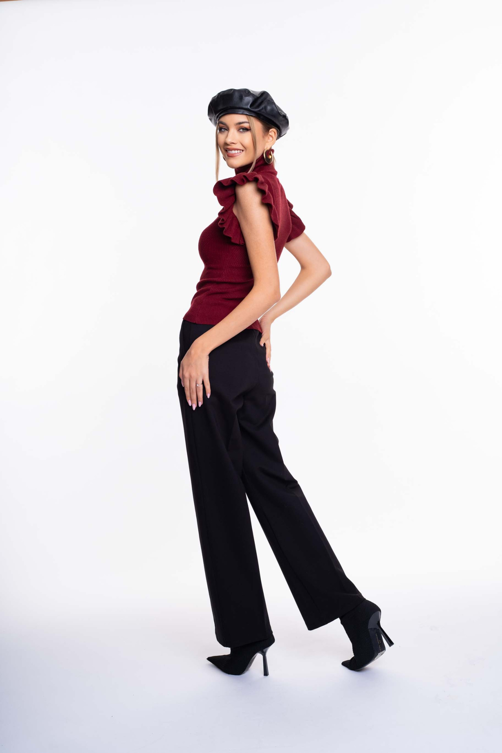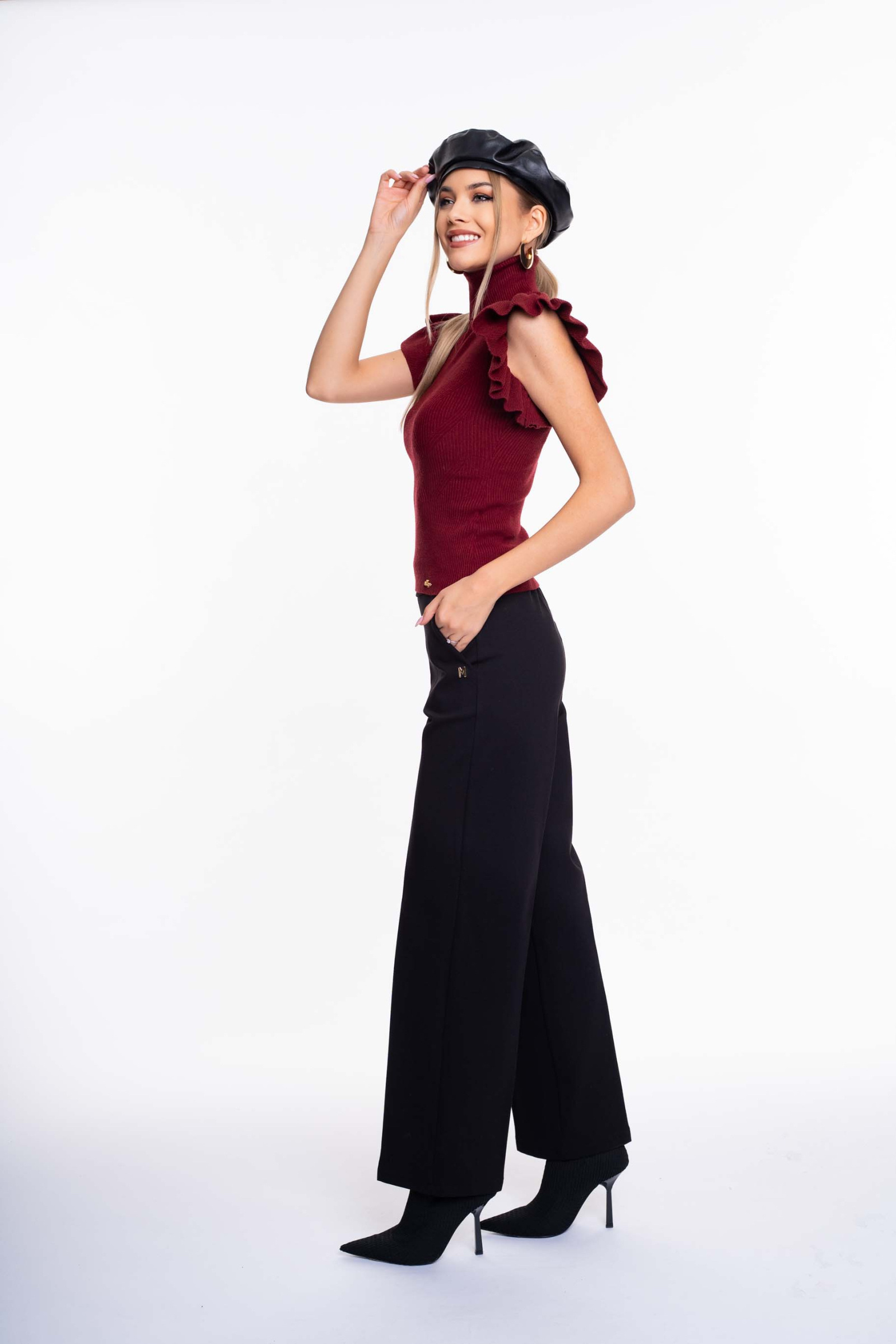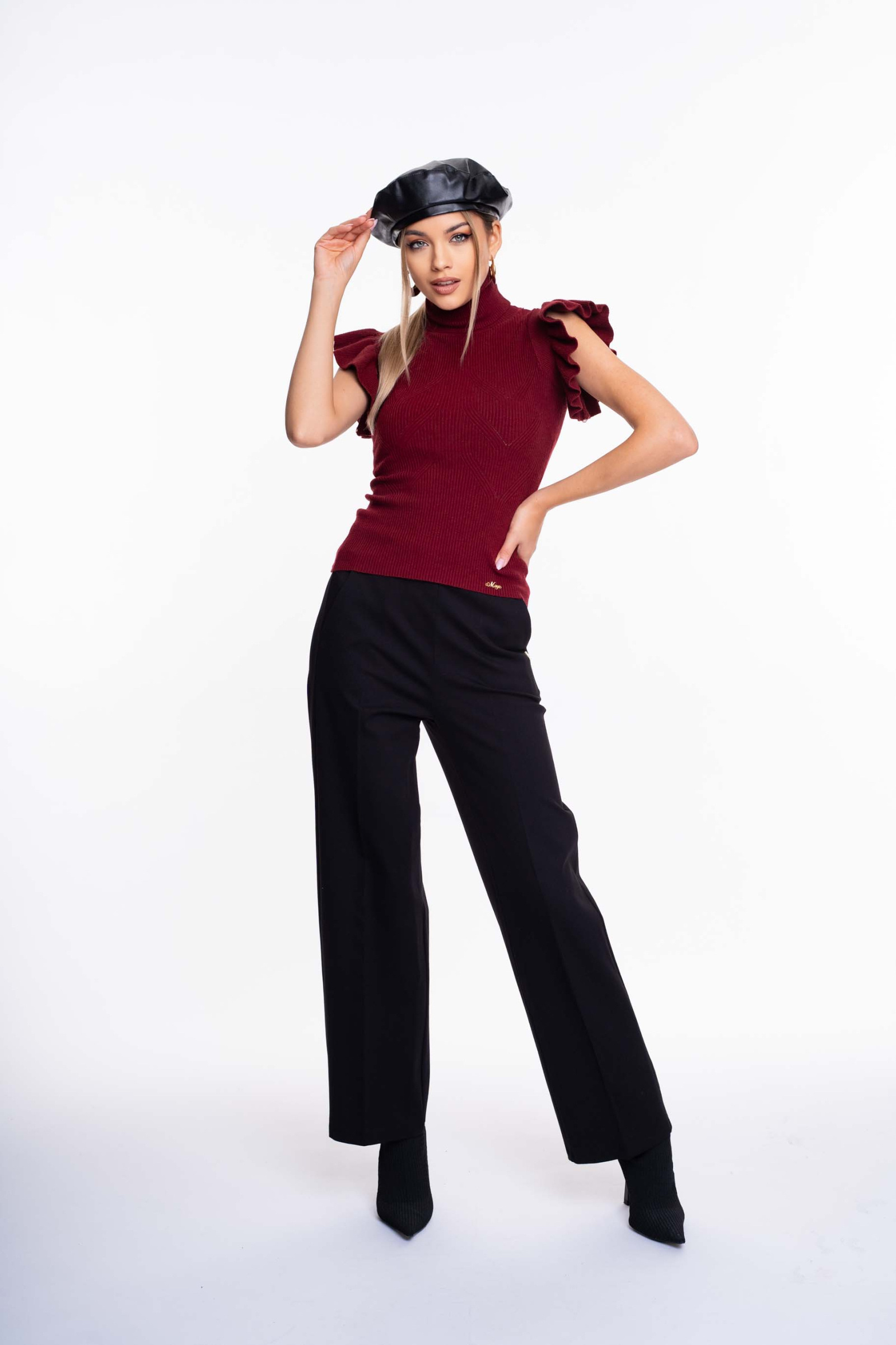 Bordás kötött anyagú, fodros ujjú pulóver, anyagában kötött mintázattal, kis fém márkajelzéssel.