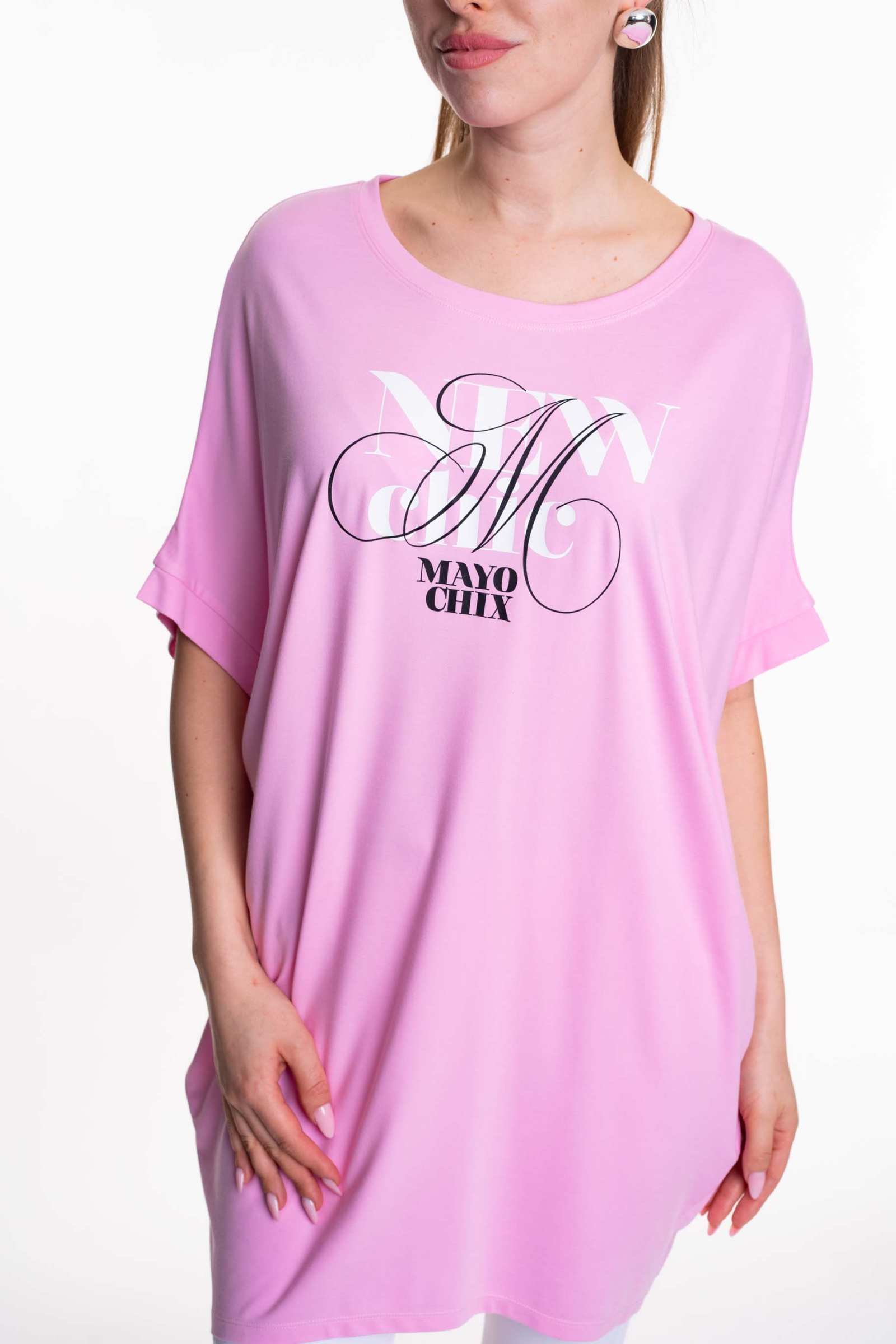 Elasztikus anyagból készült, lezser szabású tunika íves aljavonallal, matricanyomott díszítéssel.