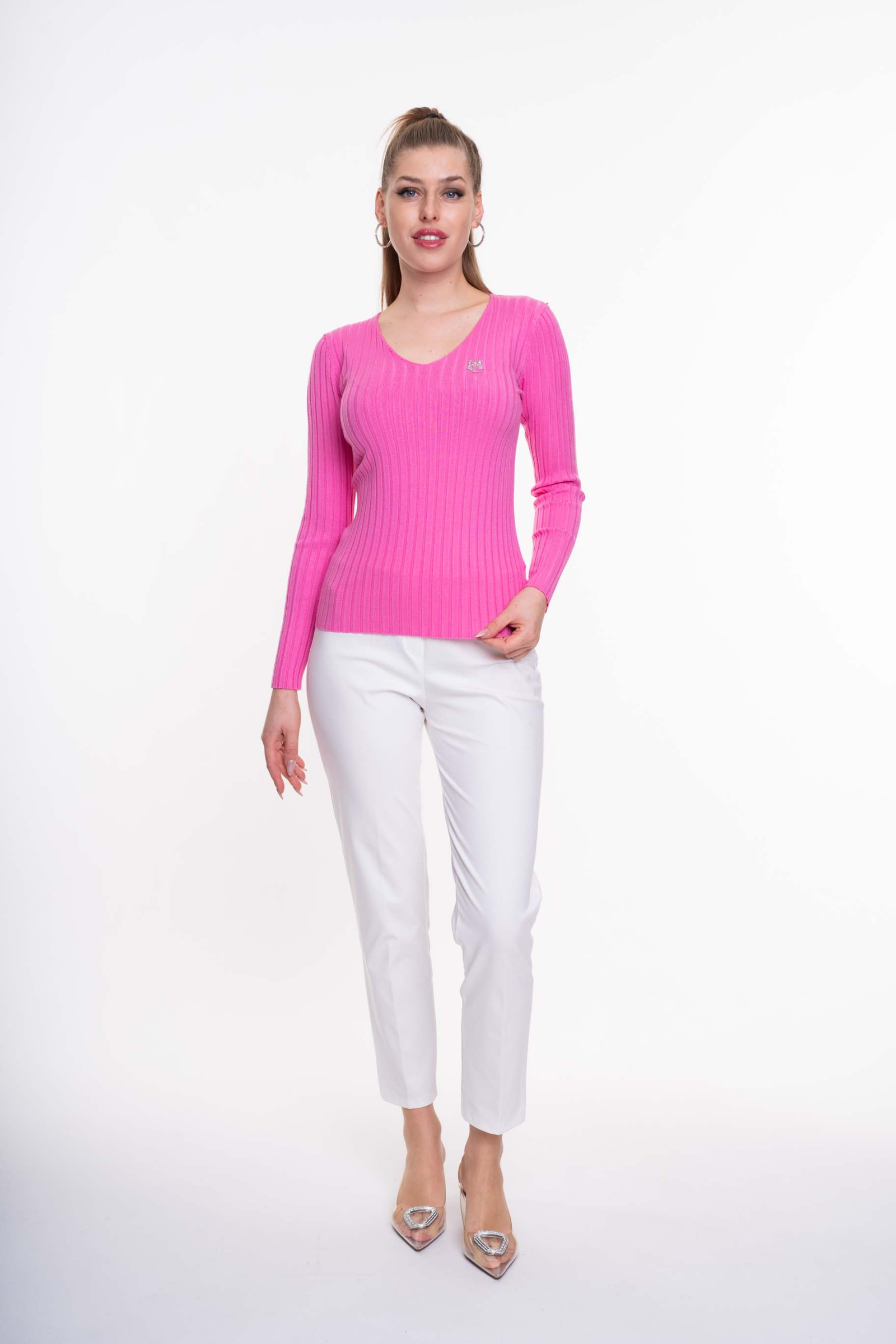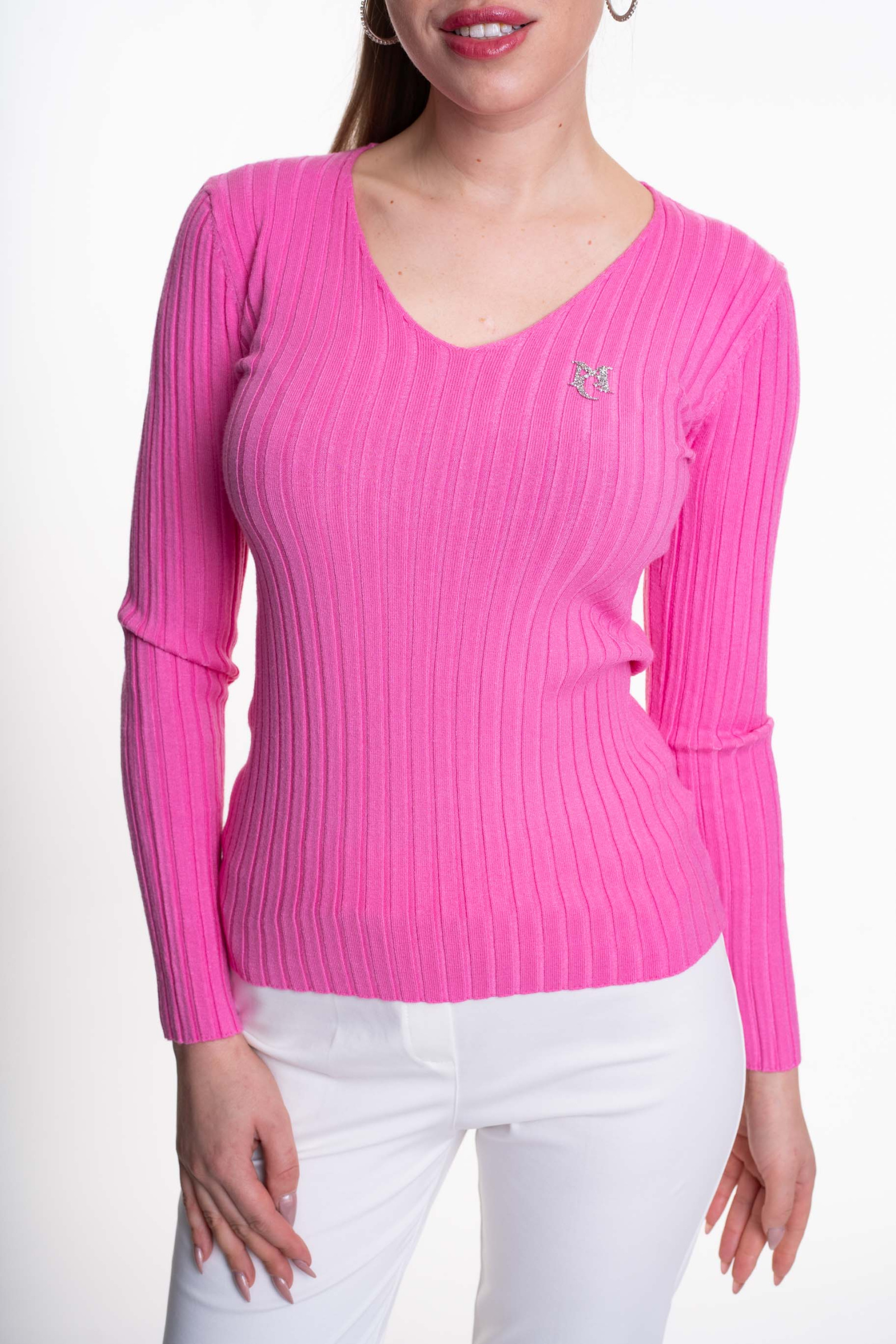 Vékony, bordás kötött anyagú pulóver V nyakkivágással, strasszköves matrica márkajelzéssel.